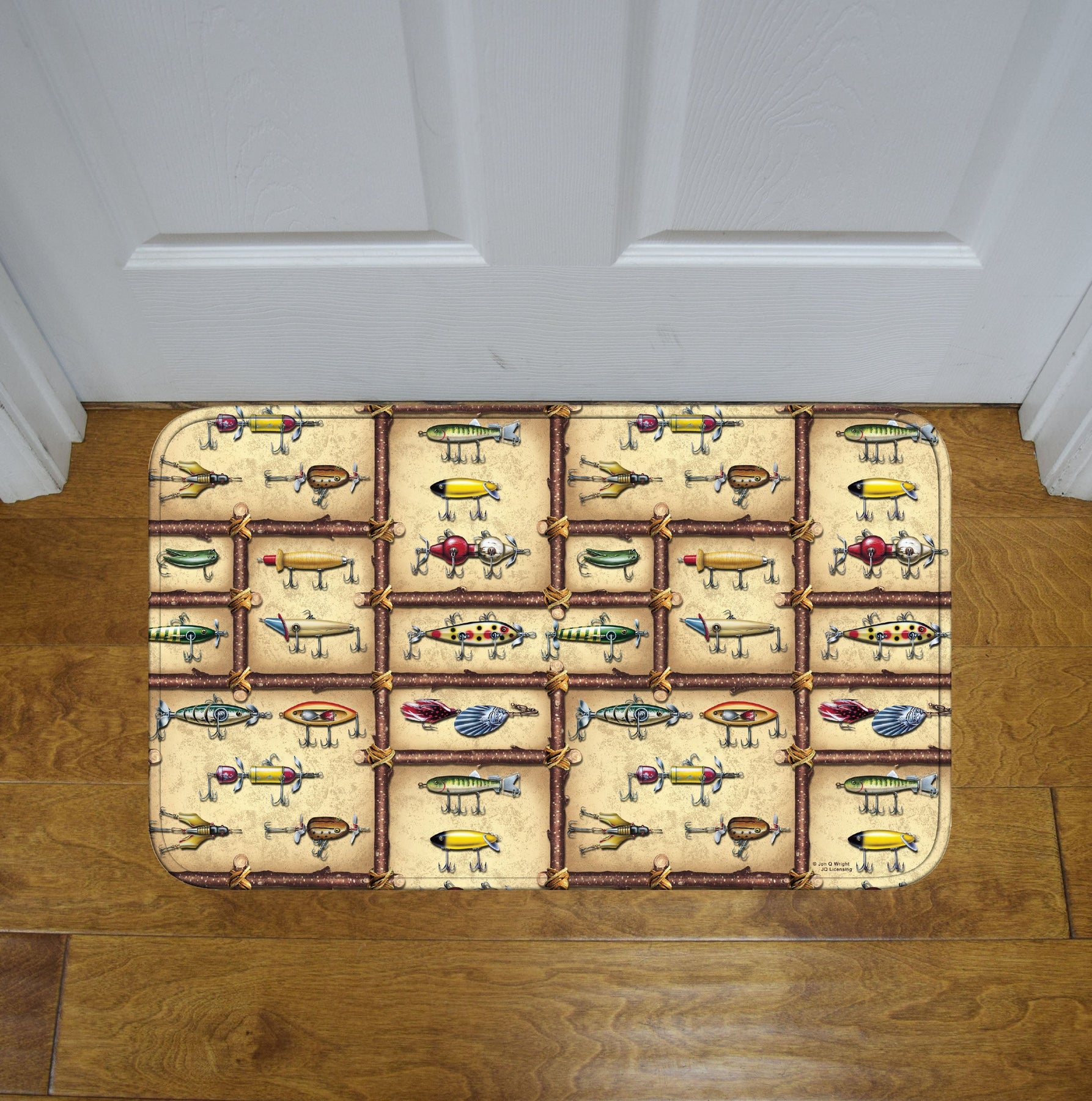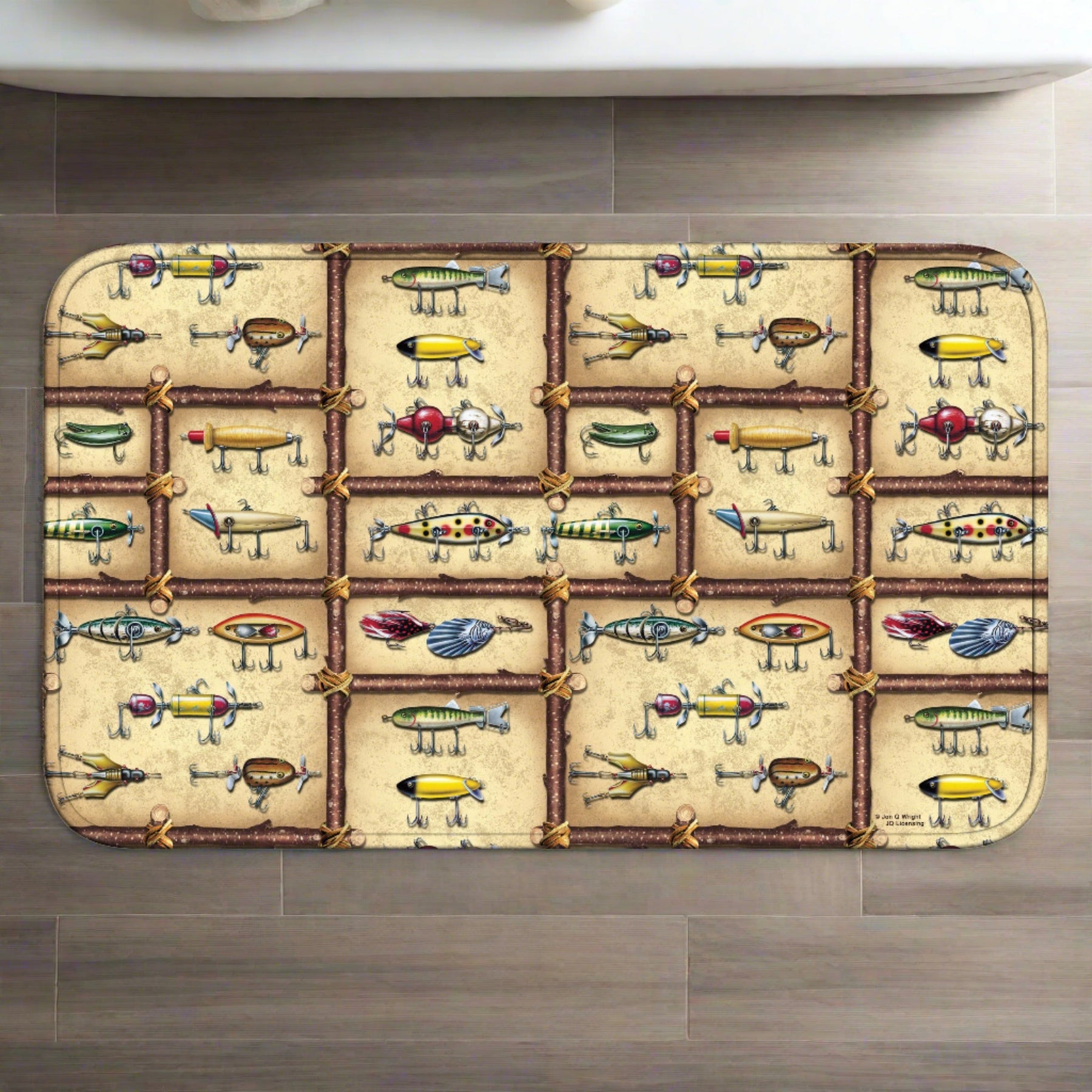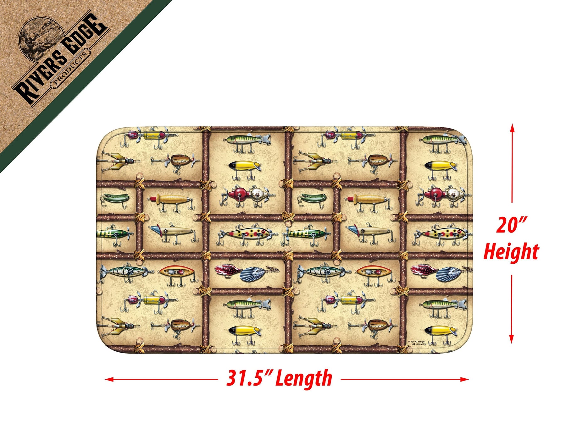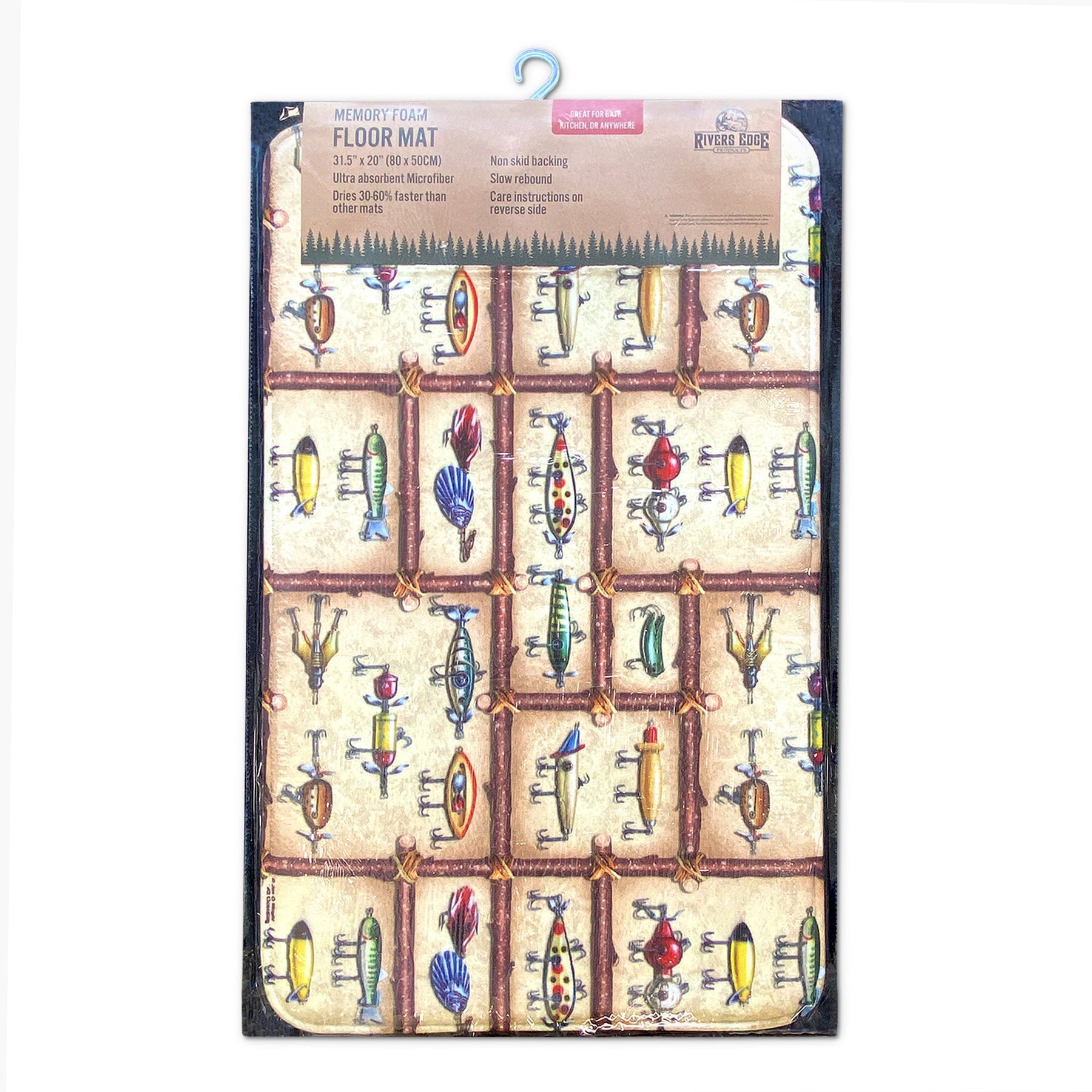 This memory foam mat from River's Edge Products showcases a variety of antique fishing lures. Great addition to any bathroom or kitchen.