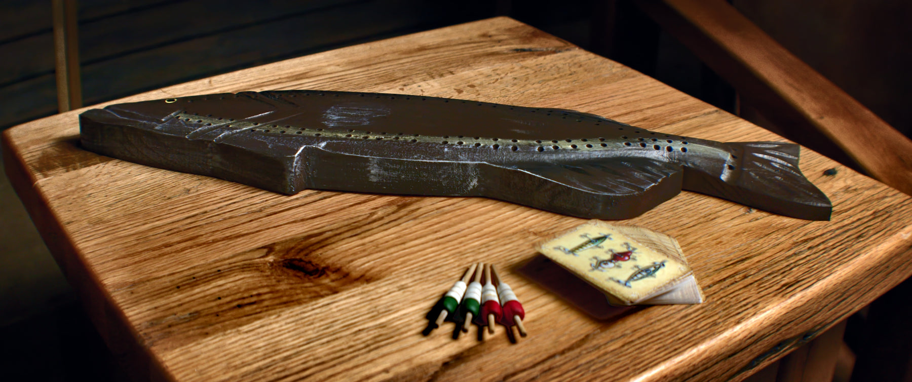 The Rivers Edge Products fish cribbage board is of real carved wood construction and hand painted with a beautiful antique finish. Antique lure of the past playing cards are included.