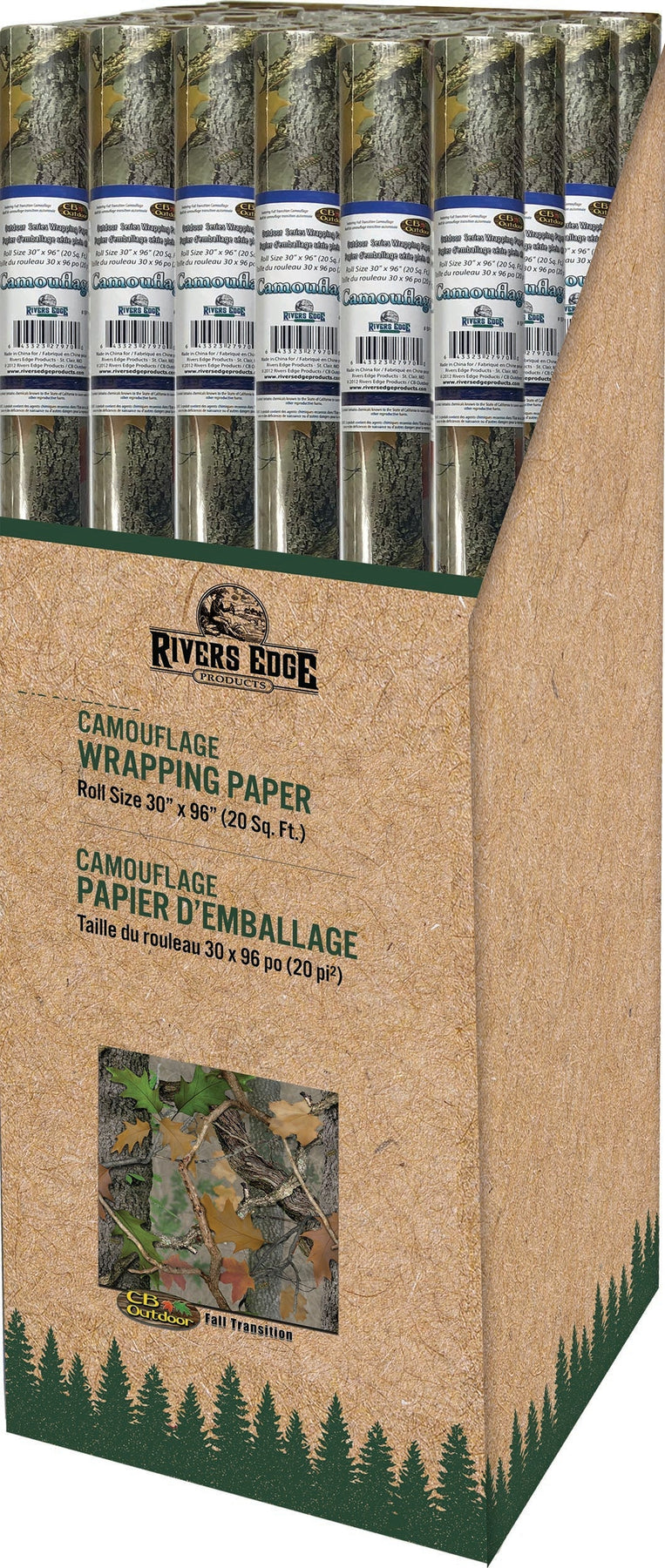 The green camo gift wrap from River's Edge Products features standard weight color paper for refilling your current wrapping paper displays. The pattern showcases Fall Transition camouflage courtesy of CB Outdoor. The wrapping paper dimensions are 28-inches by 80-inches.