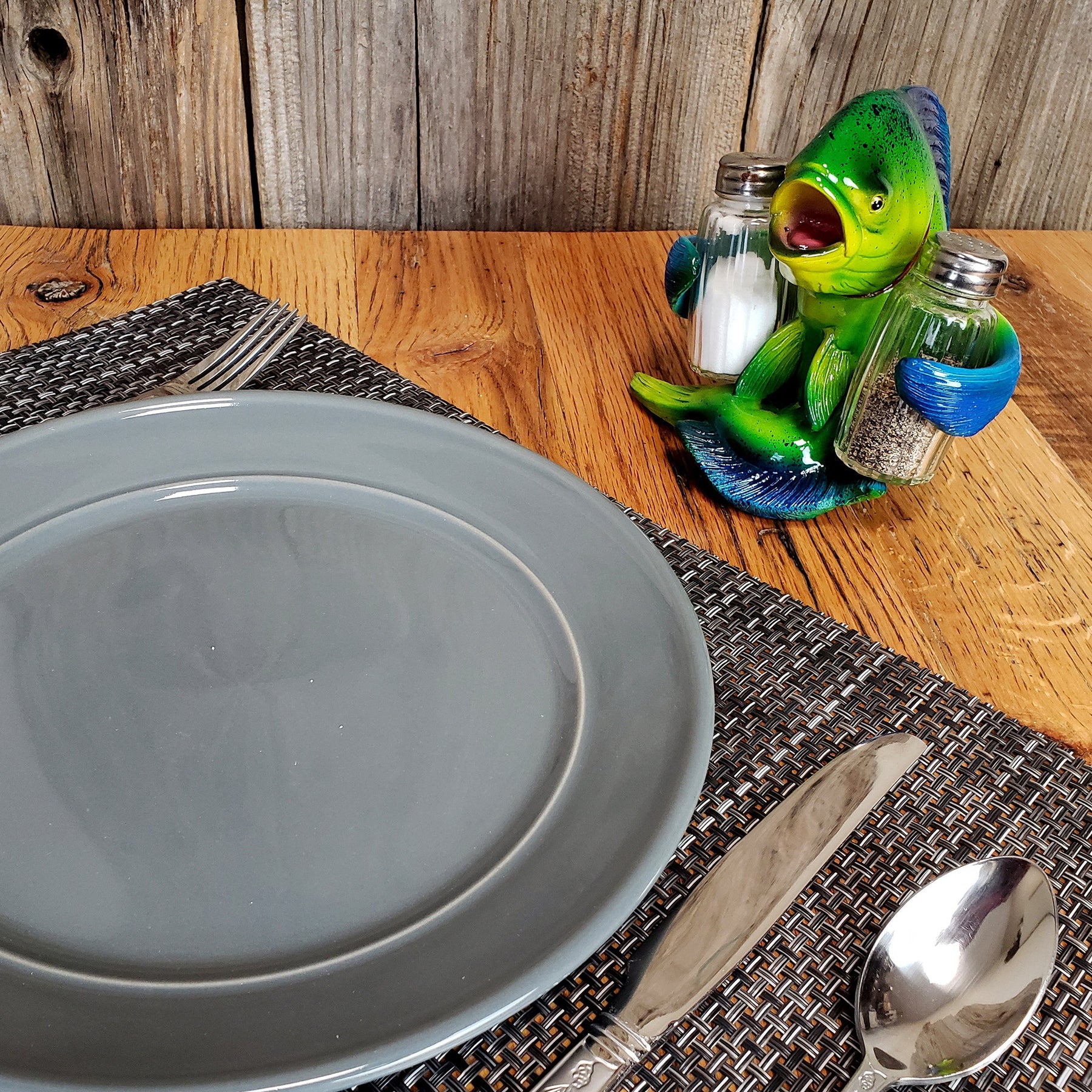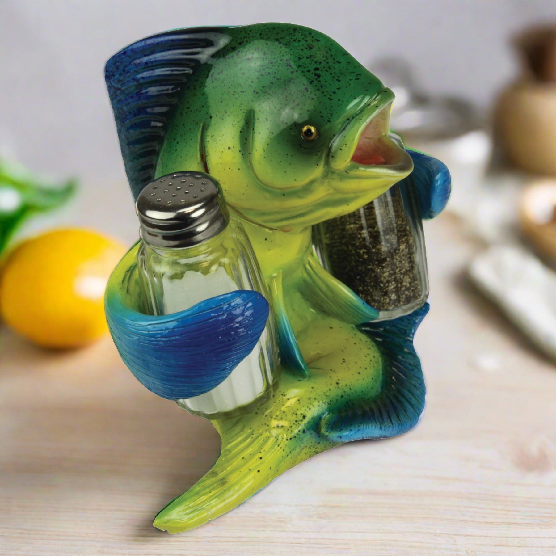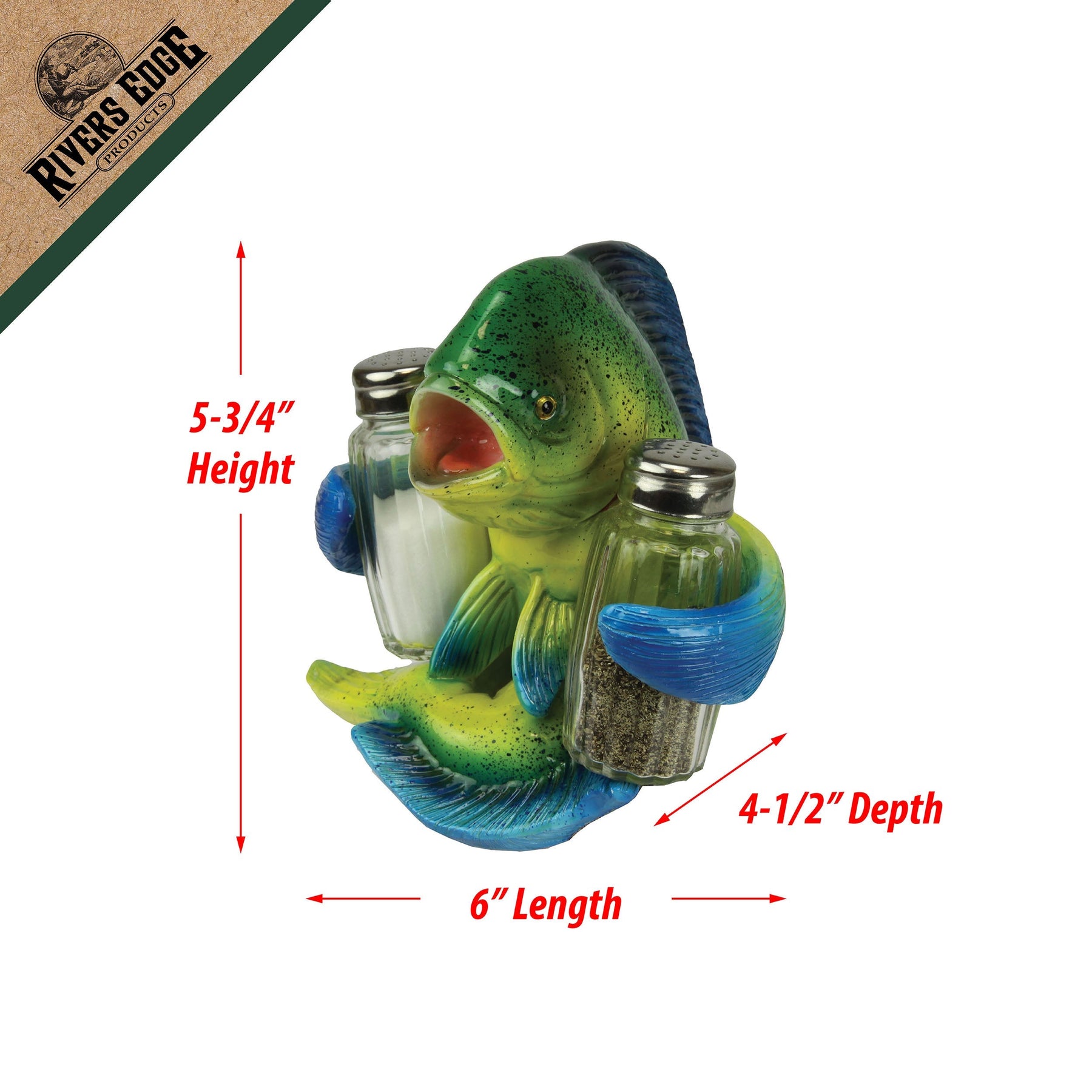 This mahi mahi salt and pepper shaker set from Rivers Edge Products will be a welcome addition to your dining room table. The glass salt and pepper shakers fit nicely into the fins of a cartoonish, openmouthed mahi mahi. The mahi mahi is hand-painted poly resin and is highly detailed and colorful. The shakers are made of clear glass so you'll never mistake salt for pepper when you season your food. The Mahi Mahi salt and pepper shakers will allow you to season your meal with style.