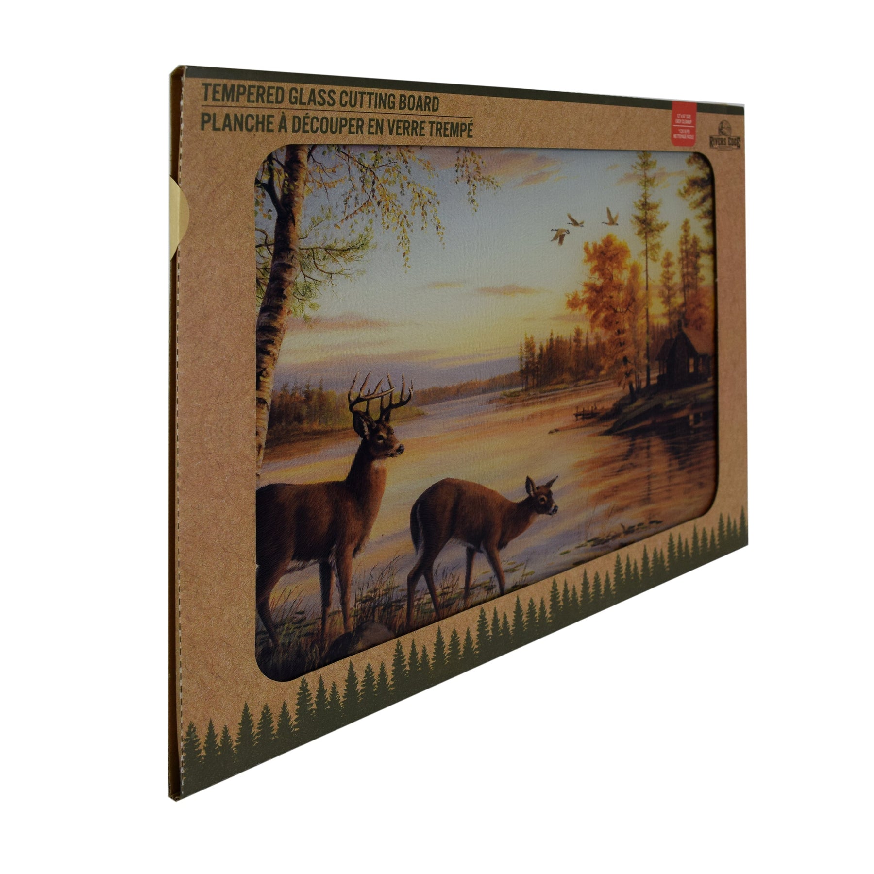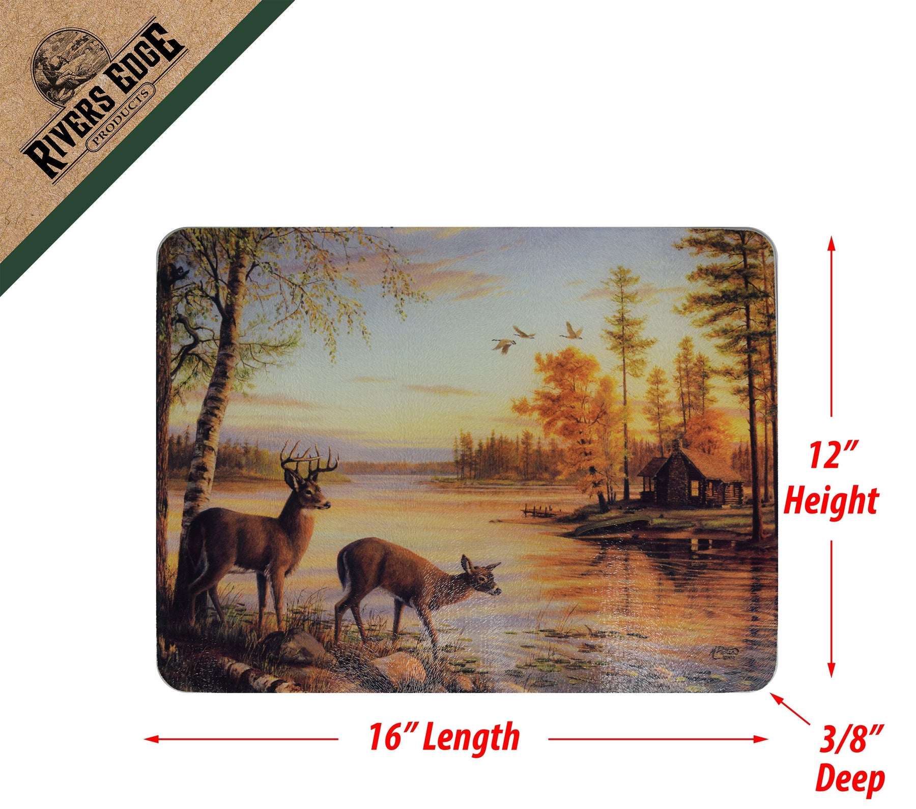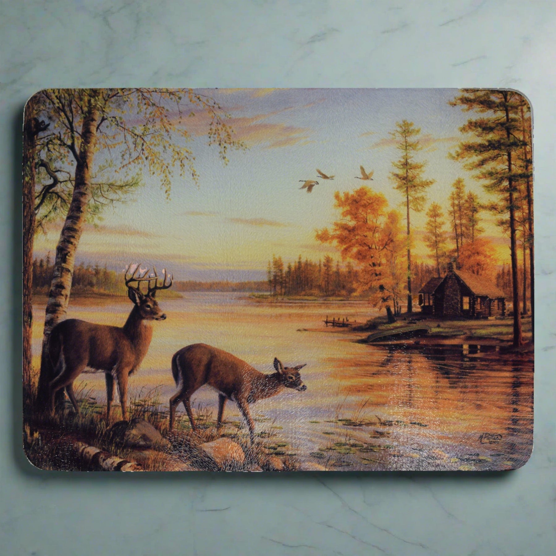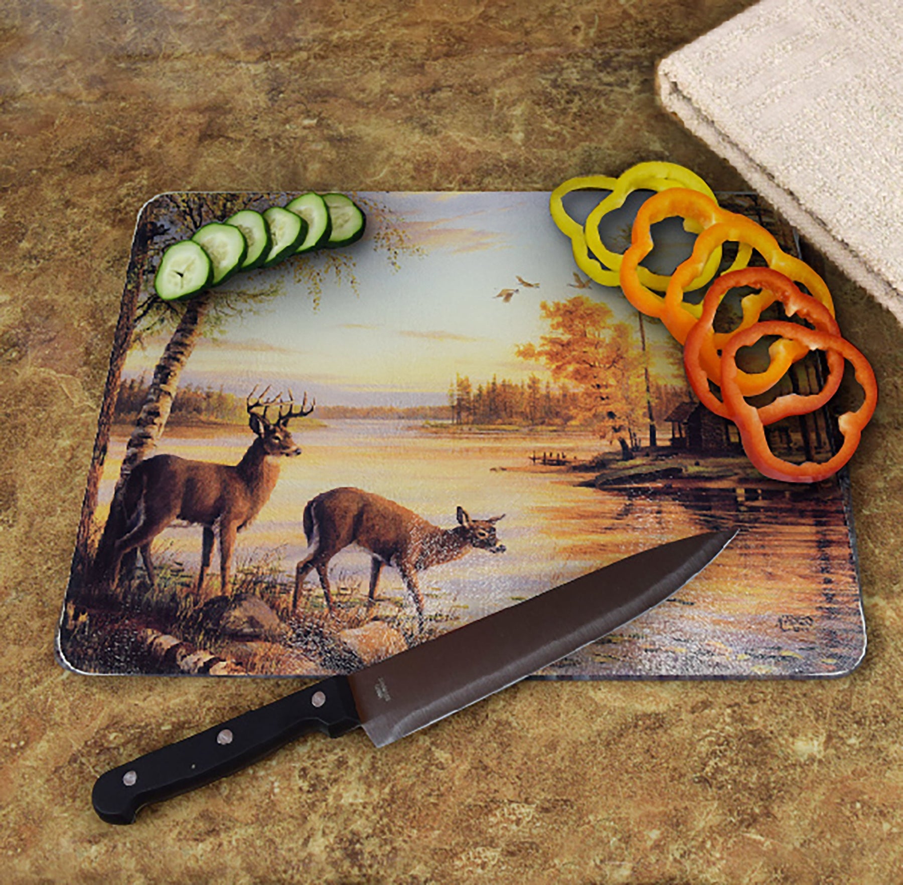 Quiet evening tempered glass cutting boards from Rivers Edge Products features deer next to a lake with a sunset background.