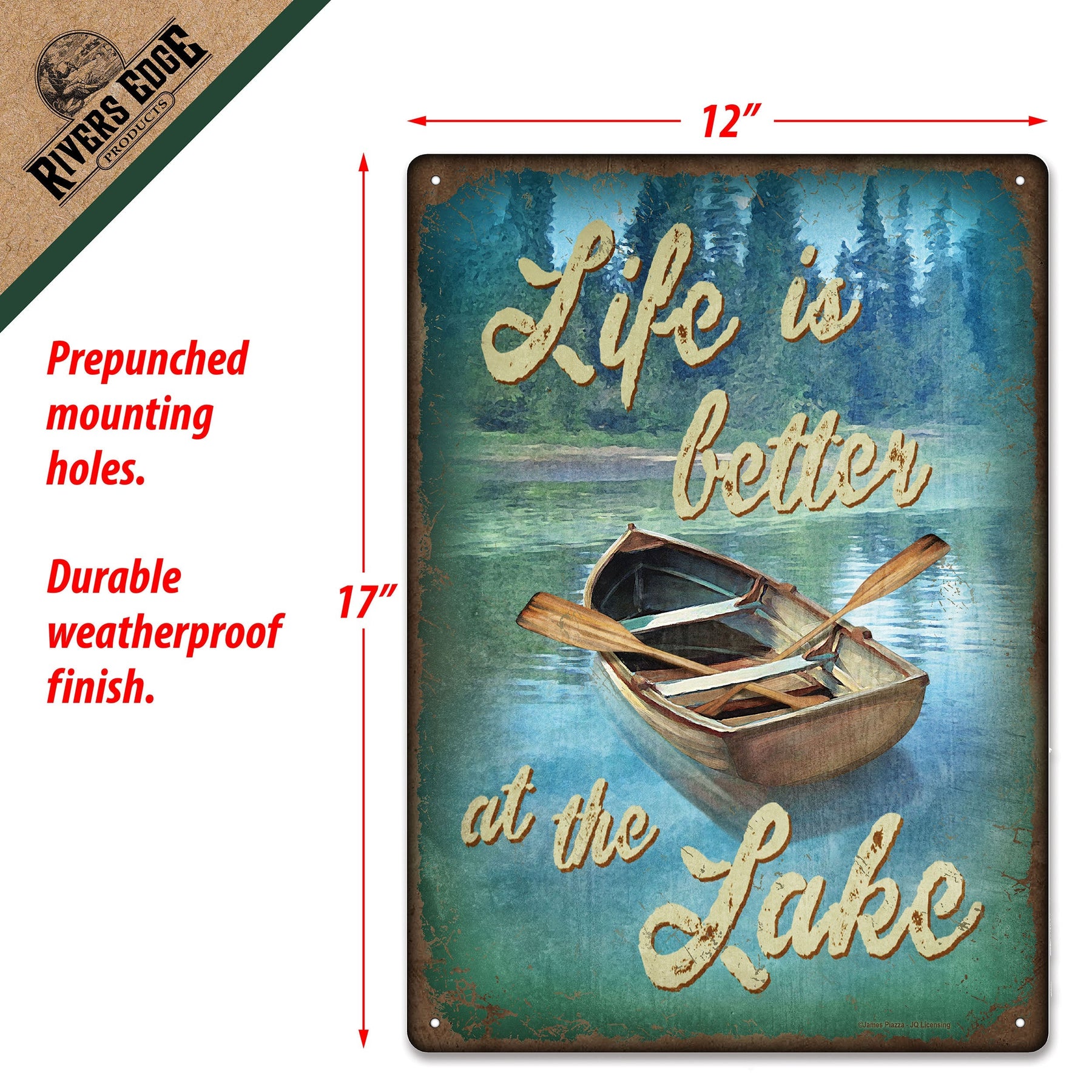 Celebrate the lake house! This metal tin sign from Rivers Edge Products is ideal wall decor for outdoor enthusiasts. Customize your boat dock, garage, home bar, or living space with this tin sign.