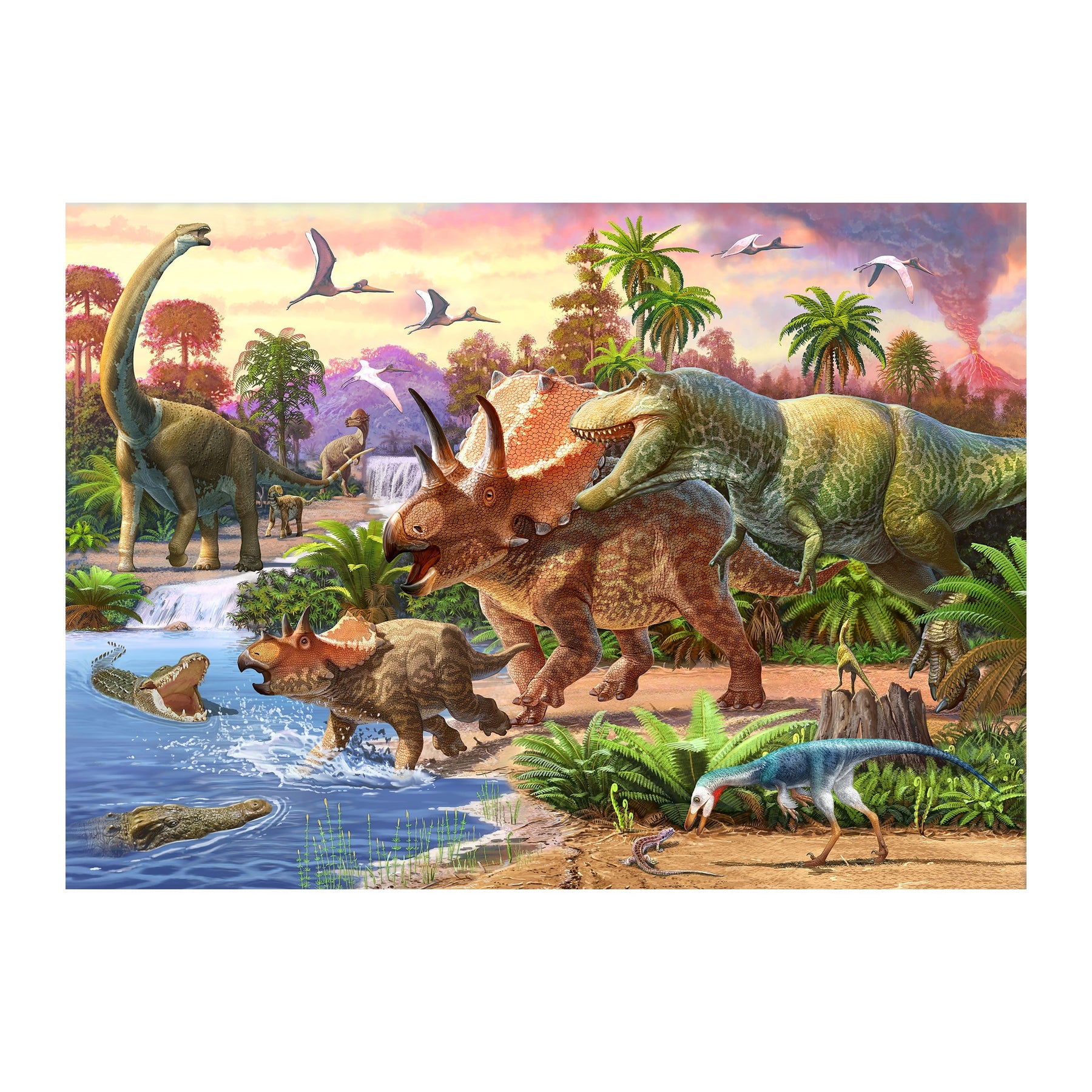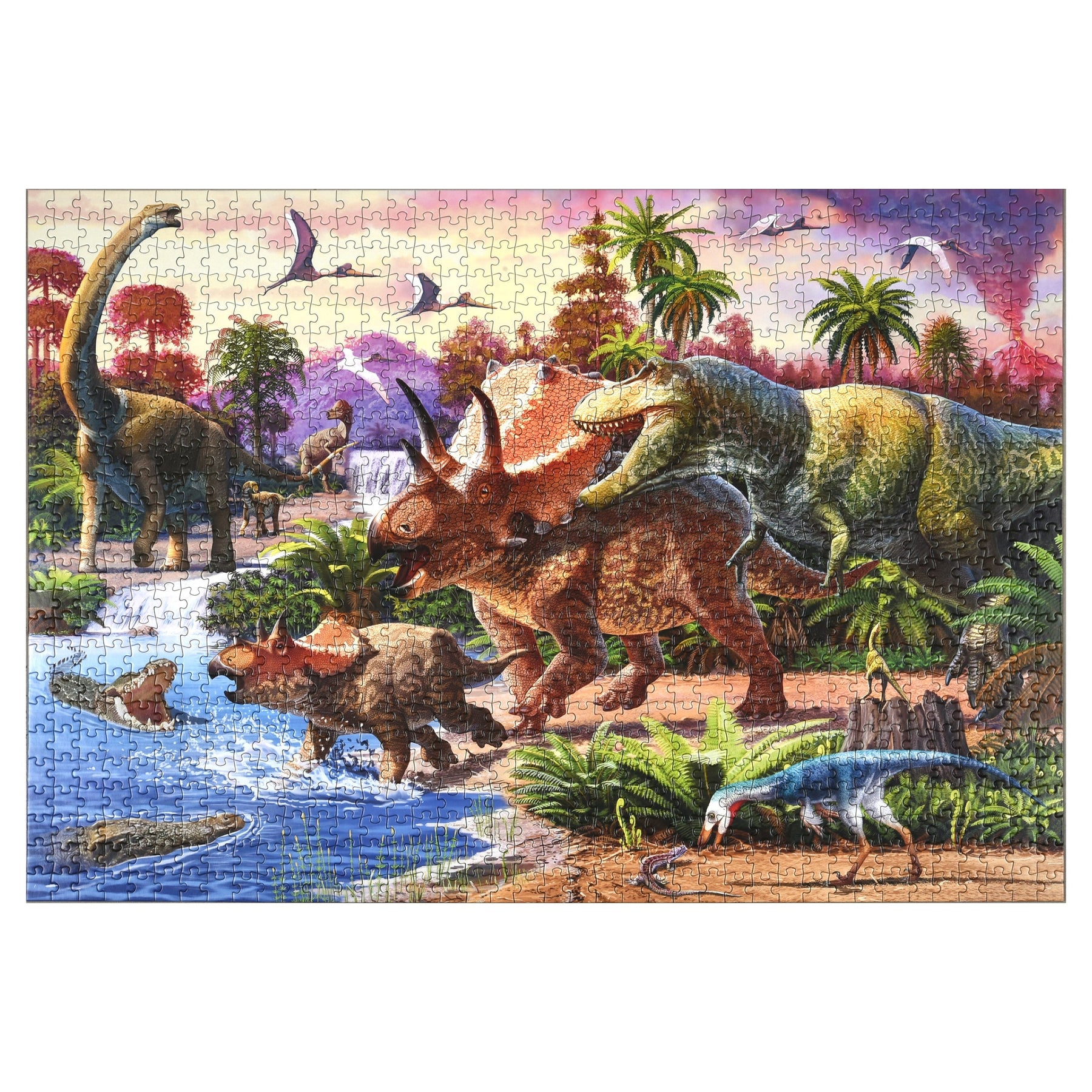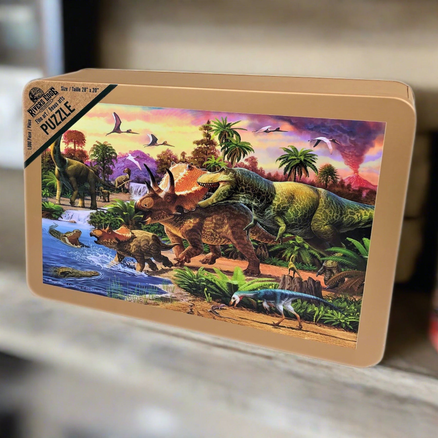 This jigsaw puzzle from Rivers Edge Products comes in an attractive embossed tin. The artwork on the tin matches the puzzle inside. This puzzle features a group of dinosaurs titled Dinosaurs at the Watering Hole by a consortium of global artists through MHS Licensing. This work of art showcases a group dinosaurs gathering to the waterhole in a prehistoric setting.