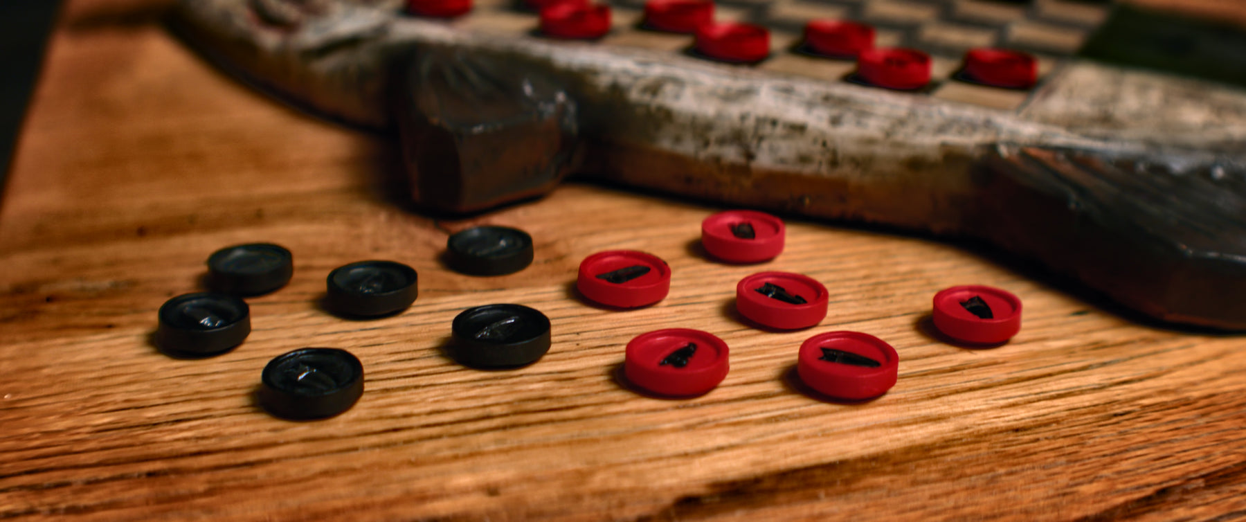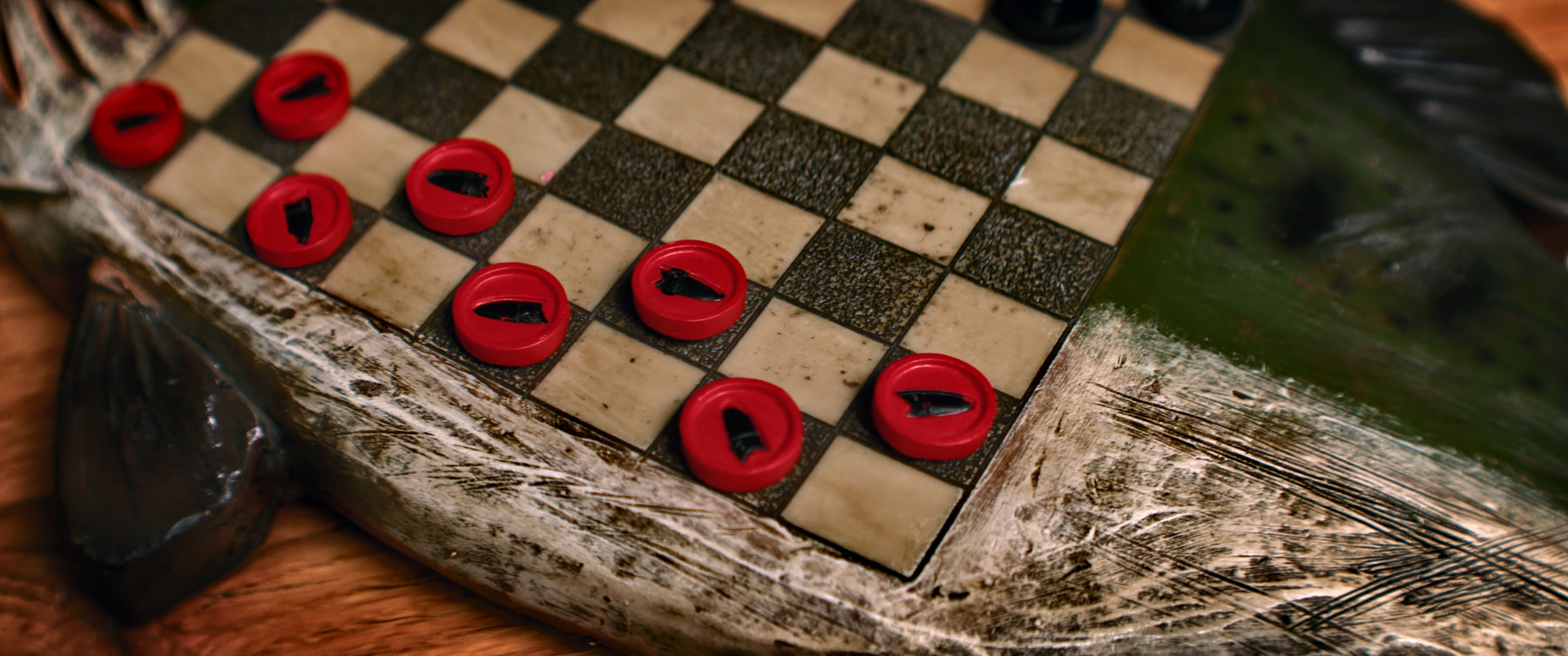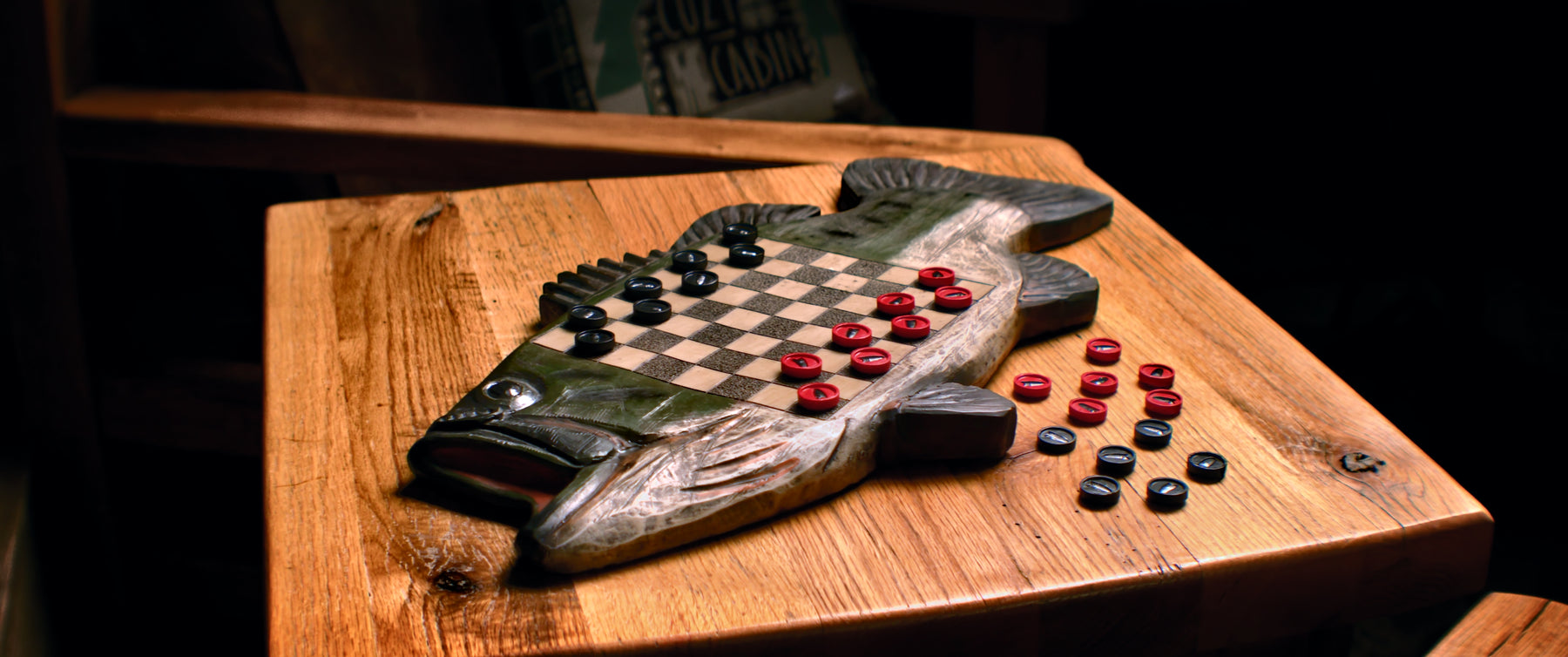 This hand painted poly resin checkerboard set from River's Edge Products is a great way to pass the the time when the fish don't want to cooperate. These specific checkers have small pictures of bass on them.