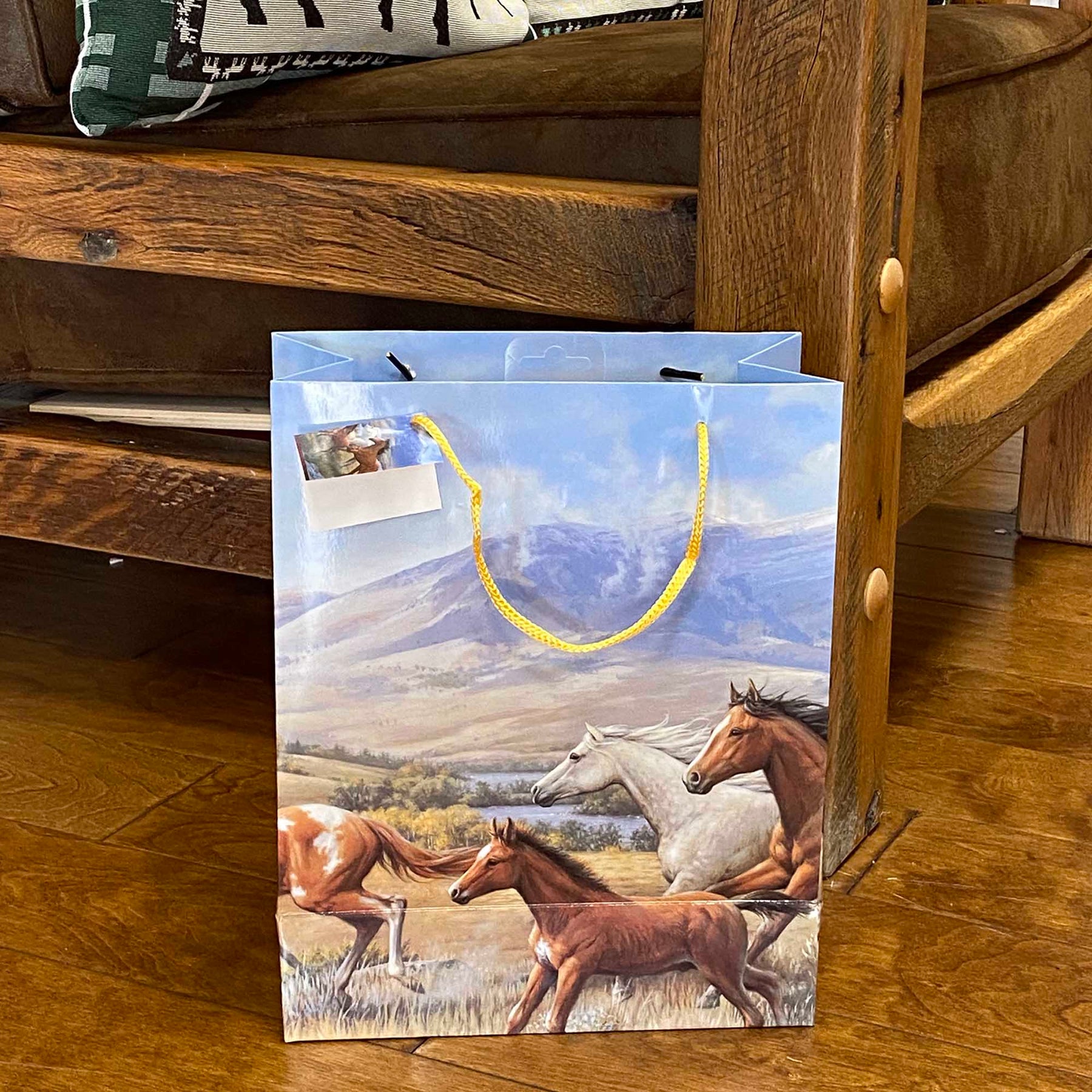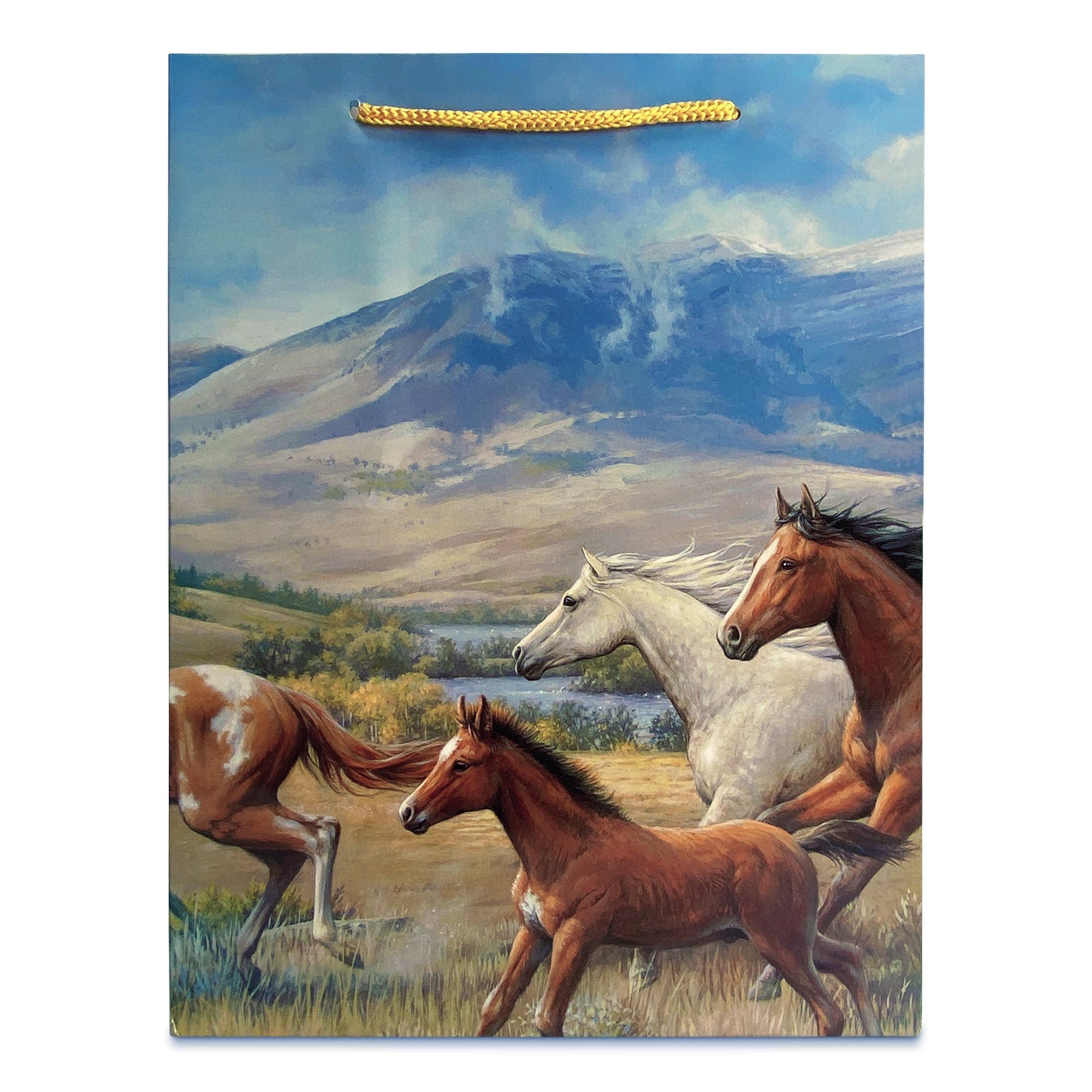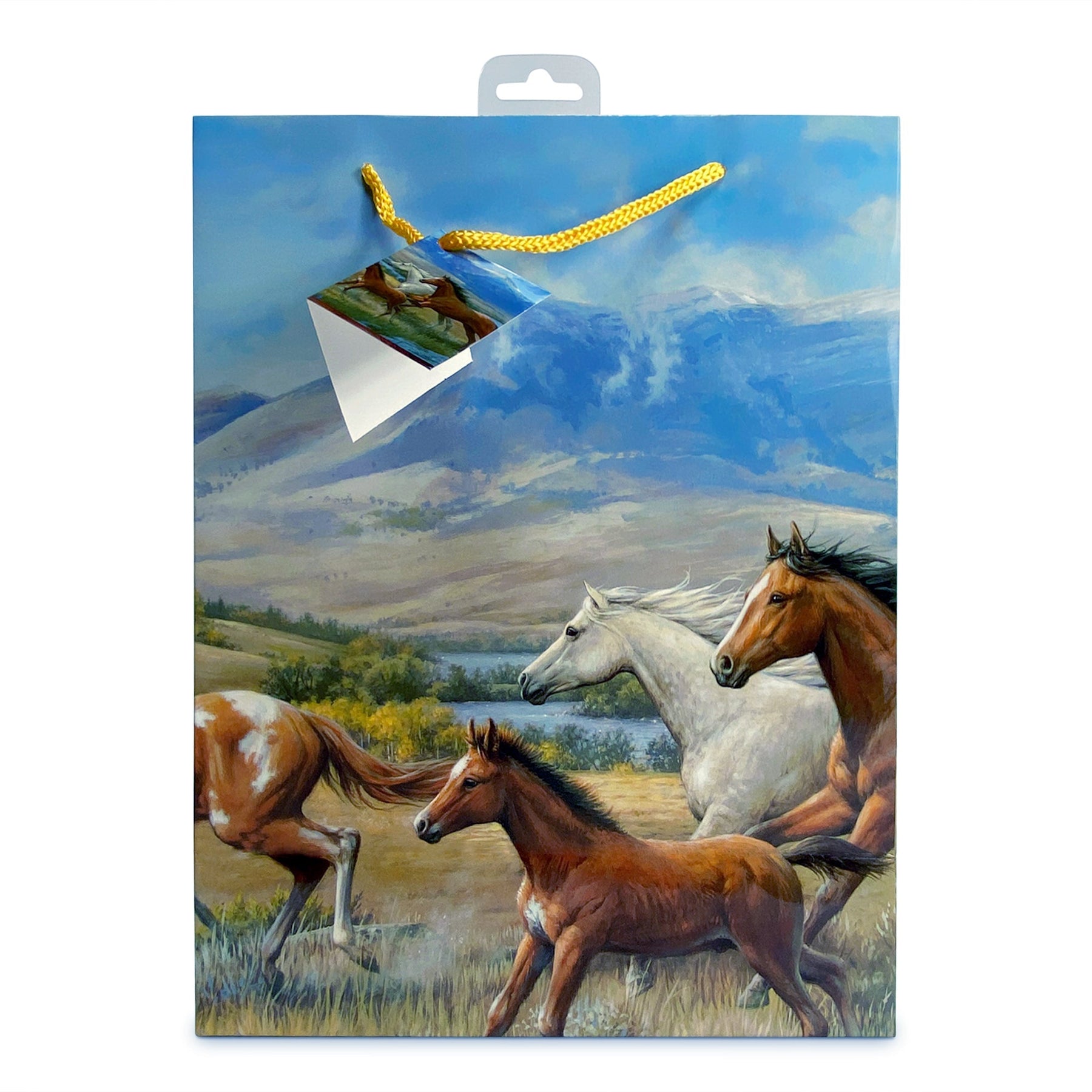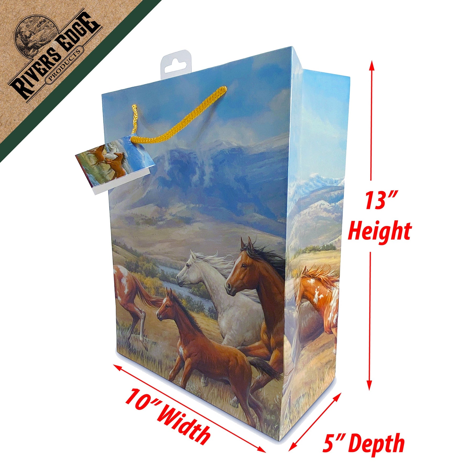 The River's Edge Products medium horses running free gift bag features outstanding licensed artwork that showcase beautiful horses running free across the land. The bag also features nylon handles, an attached card, and a removable hang tab for pegboard hanging. These gift bags measure 13-inches by 10-inches by 5-inches. Perfectly compliment any gift for an outdoor enthusiast with this gift bag.