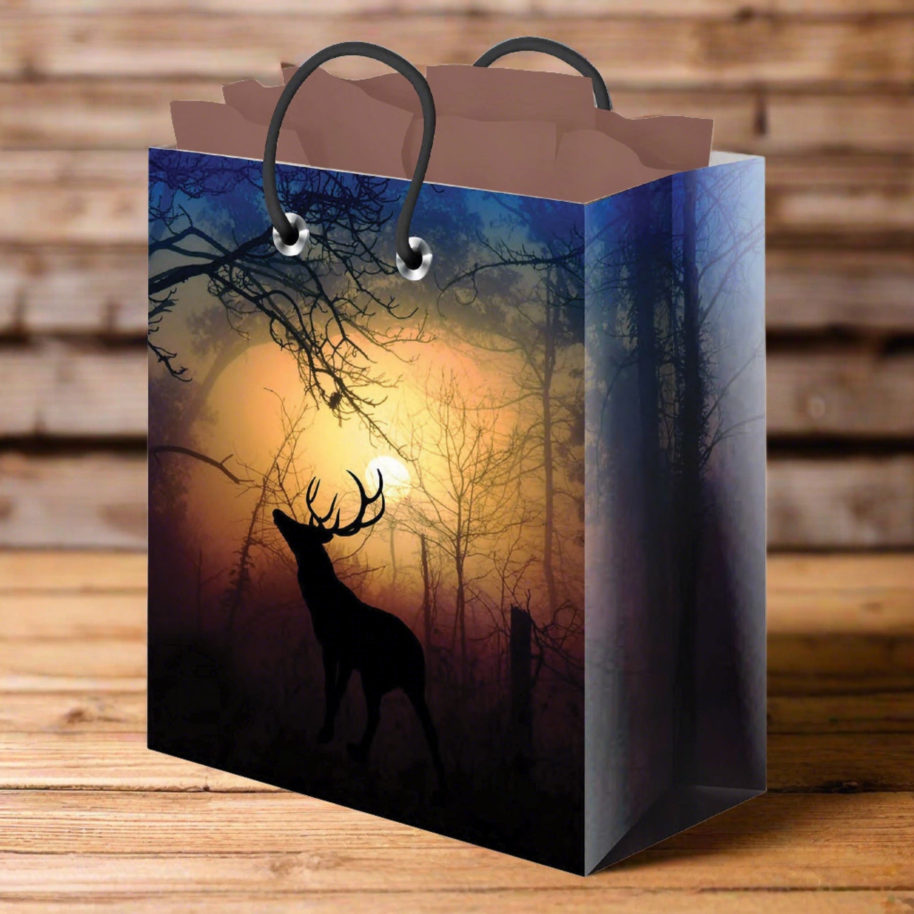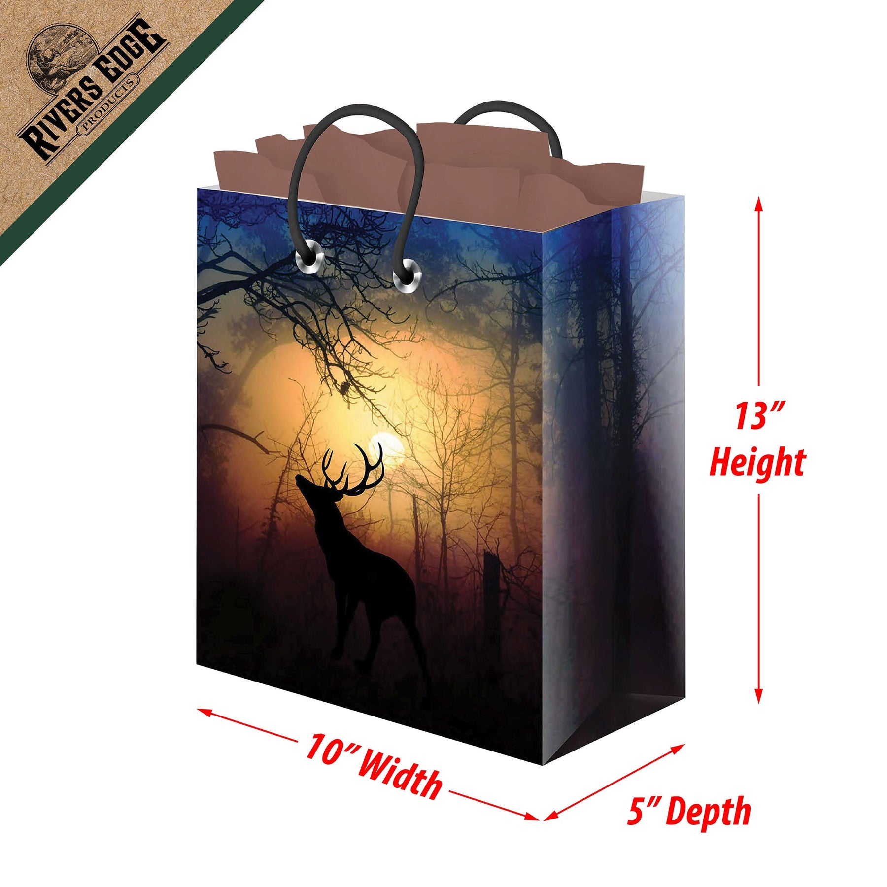 The Rivers Edge Products medium deer forest gift bag features outstanding licensed artwork that showcase a silhouette of a whitetail buck standing in the woods on a foggy morning. Perfectly compliment any gift for an outdoor enthusiast with this gift bag. Tissue packing paper is included with this gift bag.