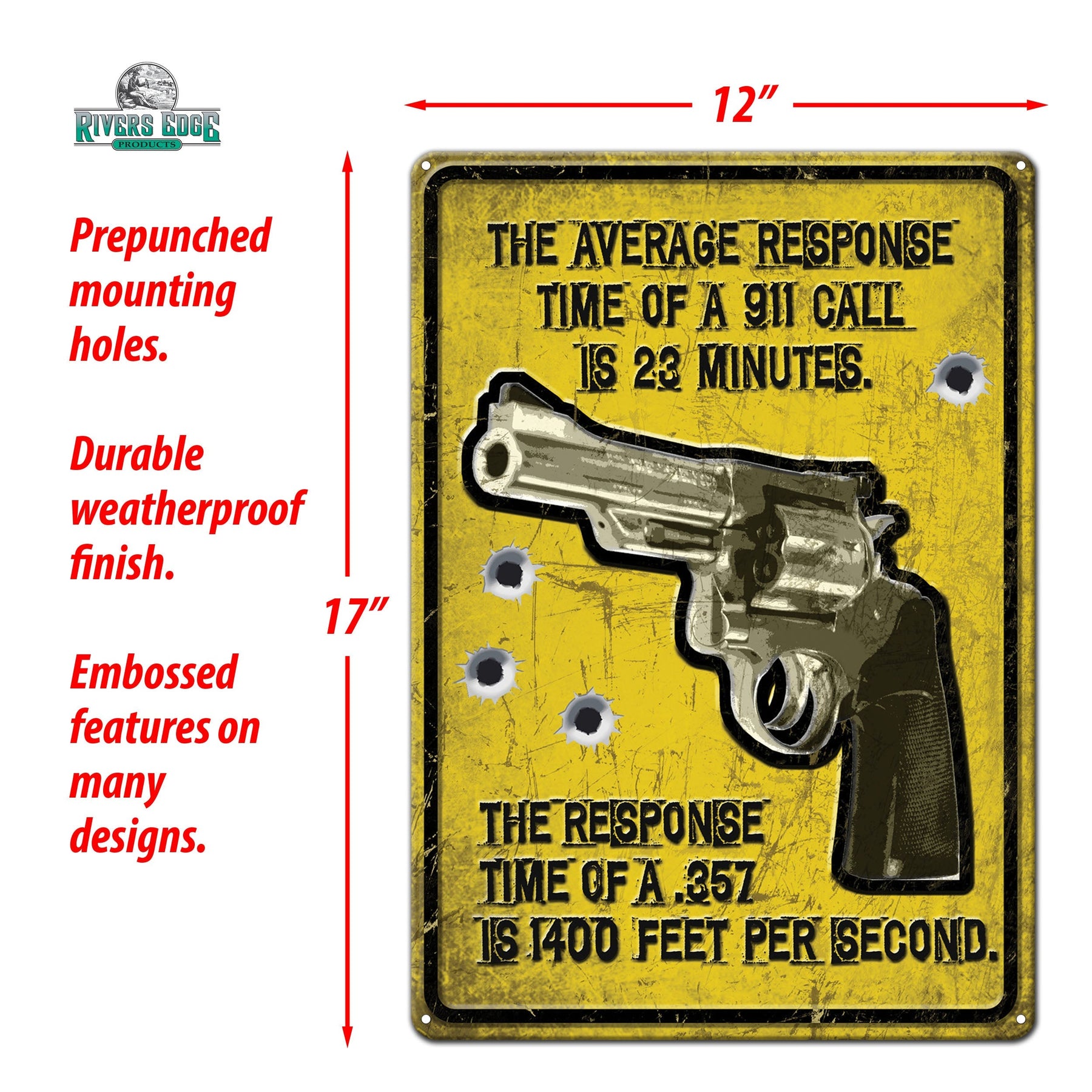 This metal tin sign from Rivers Edge Products is ideal wall decor for Second Amendment supporters. Customize your garage, home bar, or living space with this patriotic tin sign.