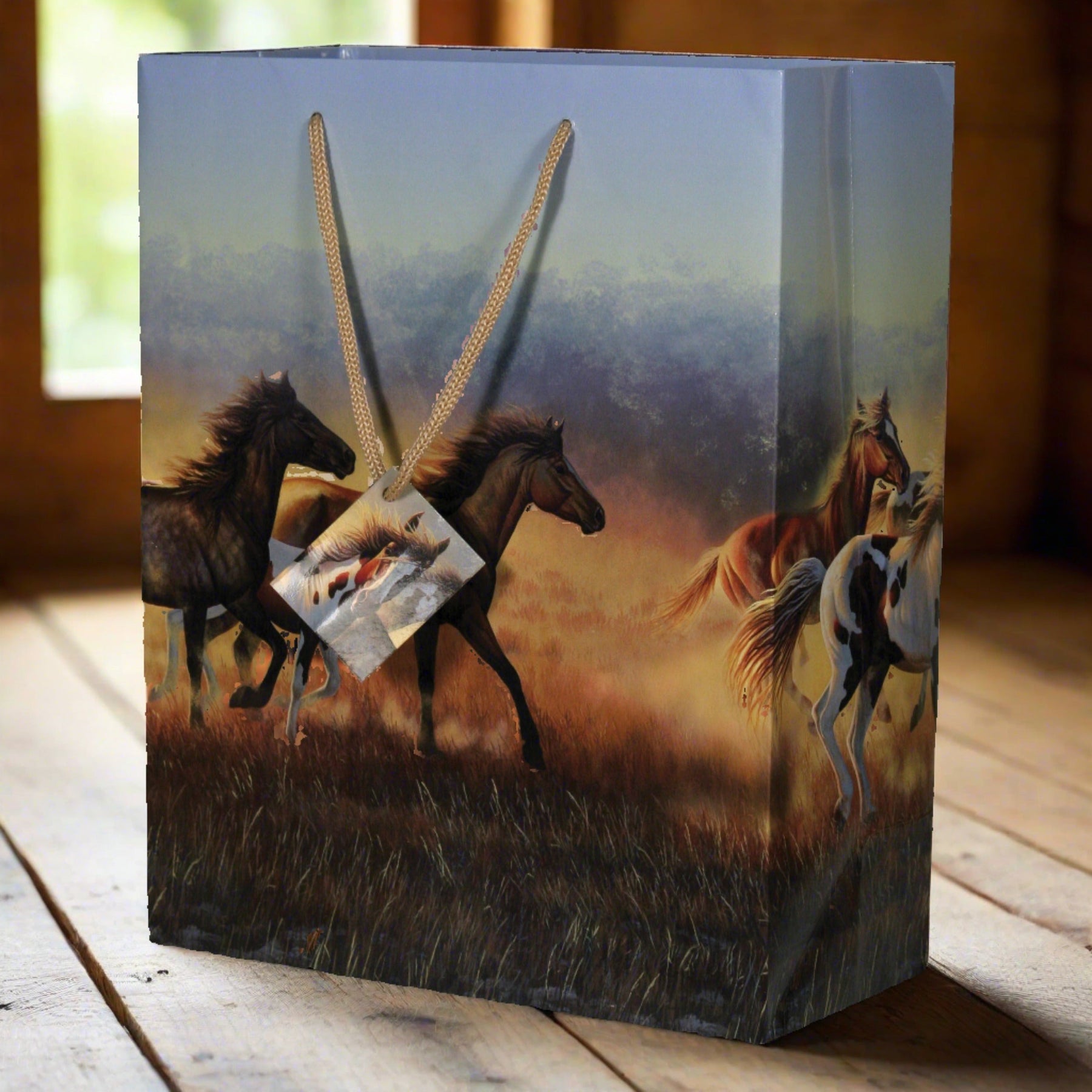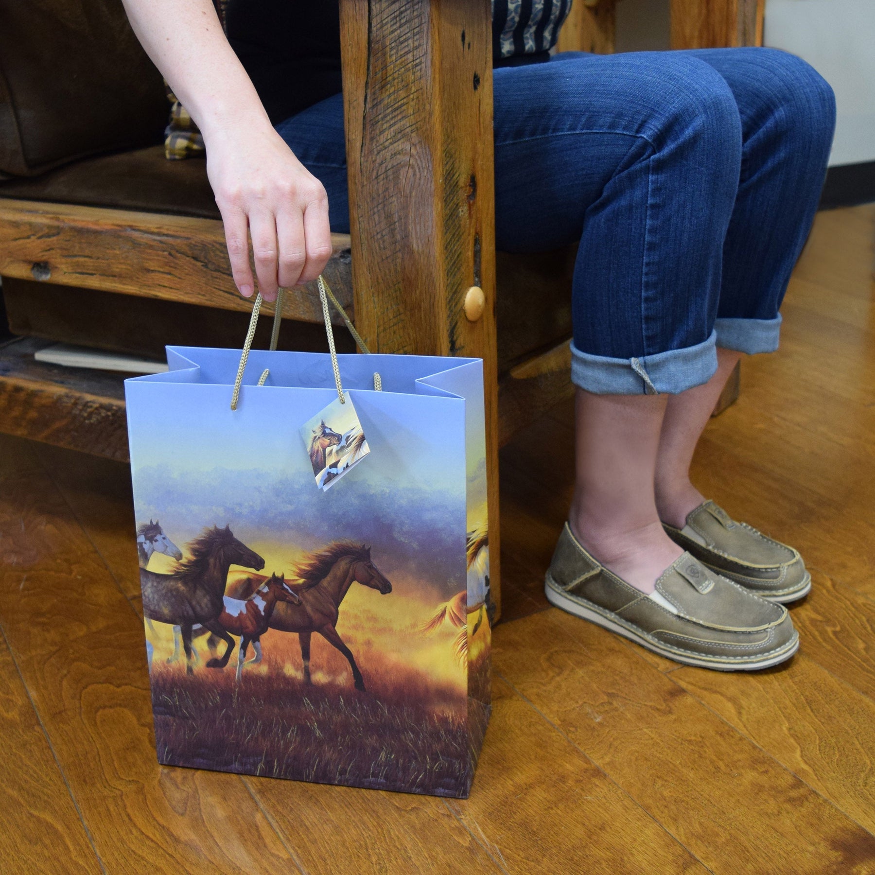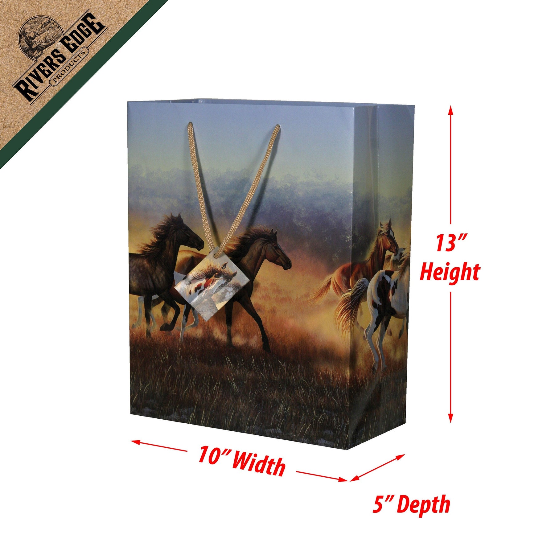 The Rivers Edge Products medium running mustang gift bag features outstanding licensed artwork that showcase a group of wild mustangs running through the grass lands. Perfectly compliment any gift for a horse/western enthusiast with this gift bag.