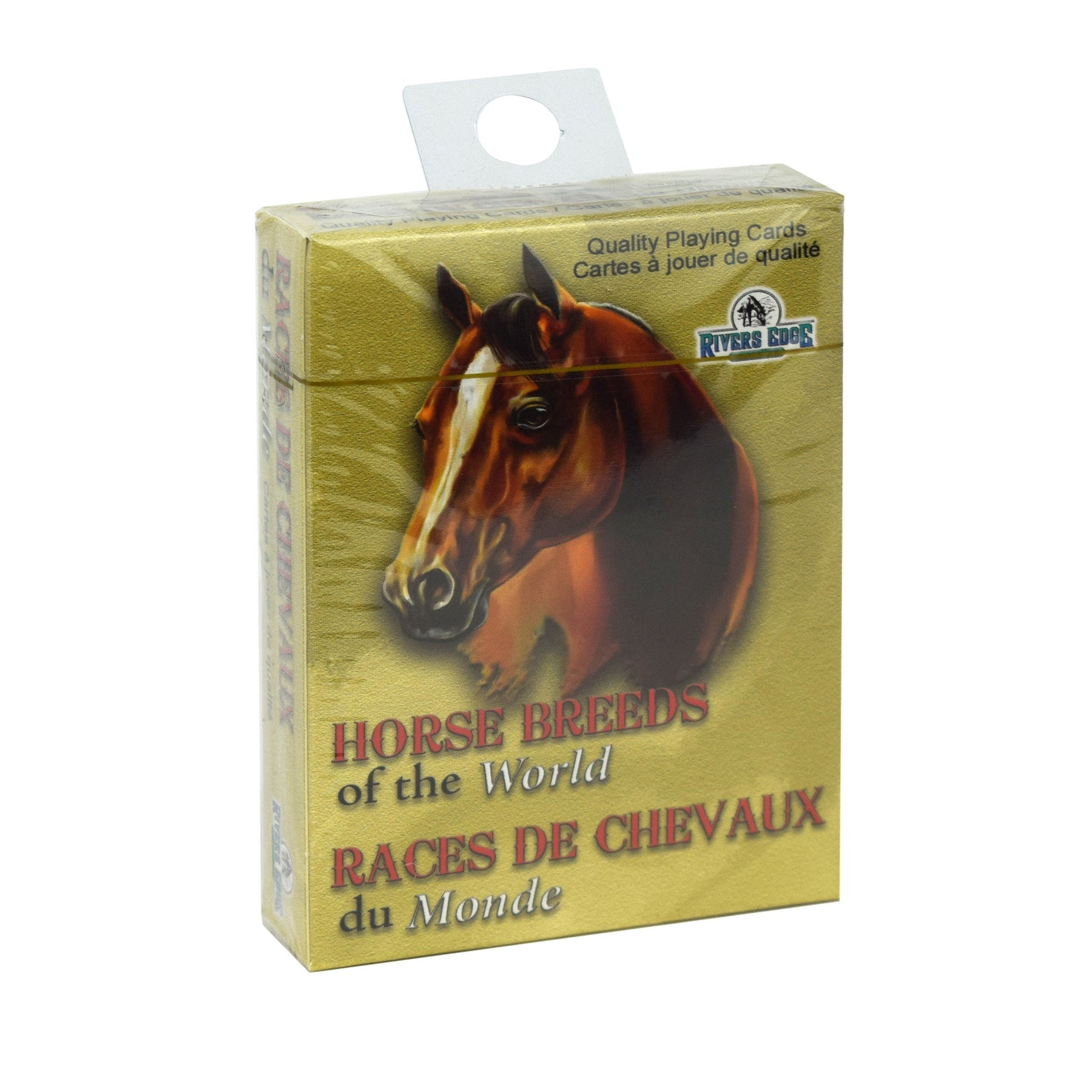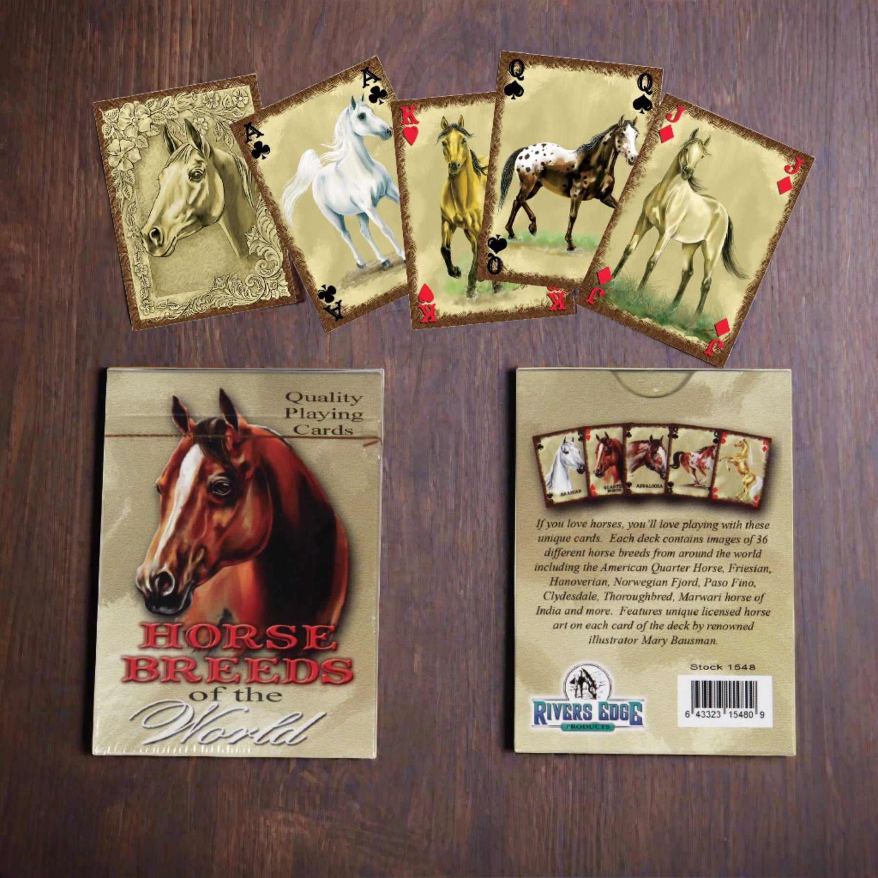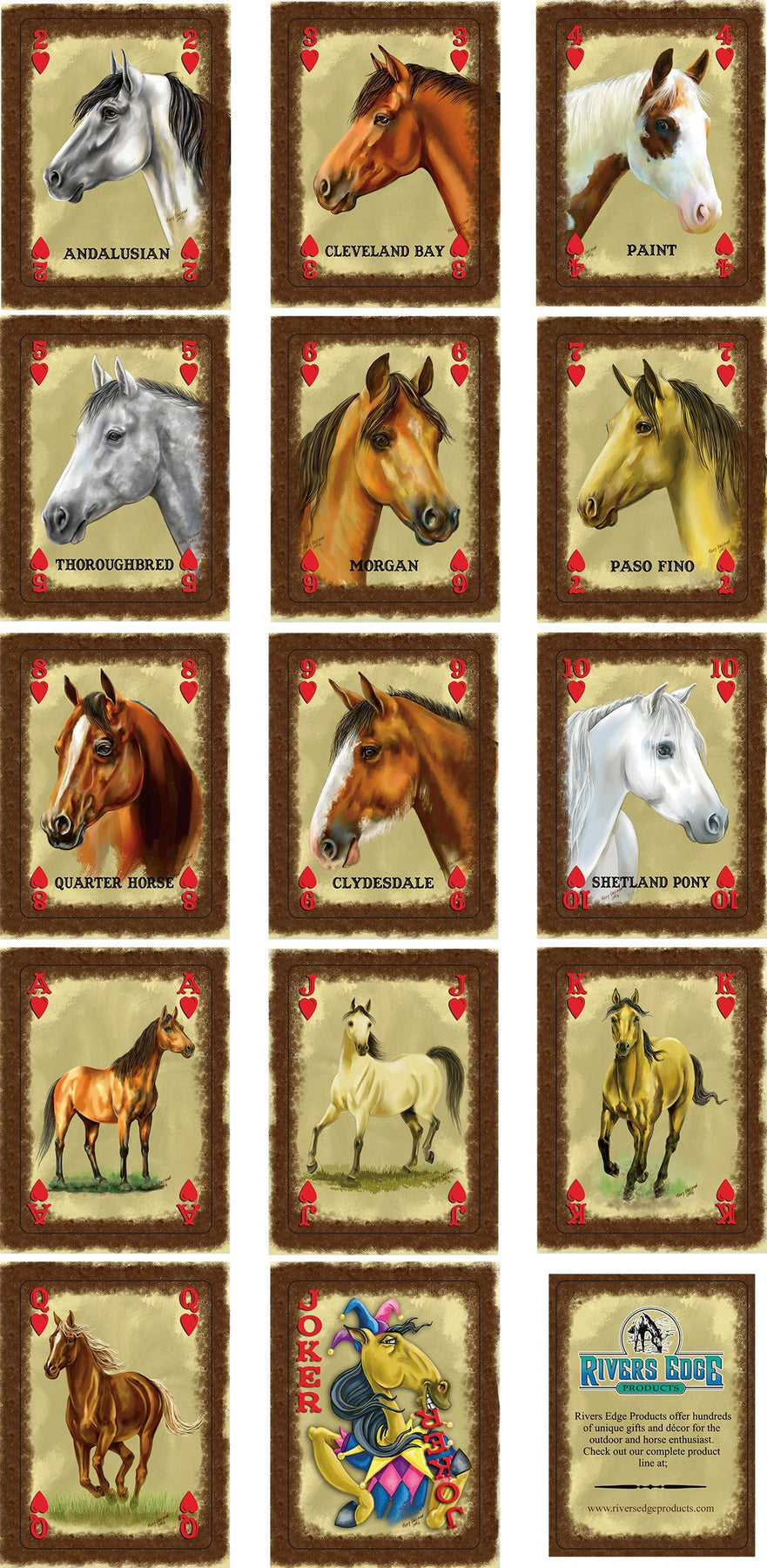 The horse playing cards from Rivers Edge Products showcase artwork of different breed of horses from around the world courtesy of JQ Licensing. These decks are full decks of 54 playing cards. Each deck contains images of 36 different horse breeds. Makes for a perfect gift idea for any horse enthusiast. Sold in a display of 12 decks only.