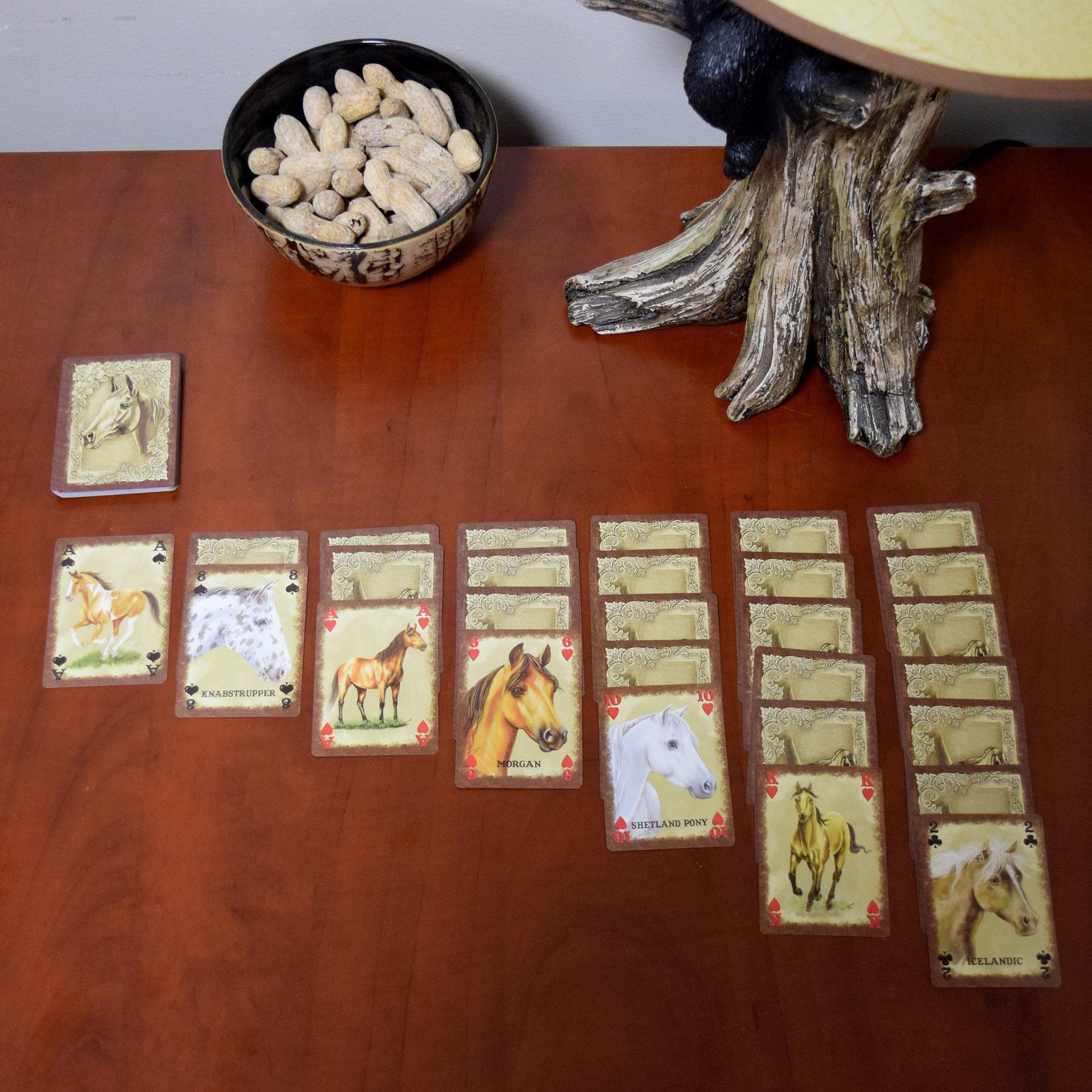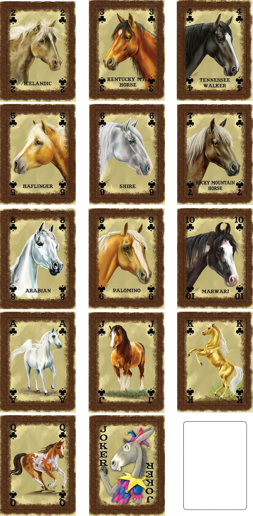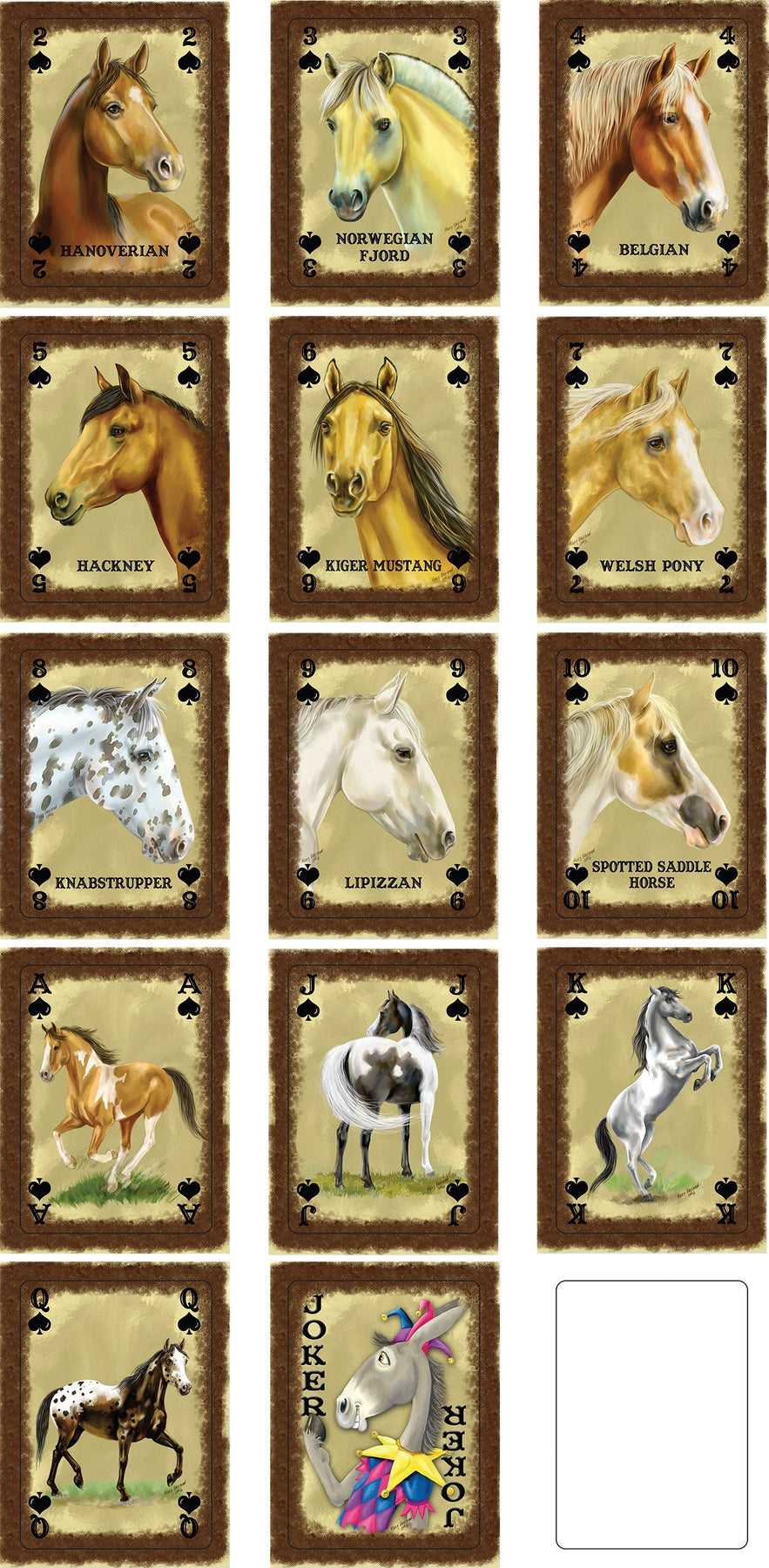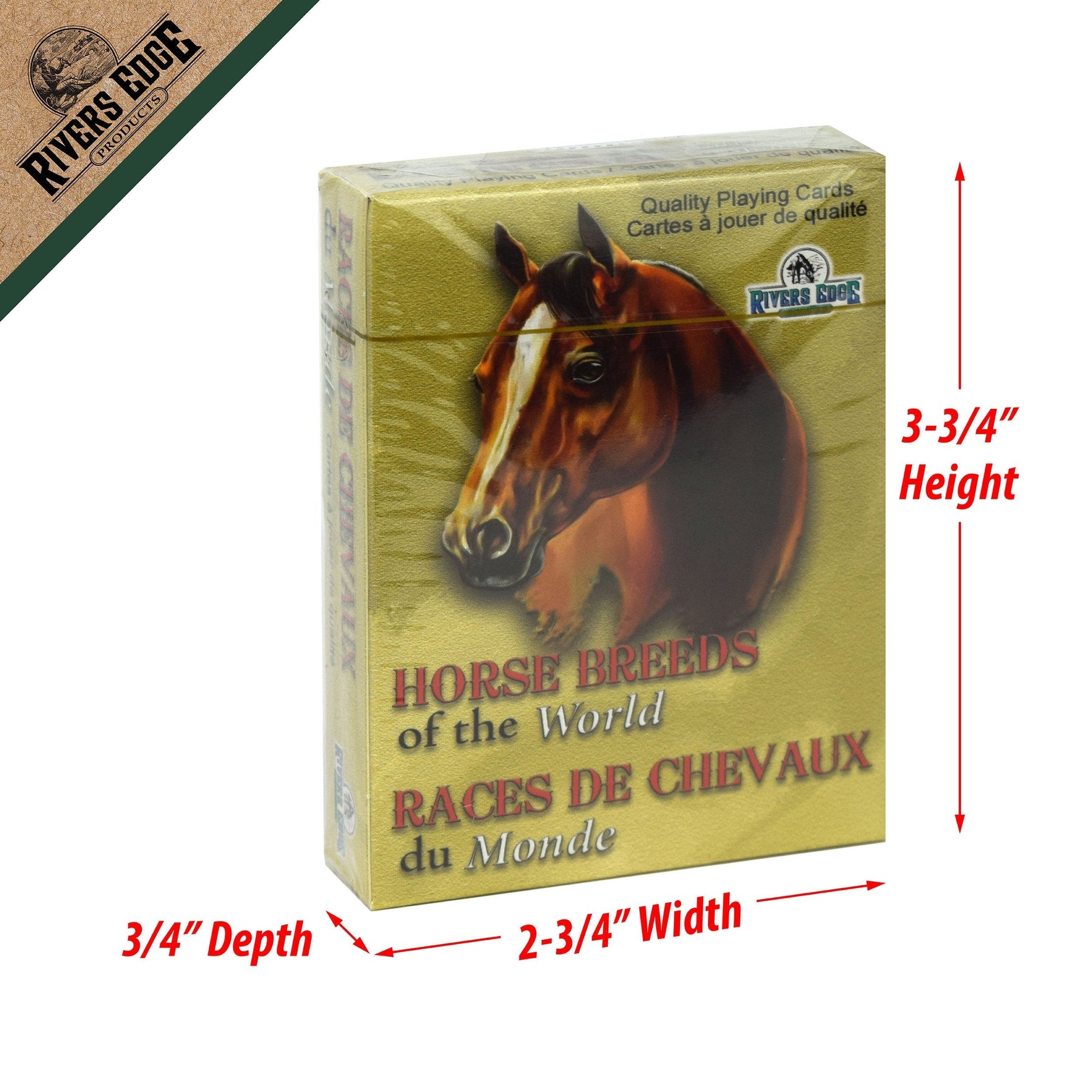 The horse playing cards from Rivers Edge Products showcase artwork of different breed of horses from around the world courtesy of JQ Licensing. These decks are full decks of 54 playing cards. Each deck contains images of 36 different horse breeds. Makes for a perfect gift idea for any horse enthusiast. Sold in a display of 12 decks only.