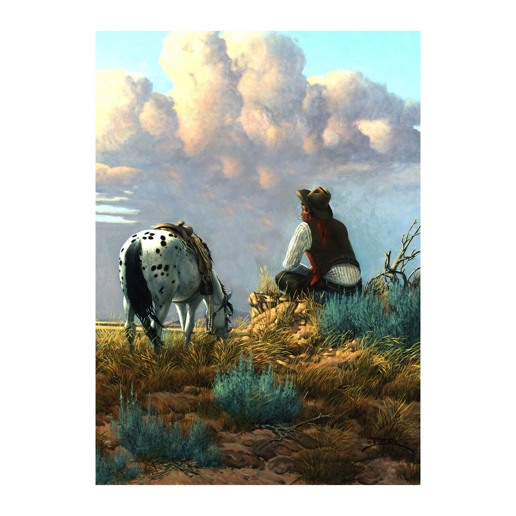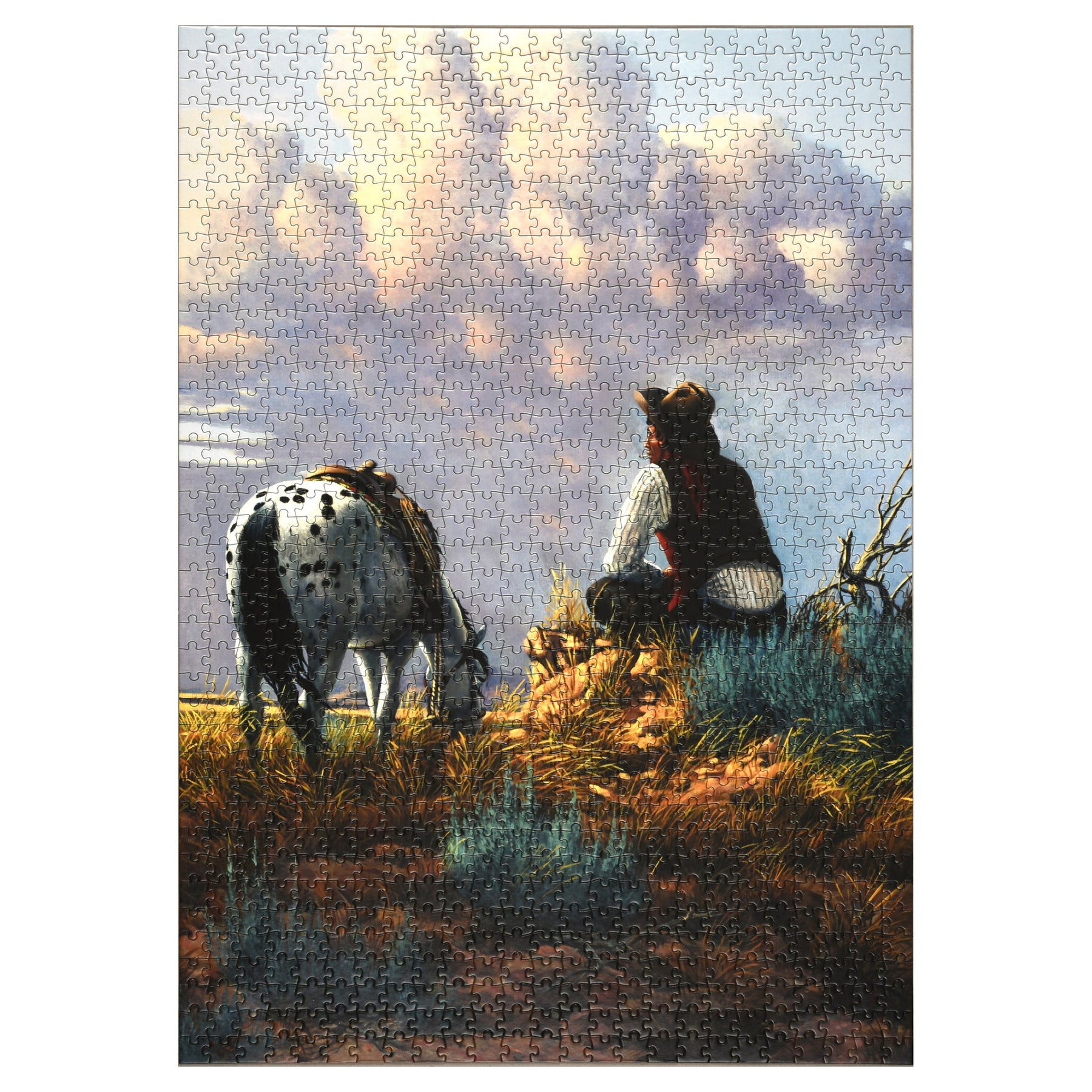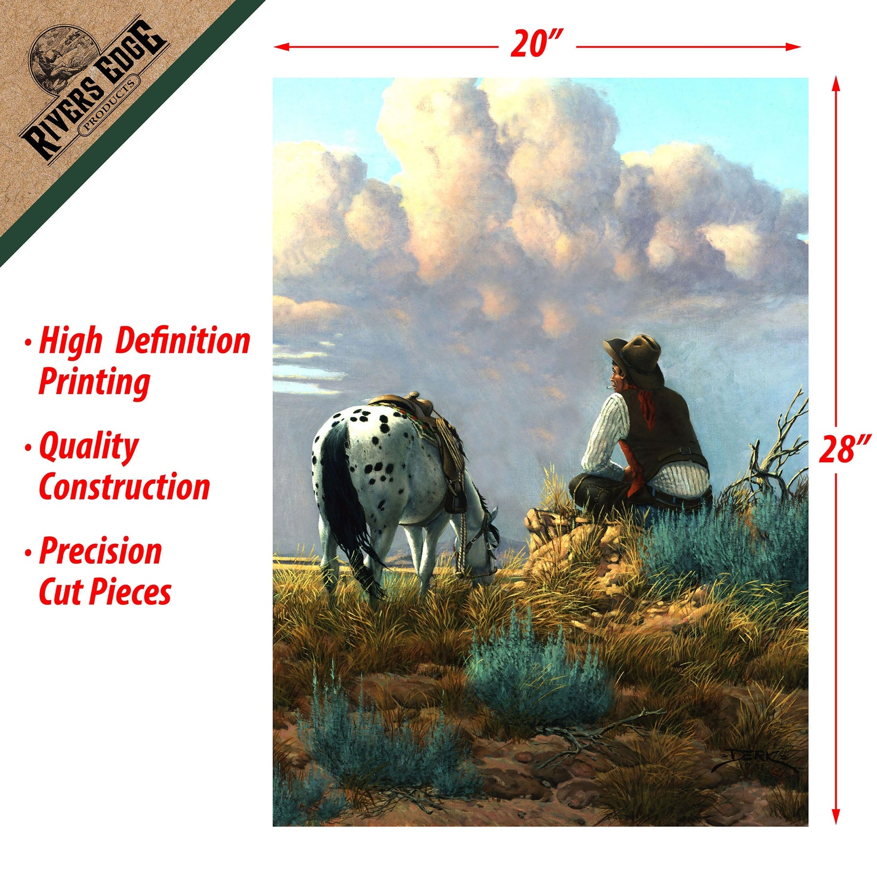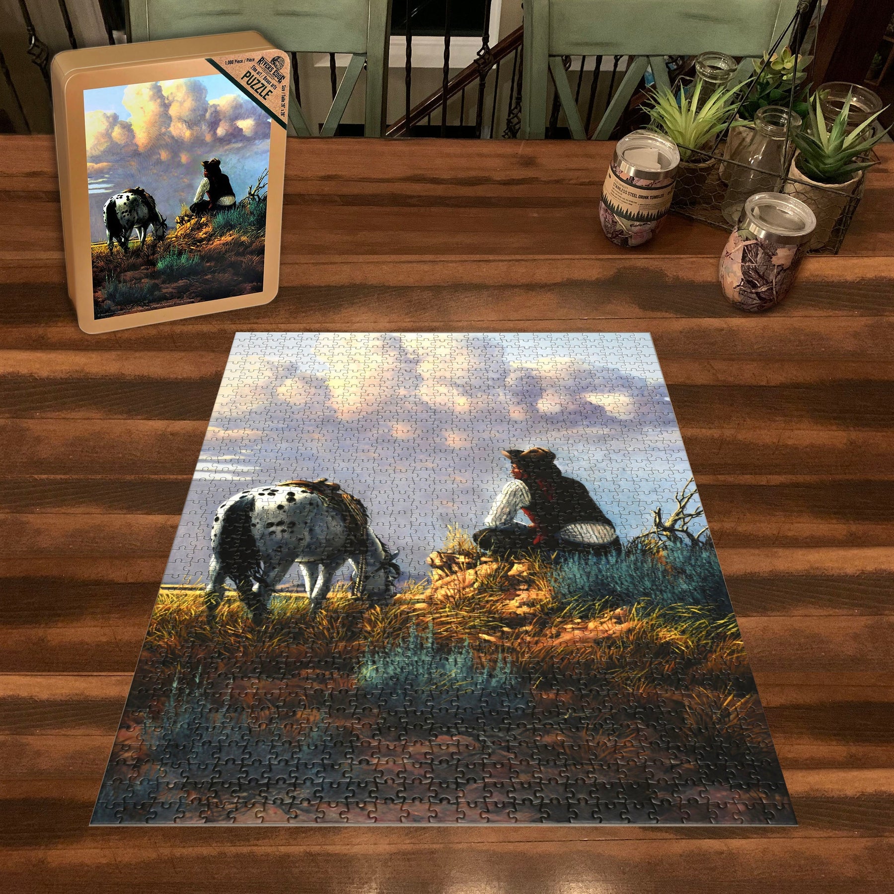 This jigsaw puzzle from River's Edge Products comes in an attractive embossed tin. The artwork on the tin matches the puzzle inside. This puzzle features a man and his horse titled Dreamers Hour by Derk Hansen through MHS Licensing.