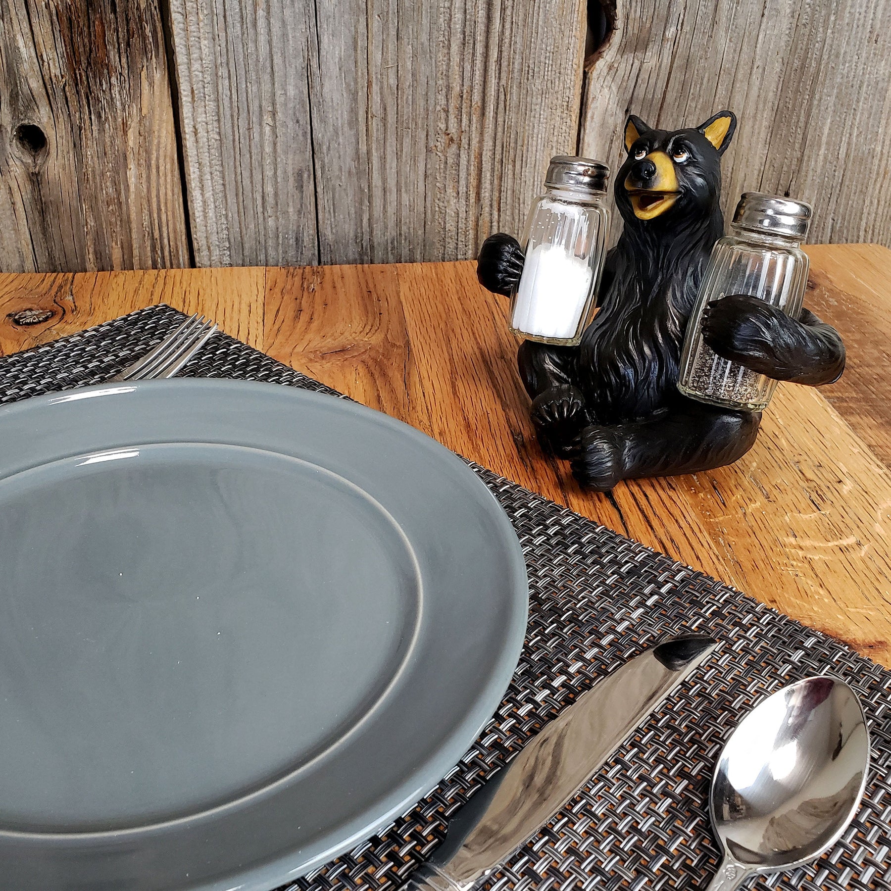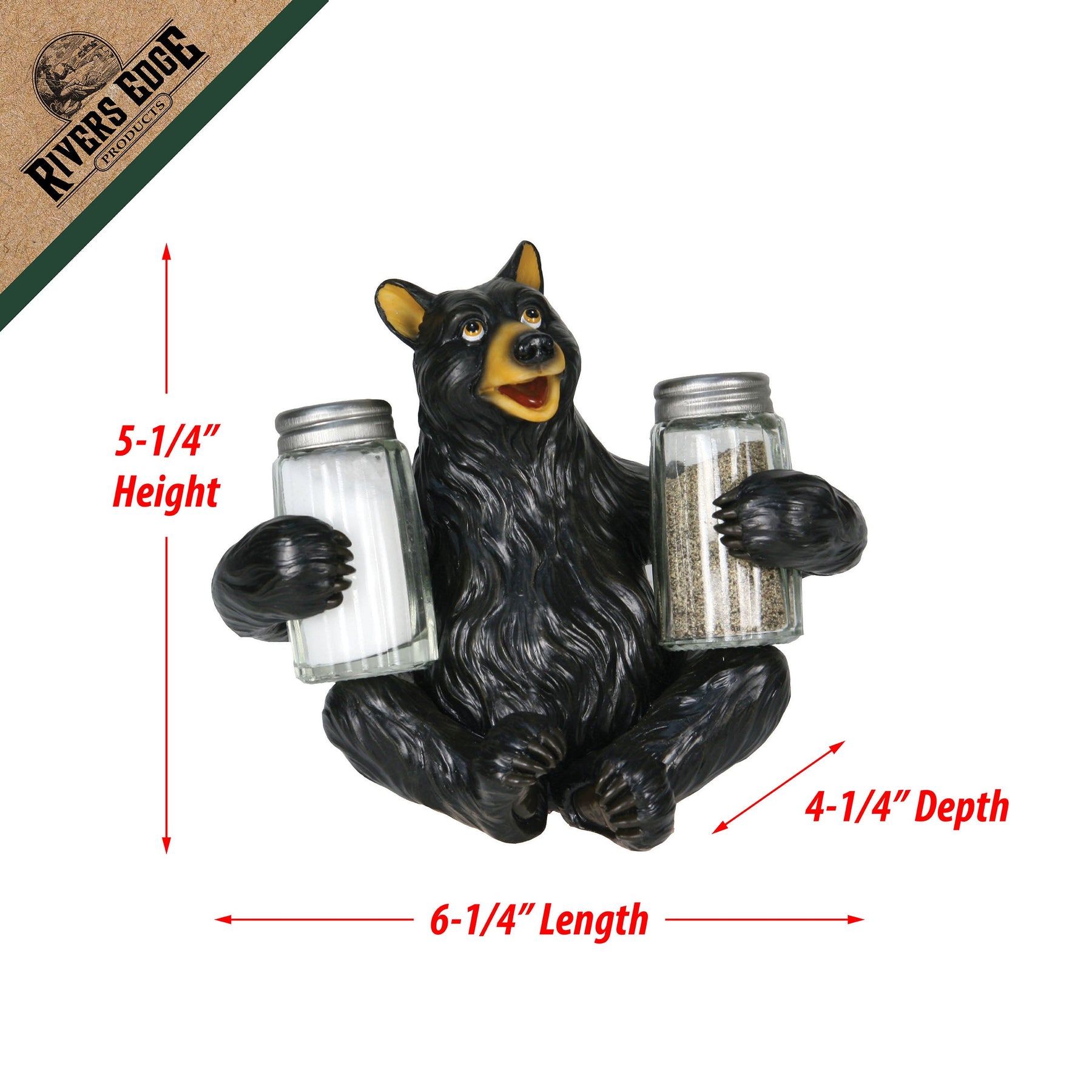 This bear salt and pepper shaker set from Rivers Edge Products will be a welcome addition to your dining room table. The glass salt and pepper shakers fit nicely into the arms of a cartoonish, smiling black bear. The shakers are made of clear glass, so you'll never mistake salt for pepper when you season your food. The Bear Glass salt and pepper shakers will allow you to season your meal with style.