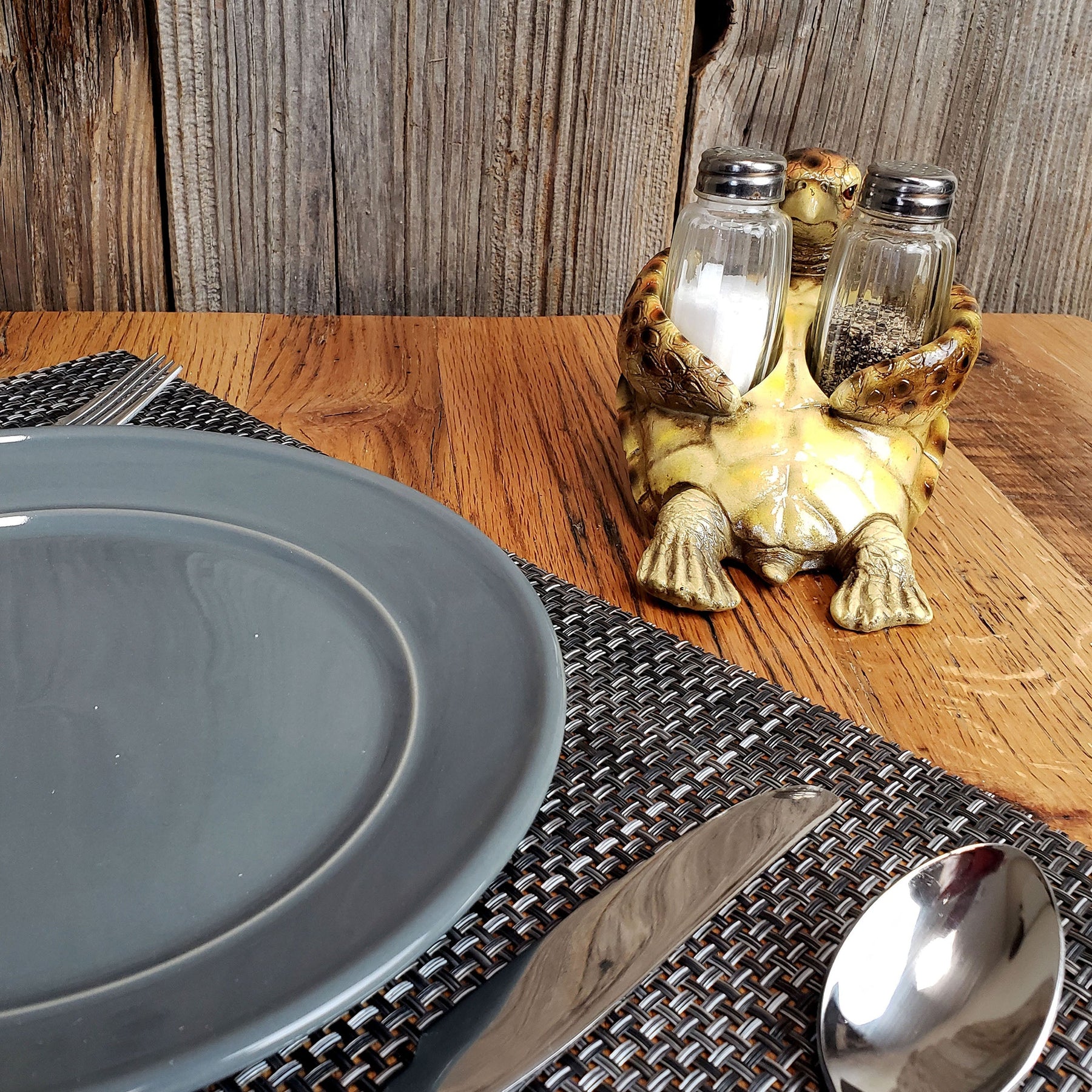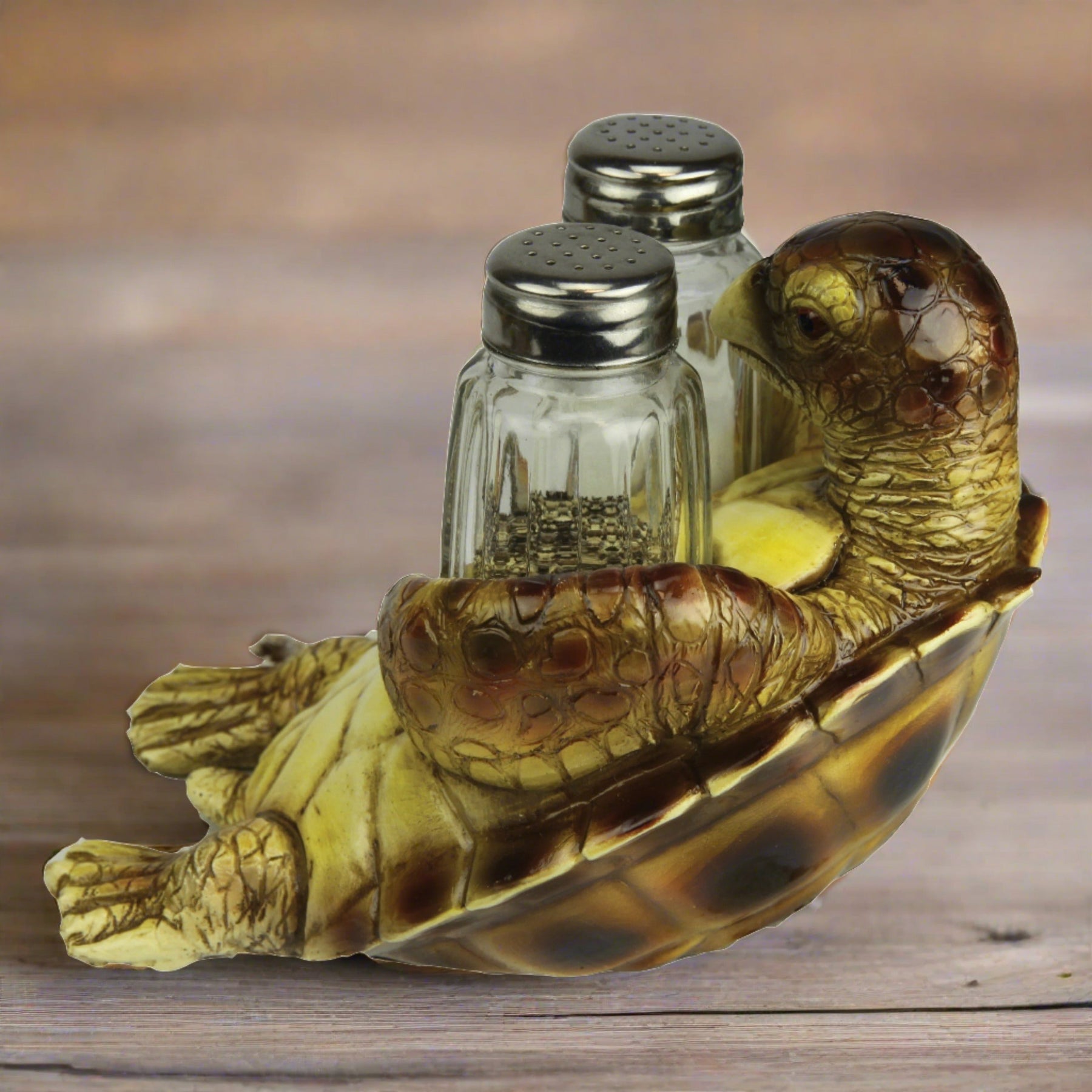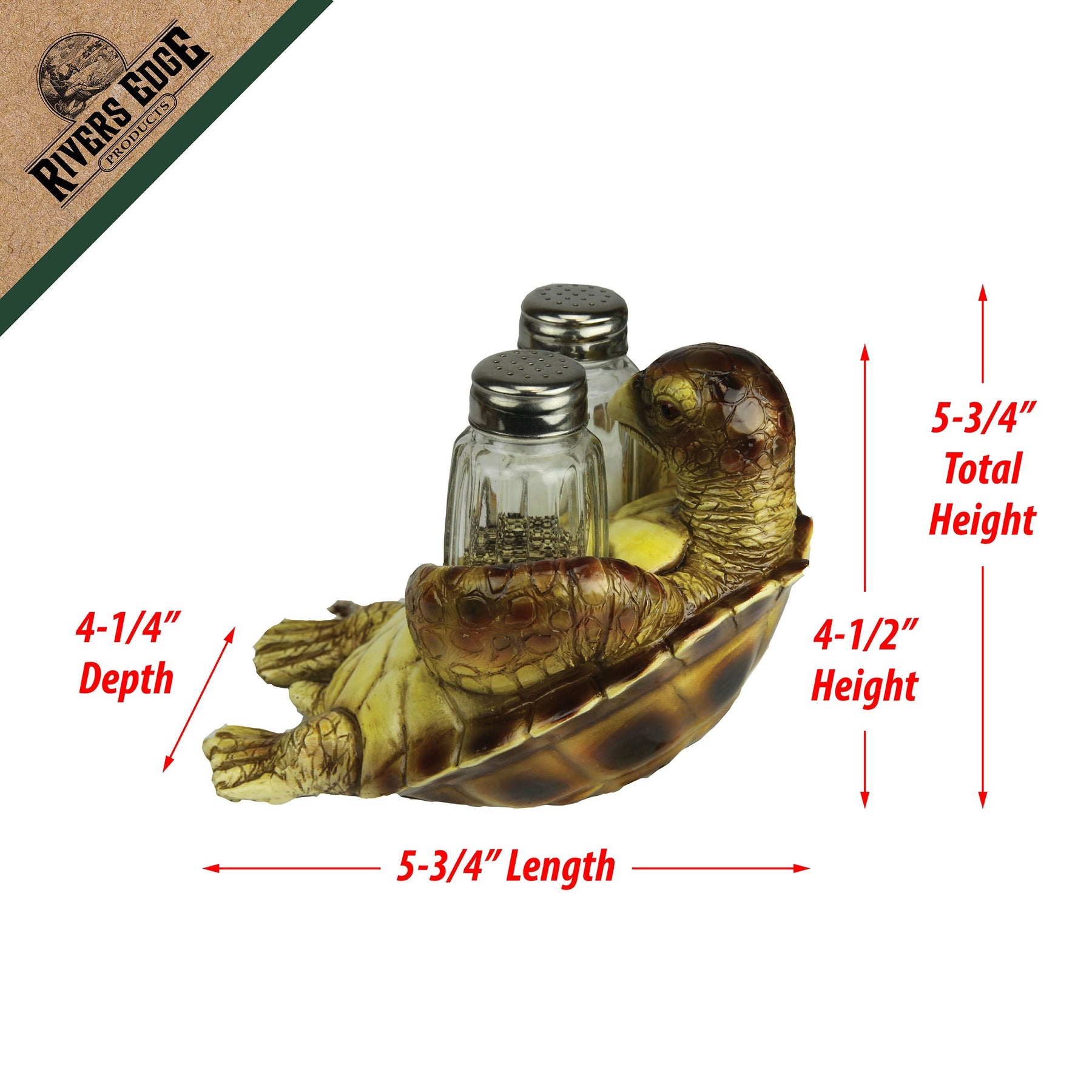 This sea turtle salt and pepper shaker set from Rivers Edge Products will be a welcome addition to your dining room table. The glass salt and pepper shakers fit nicely into the fins of a green sea turtle. The sea turtle is hand-painted poly resin and is highly detailed and colorful. The shakers are made of clear glass so you'll never mistake salt for pepper when you season your food. The Sea Turtle salt and pepper shakers will allow you to season your meal with style.