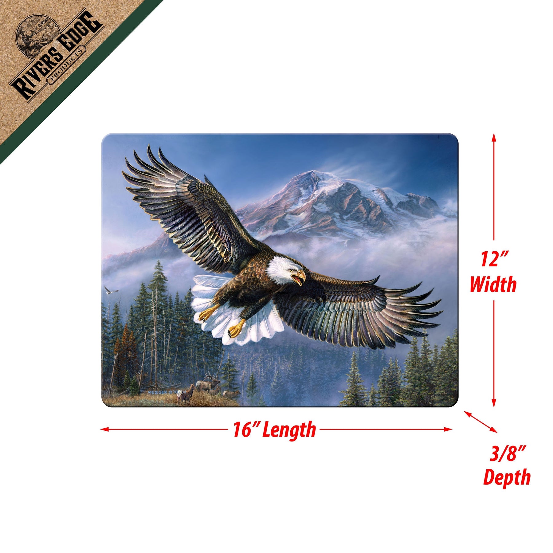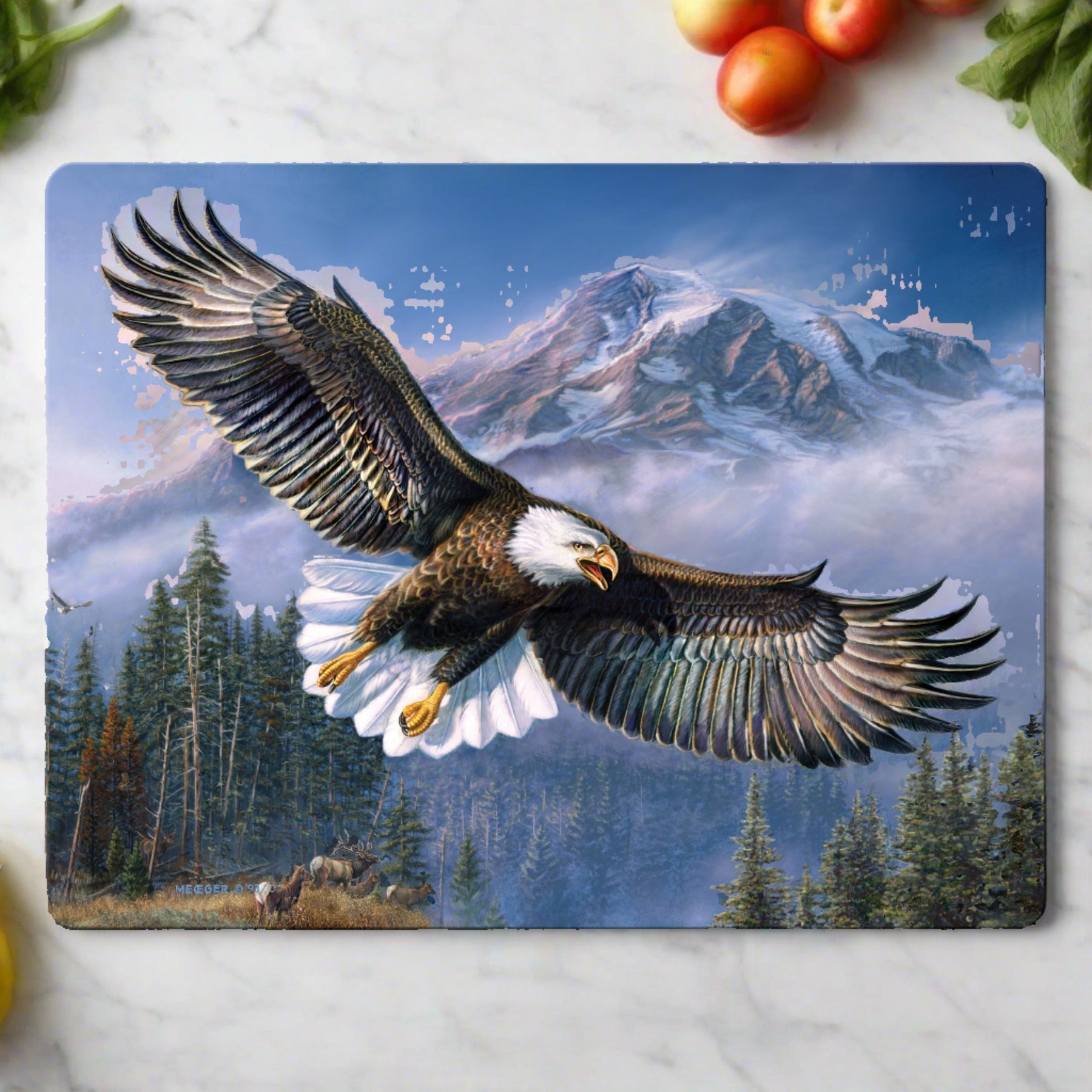 This eagle tempered glass cutting board from Rivers Edge Products features a eagle with a mountain background.