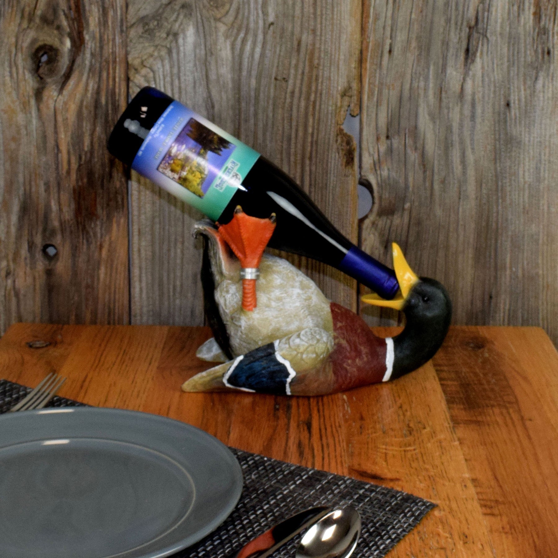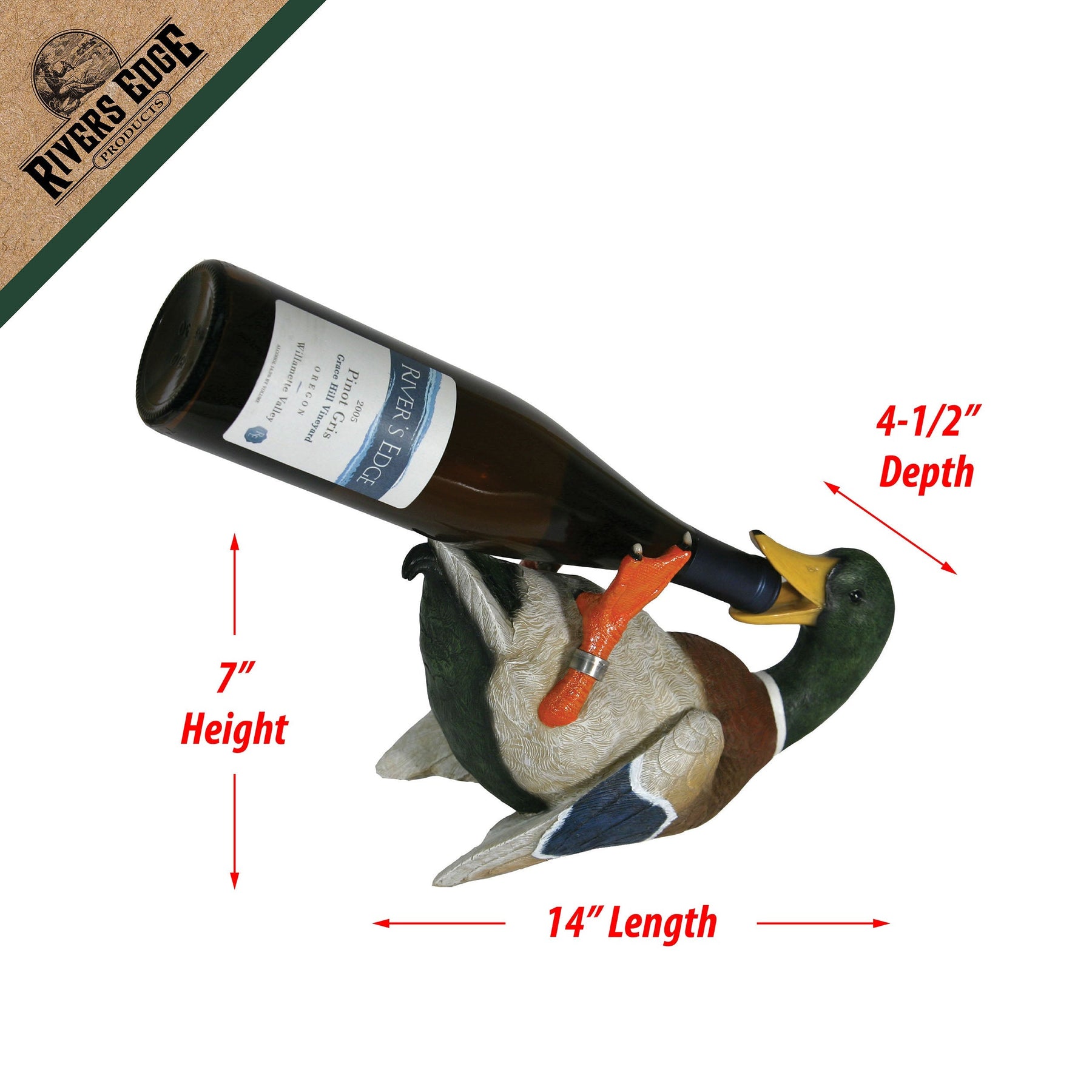 Stand out from the rest with this duck wine bottle holder from Rivers Edge Products. This bottle holder is constructed of a durable poly resin that is made to resembles a mallard drake duck chugging your favorite bottle of wine or spirit. Designed to hold a standard 750ml wine bottle. It will also hold bottles of similar shape and size for the fire water connoisseur. Accent any outdoor themed home decor, bar, man cave, etc. Makes for a perfect gift idea for any outdoor enthusiast or wine connoisseur. (Wine bottle not included)