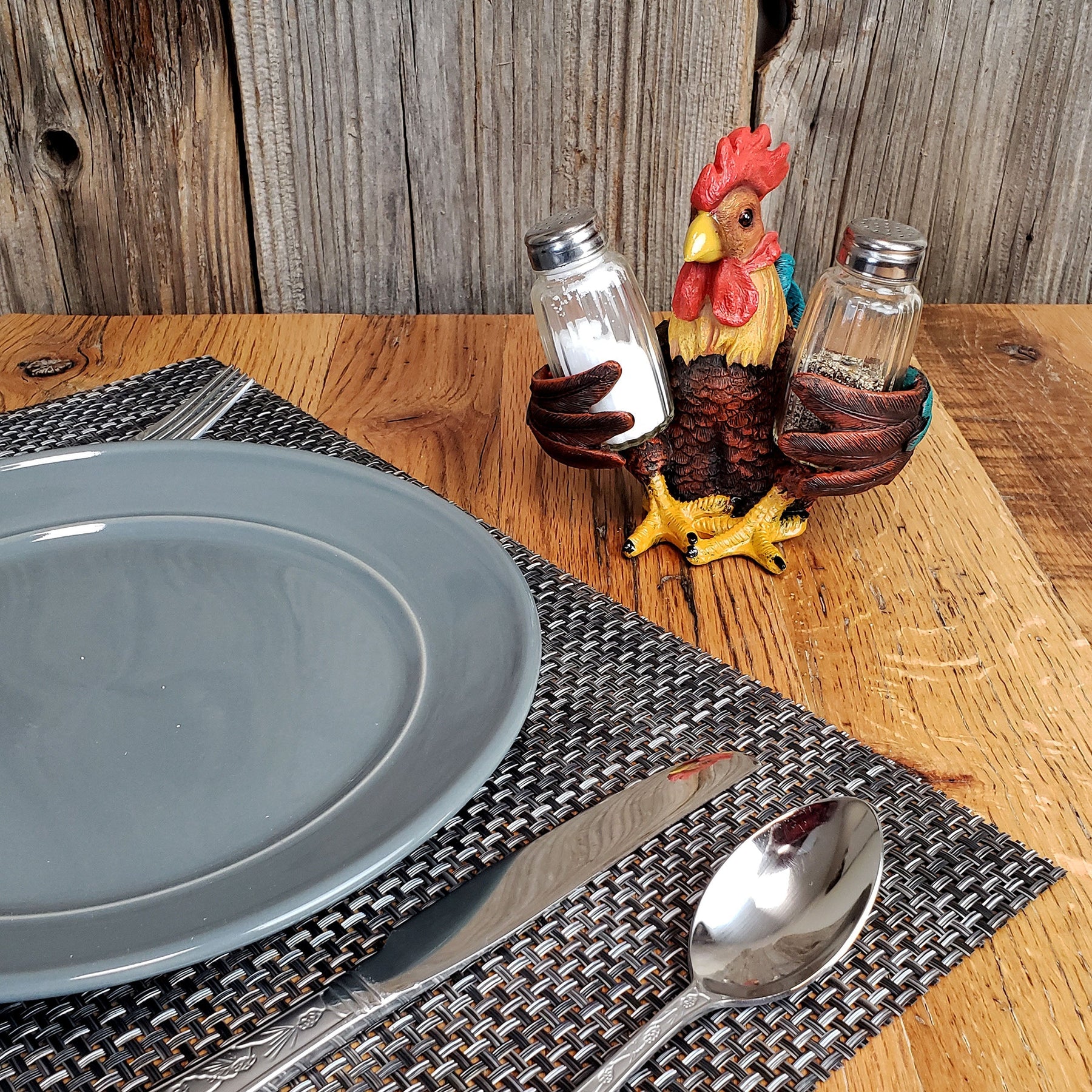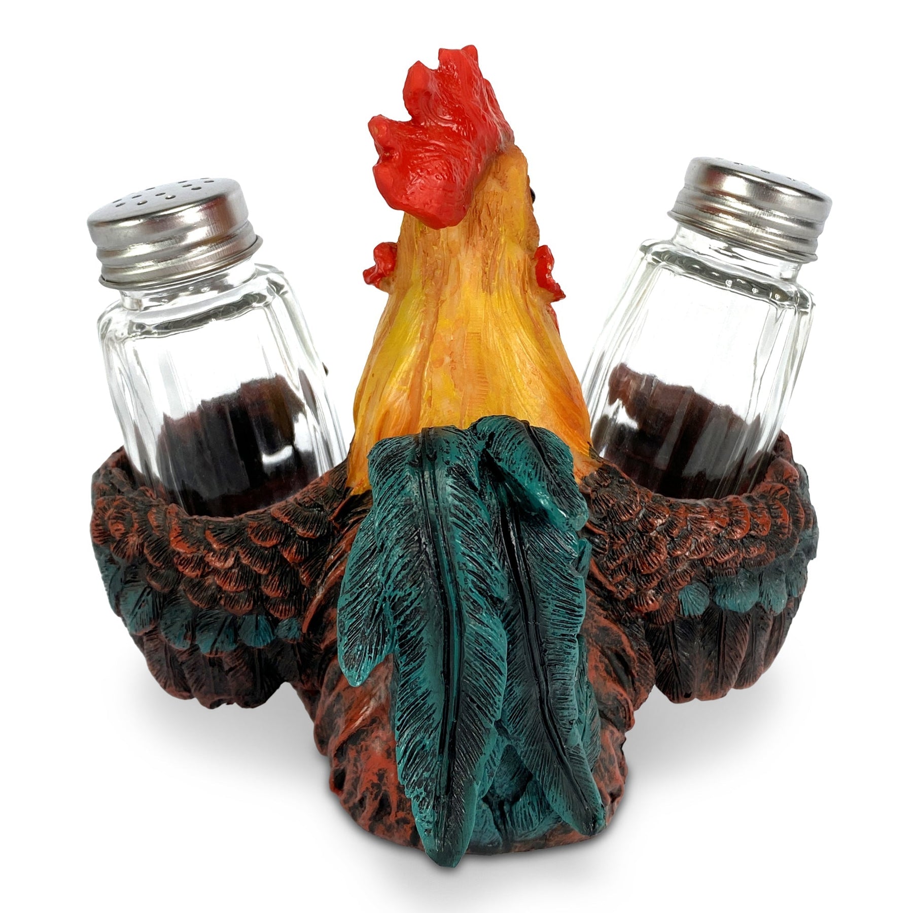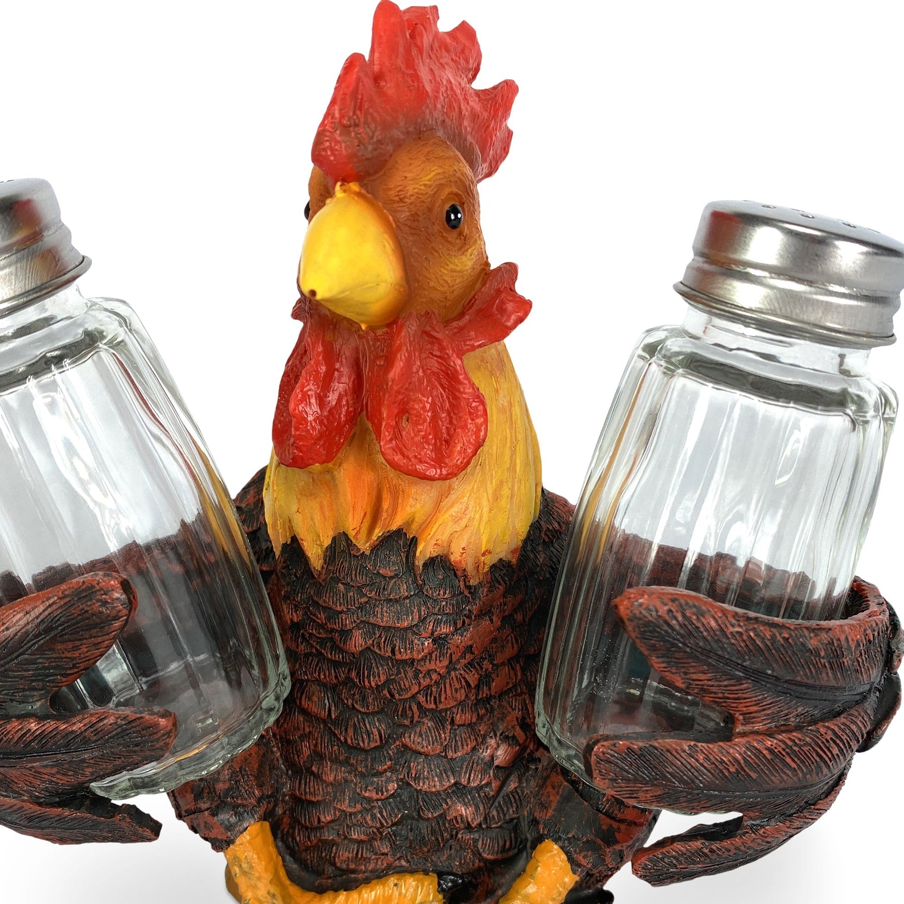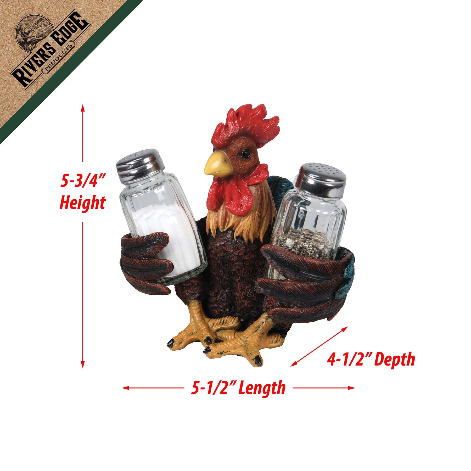 This rooster salt and pepper shaker set from Rivers Edge Products will be a welcome addition to your dining room table. The glass salt and pepper shakers fit nicely around the wings of a rooster. The rooster is hand-painted poly resin and is highly detailed and colorful. The shakers are made of clear glass so you'll never mistake salt for pepper when you season your food. The Rooster salt and pepper shakers will allow you to season your meal with style.