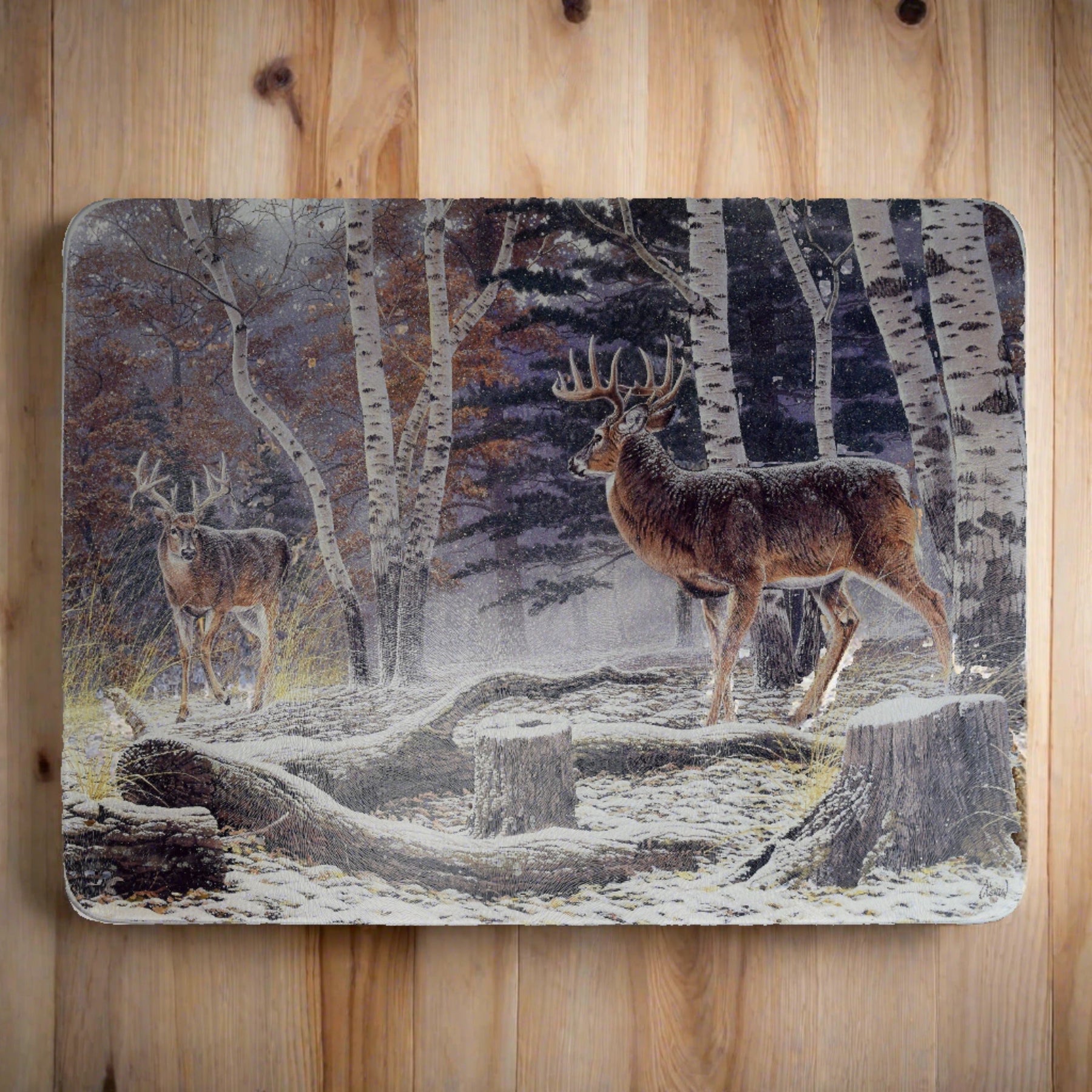 Confrontation tempered glass cutting boards from Rivers Edge Products features a two bucks and a snowy background.