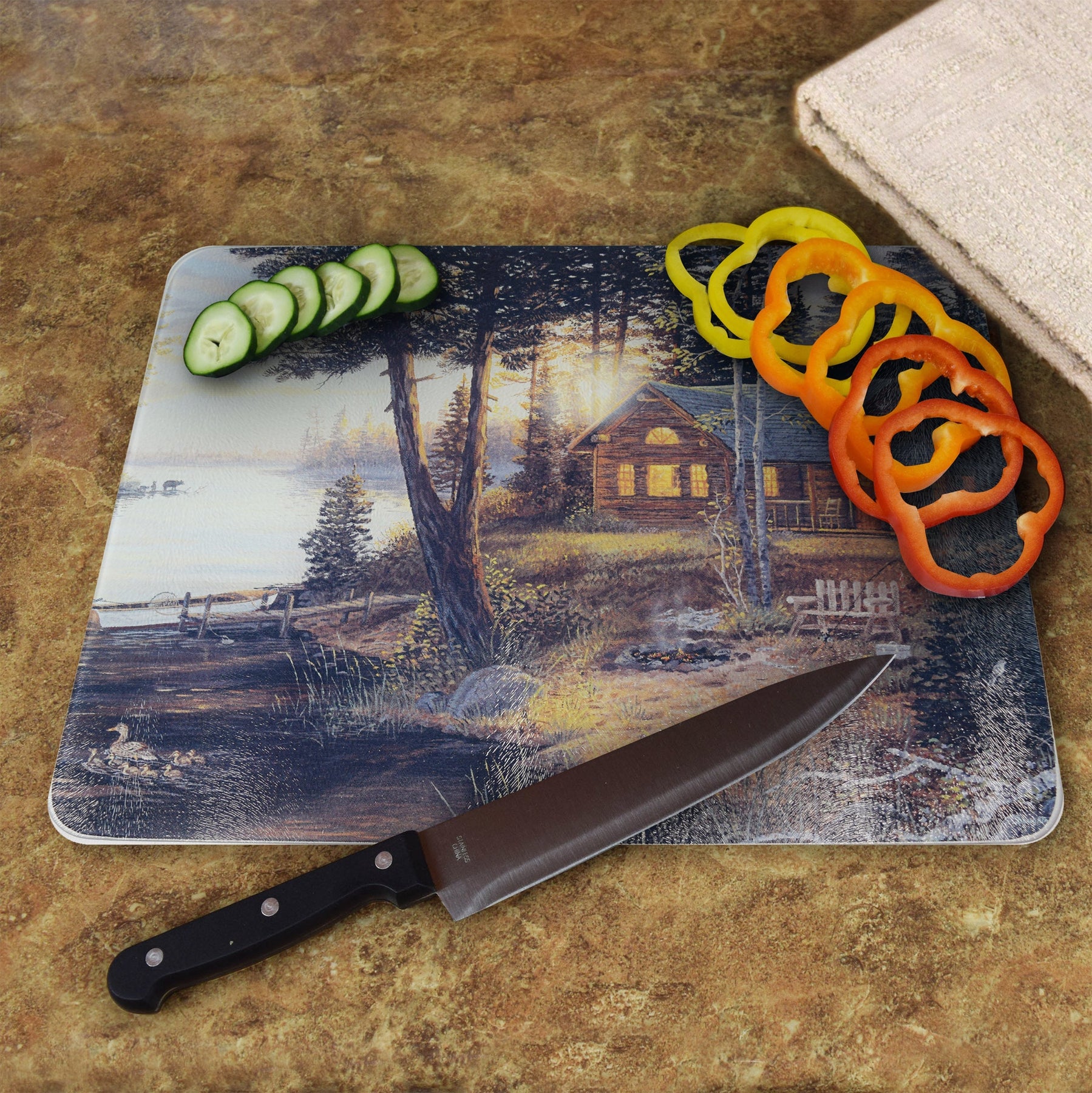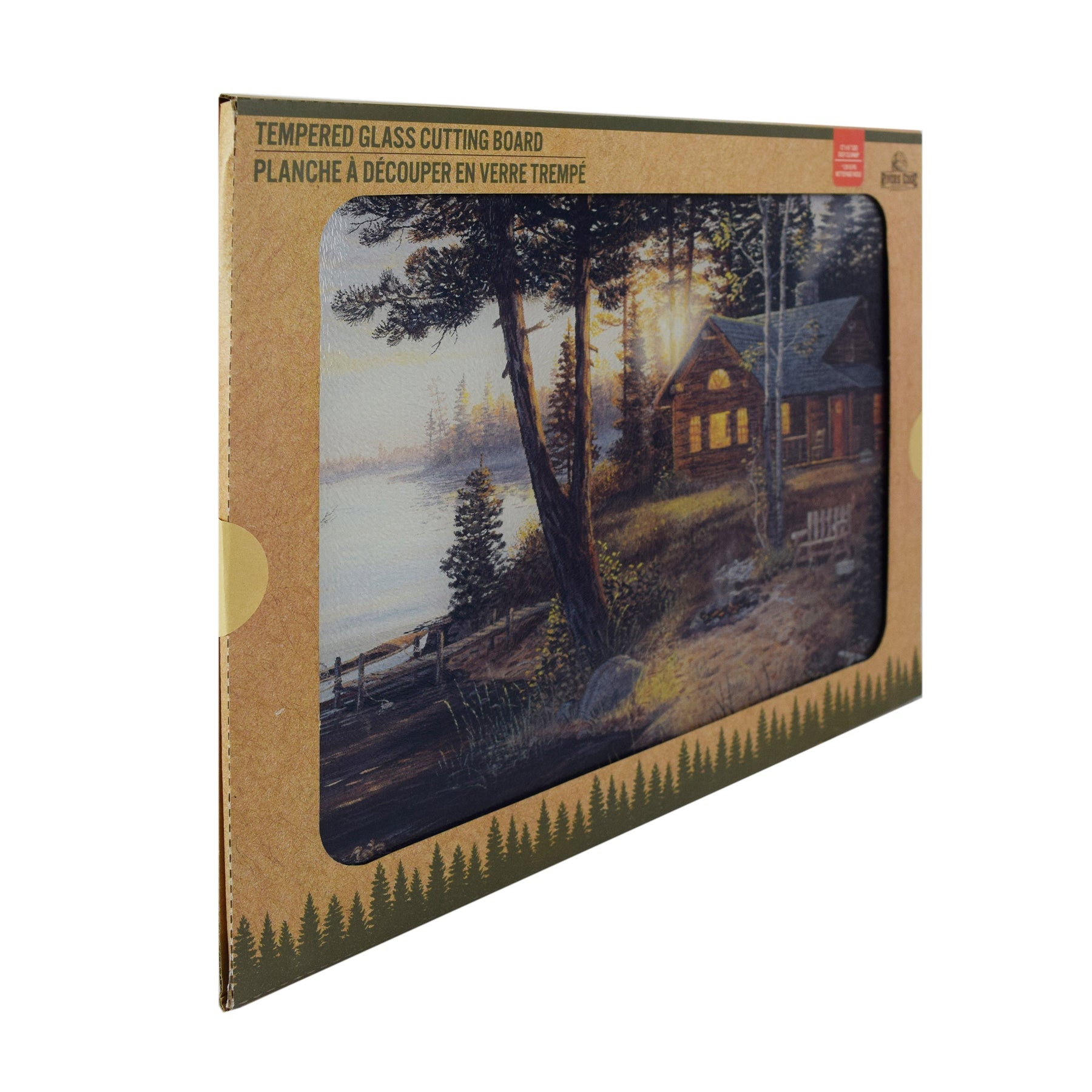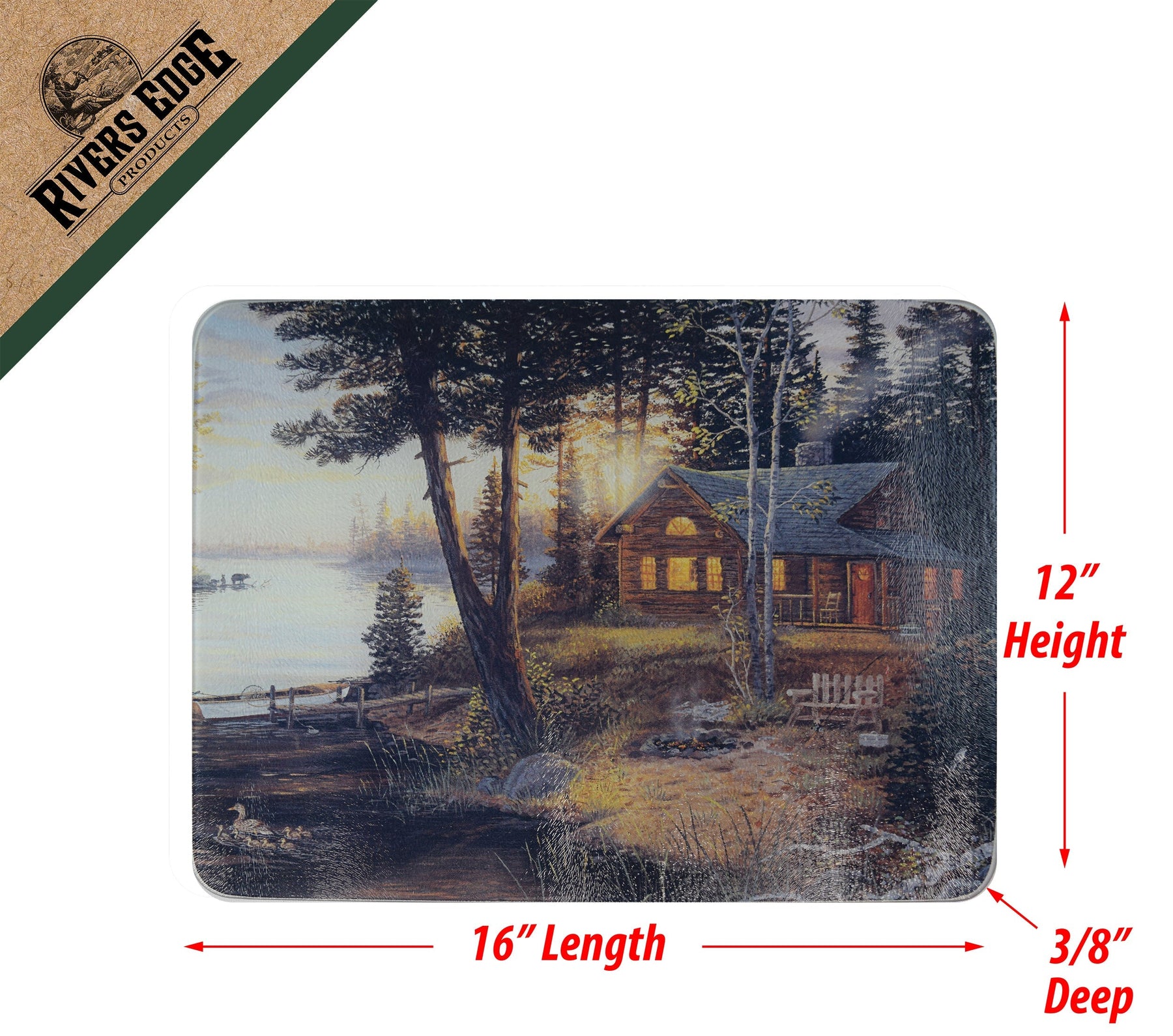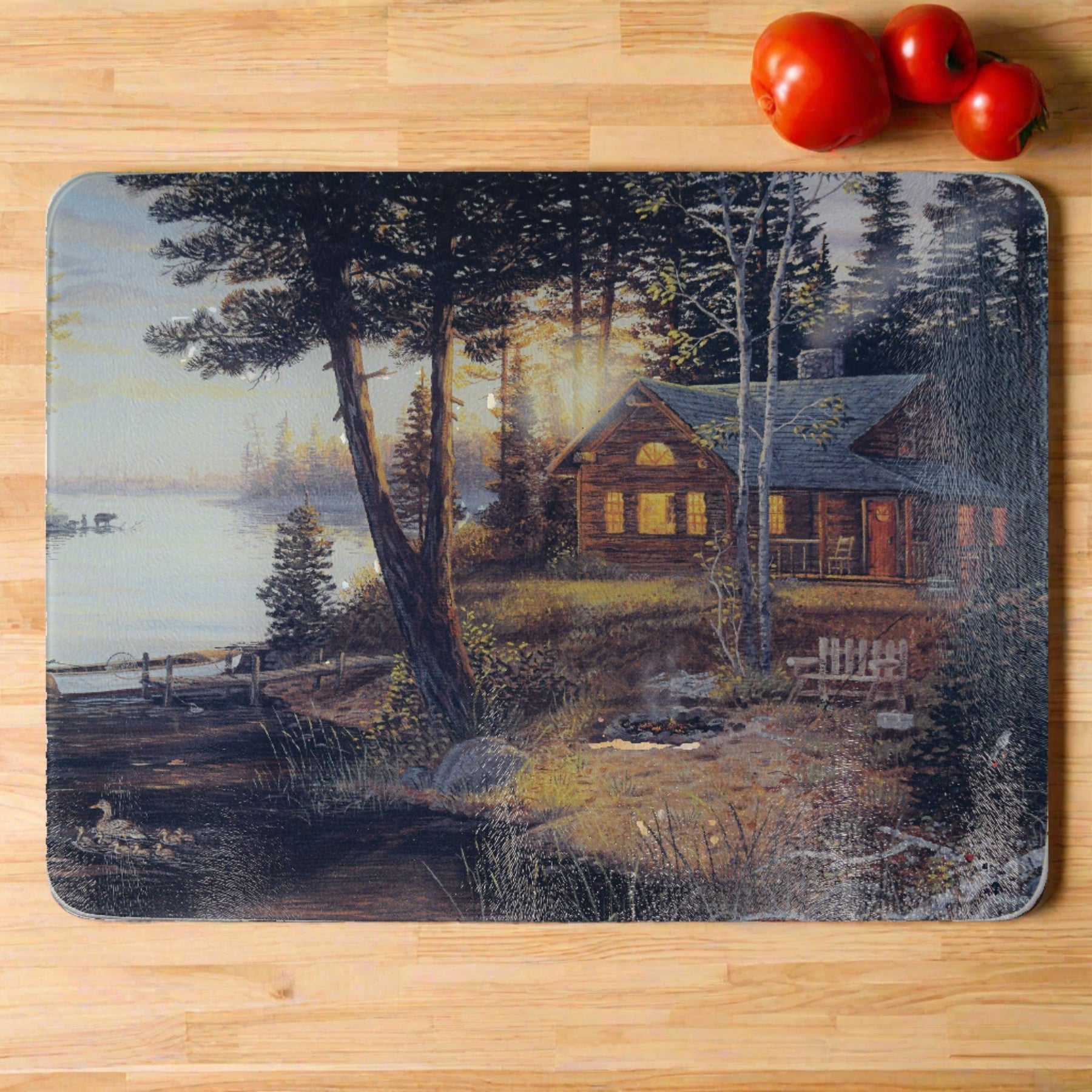 Last Embers tempered glass cutting boards from Rivers Edge Products features a cabin next to a lake.