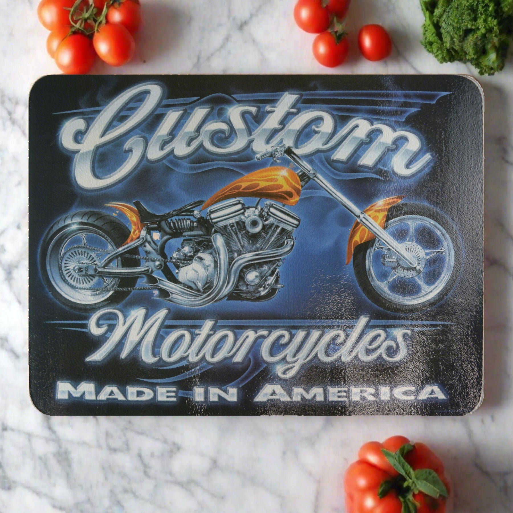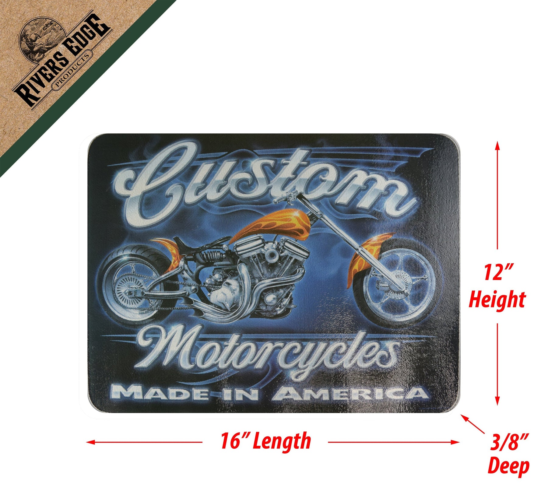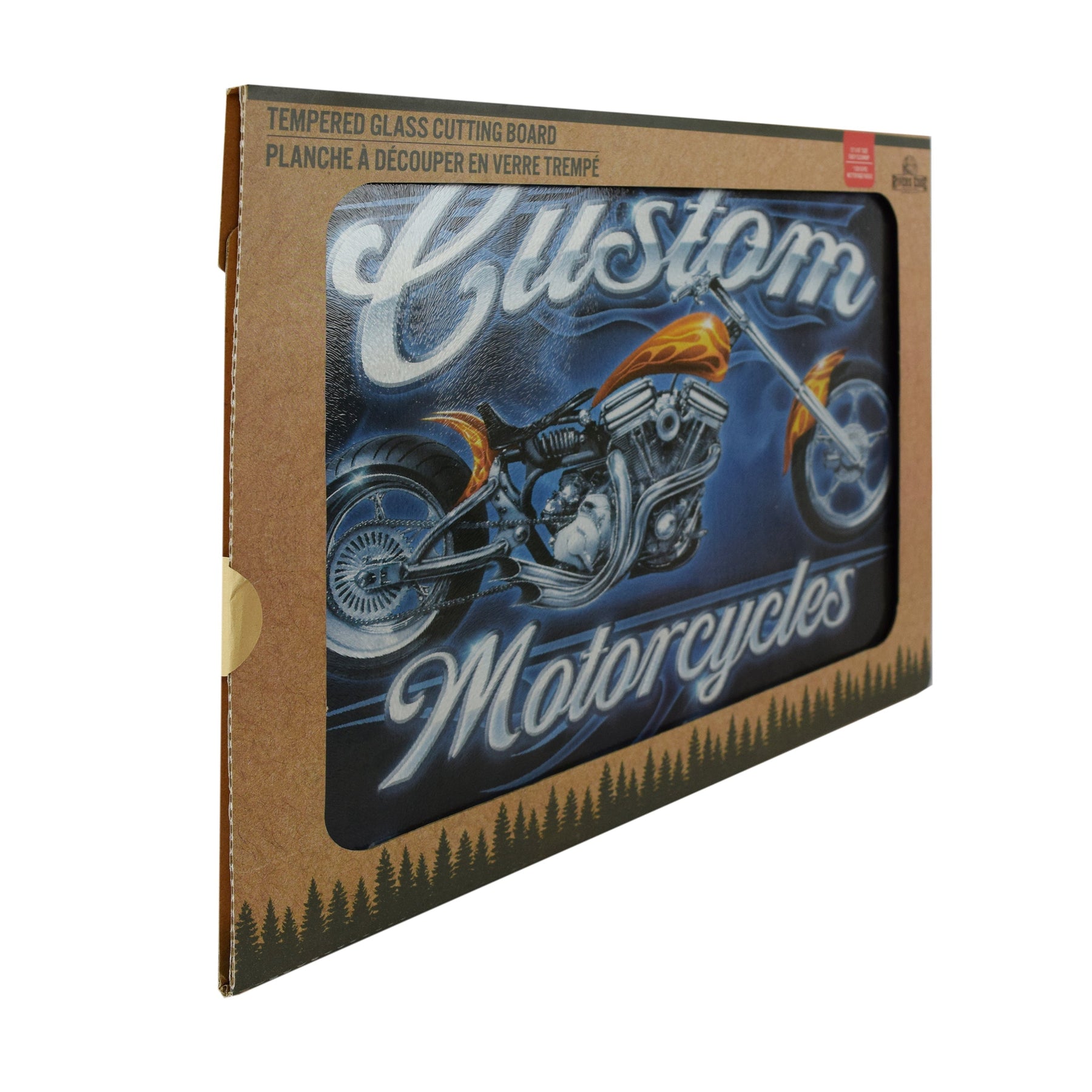 Custom motorcycles tempered glass cutting boards from Rivers Edge Products features a motorcycle.