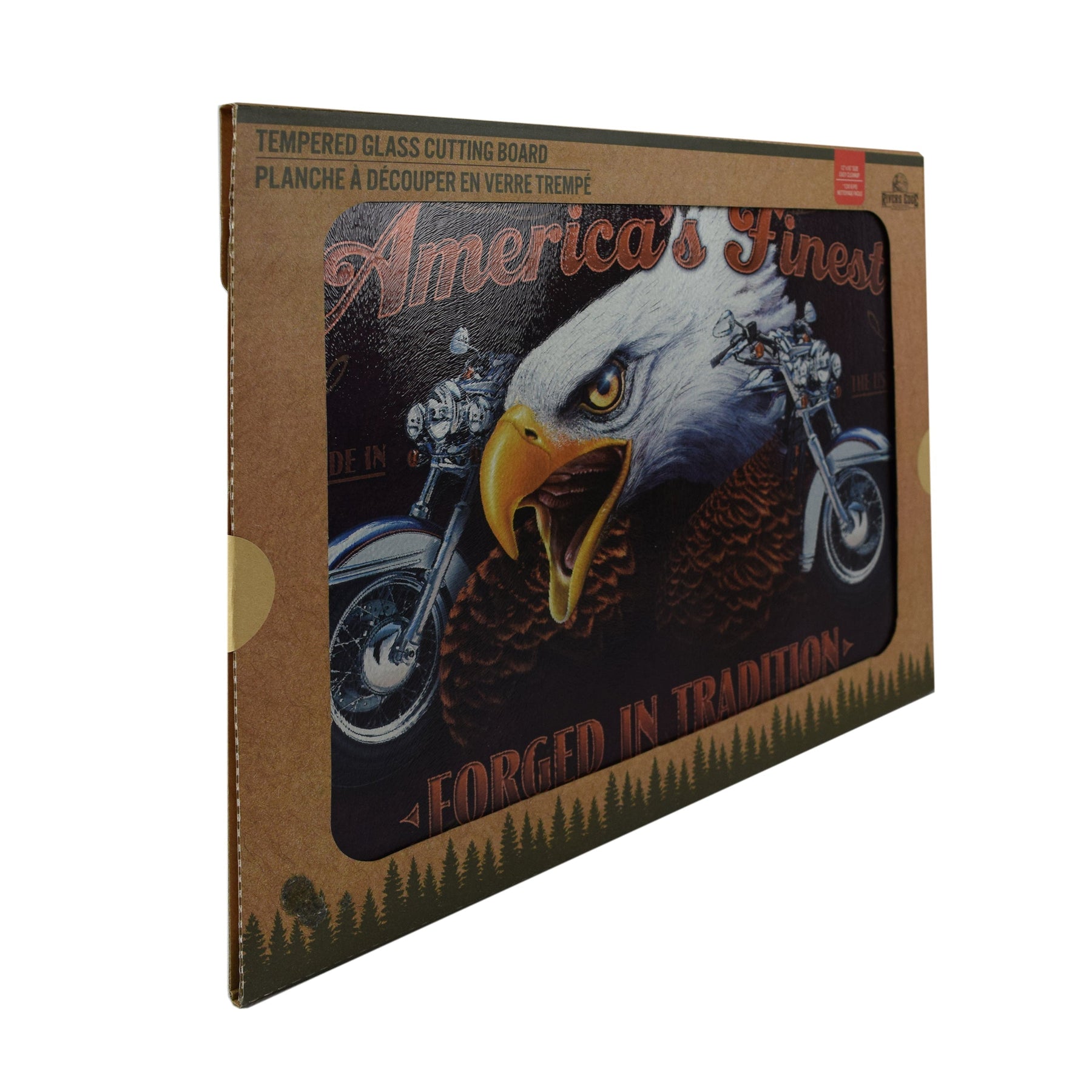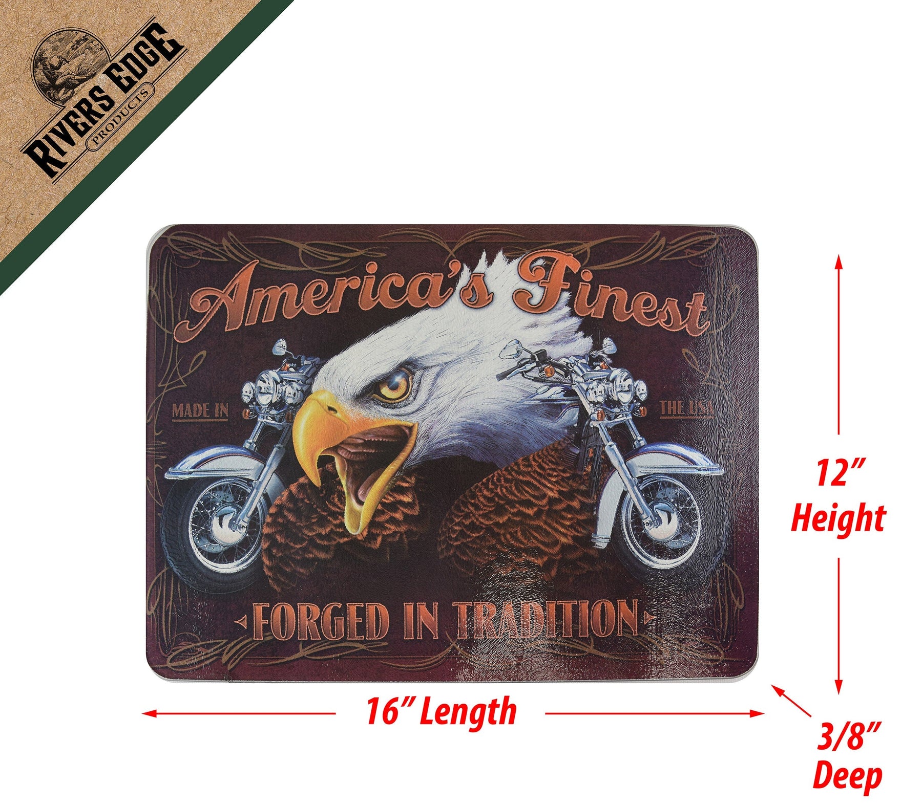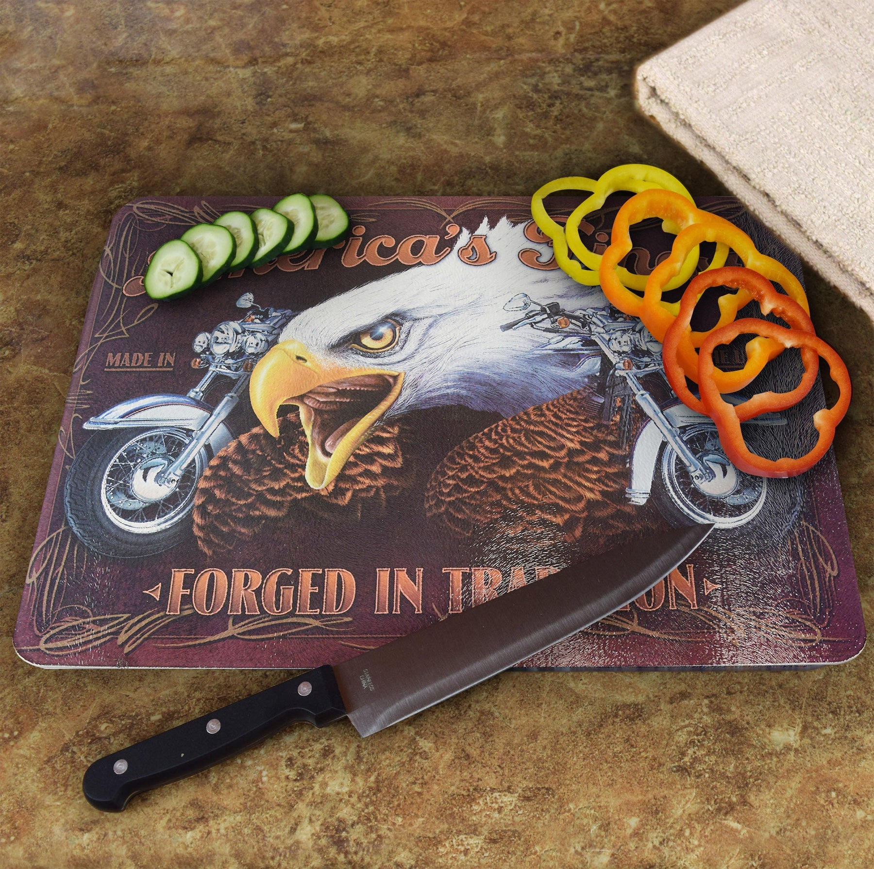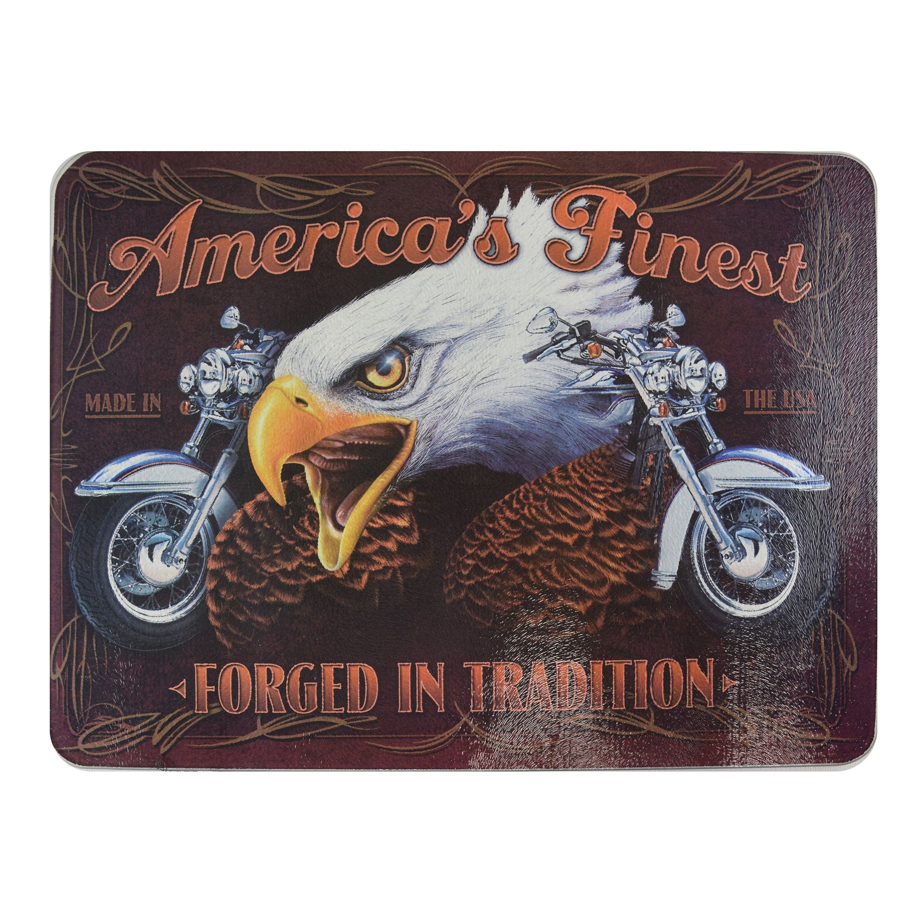America's Finest cutting board features a bald eagle and motorcycles.