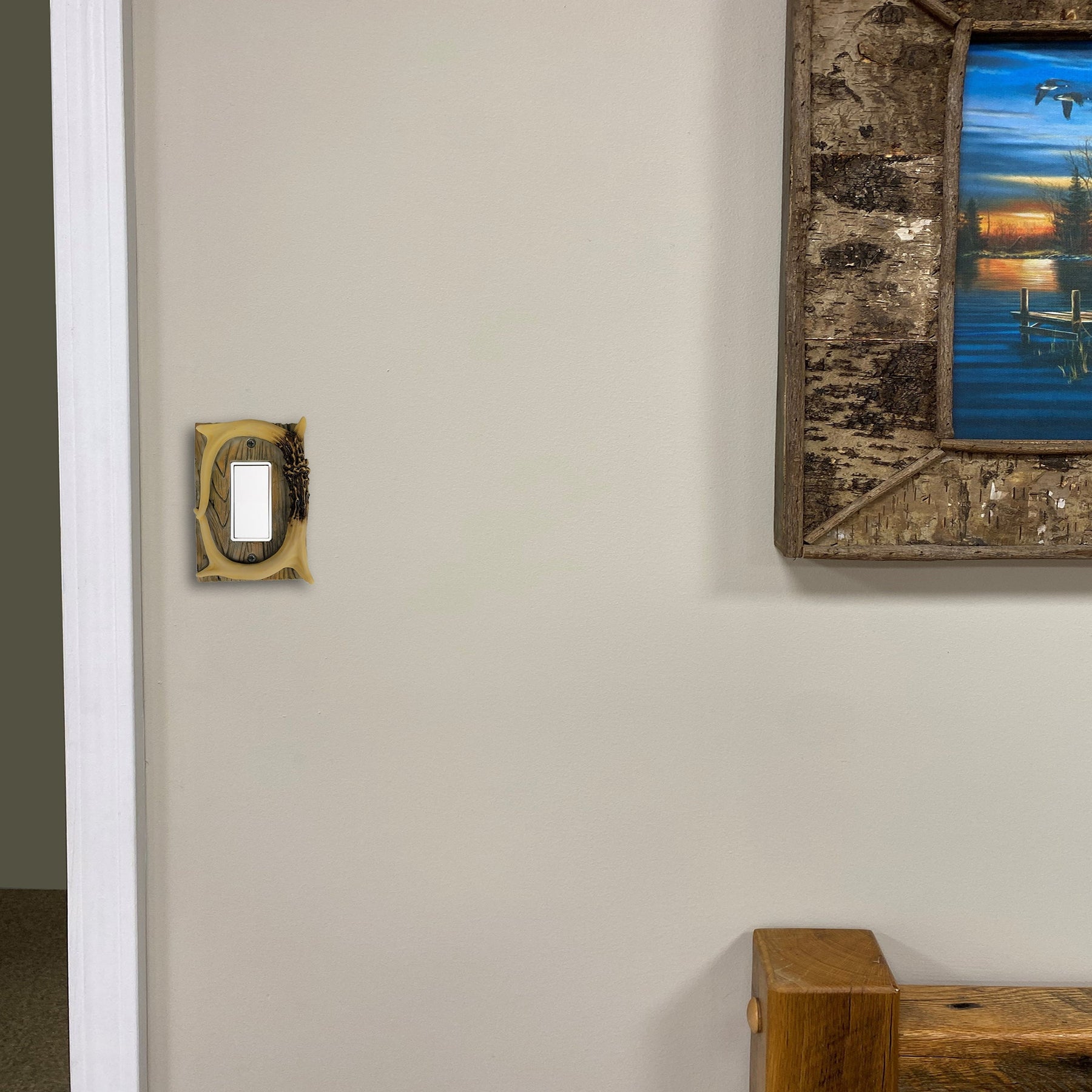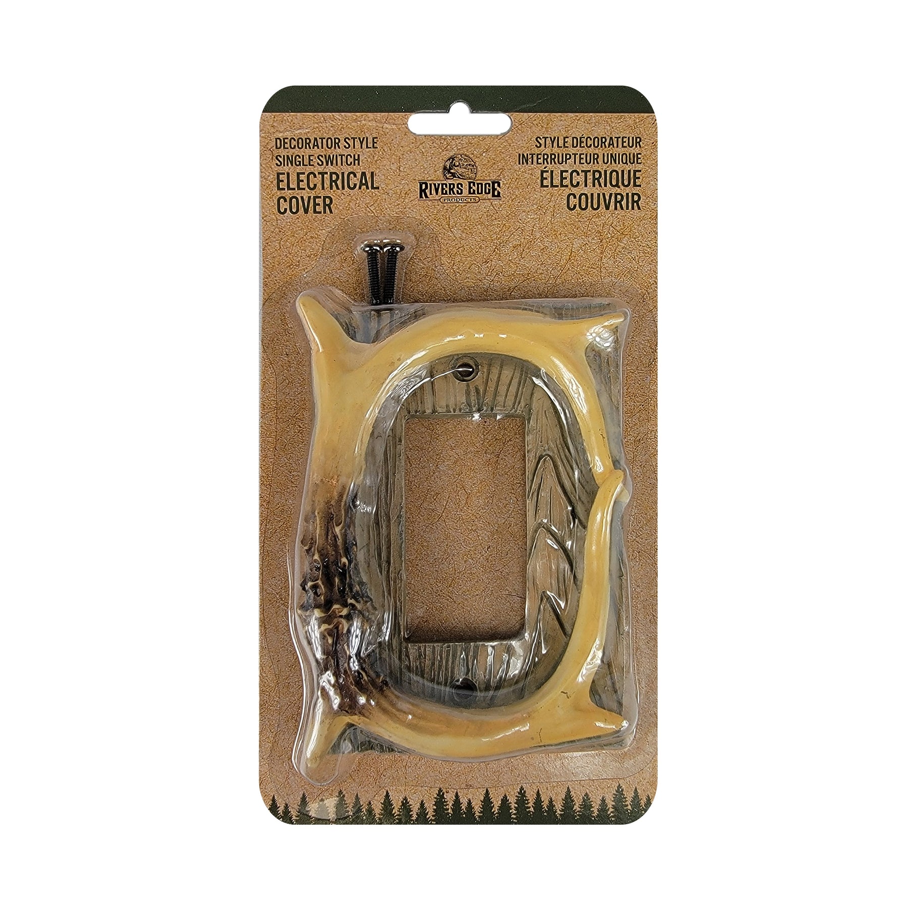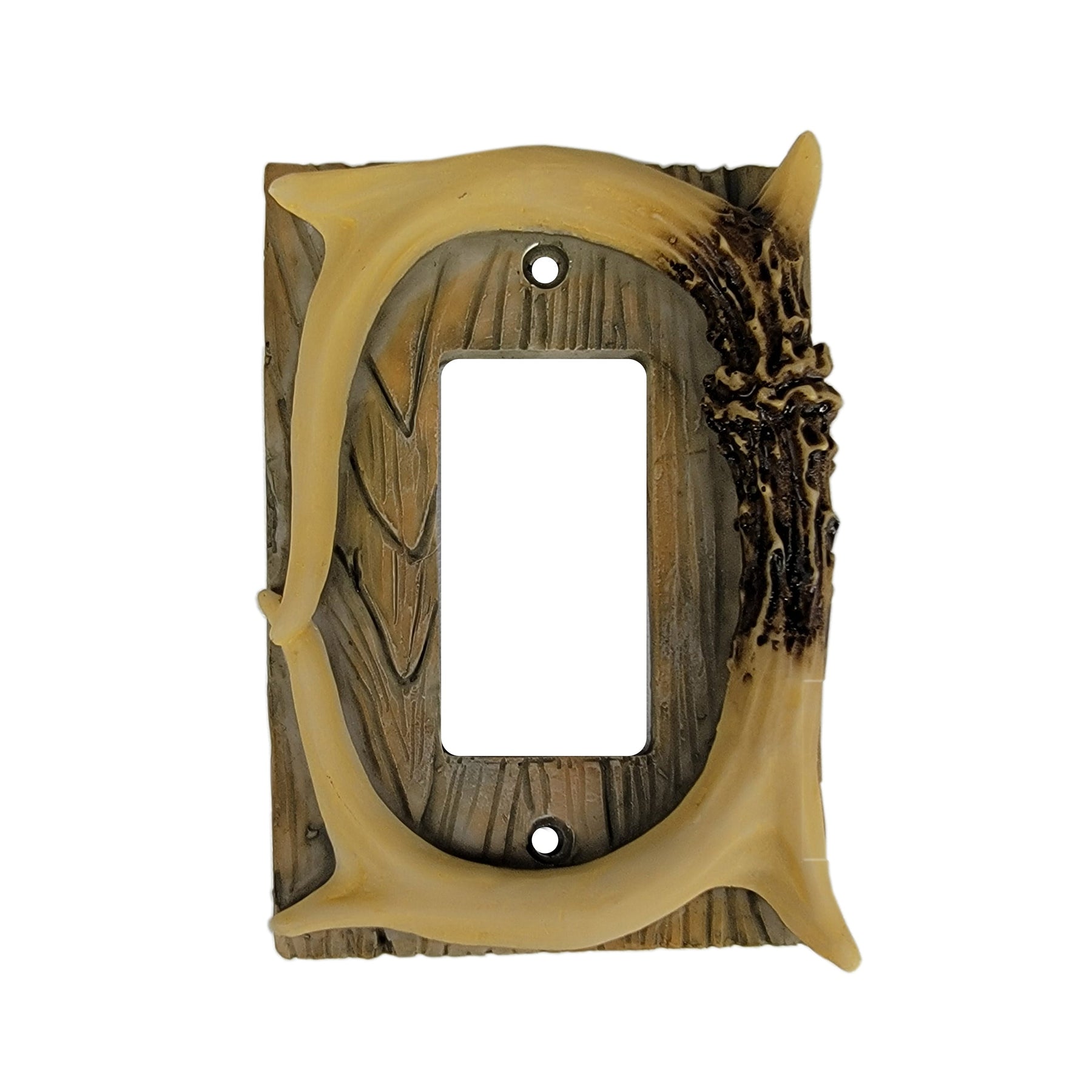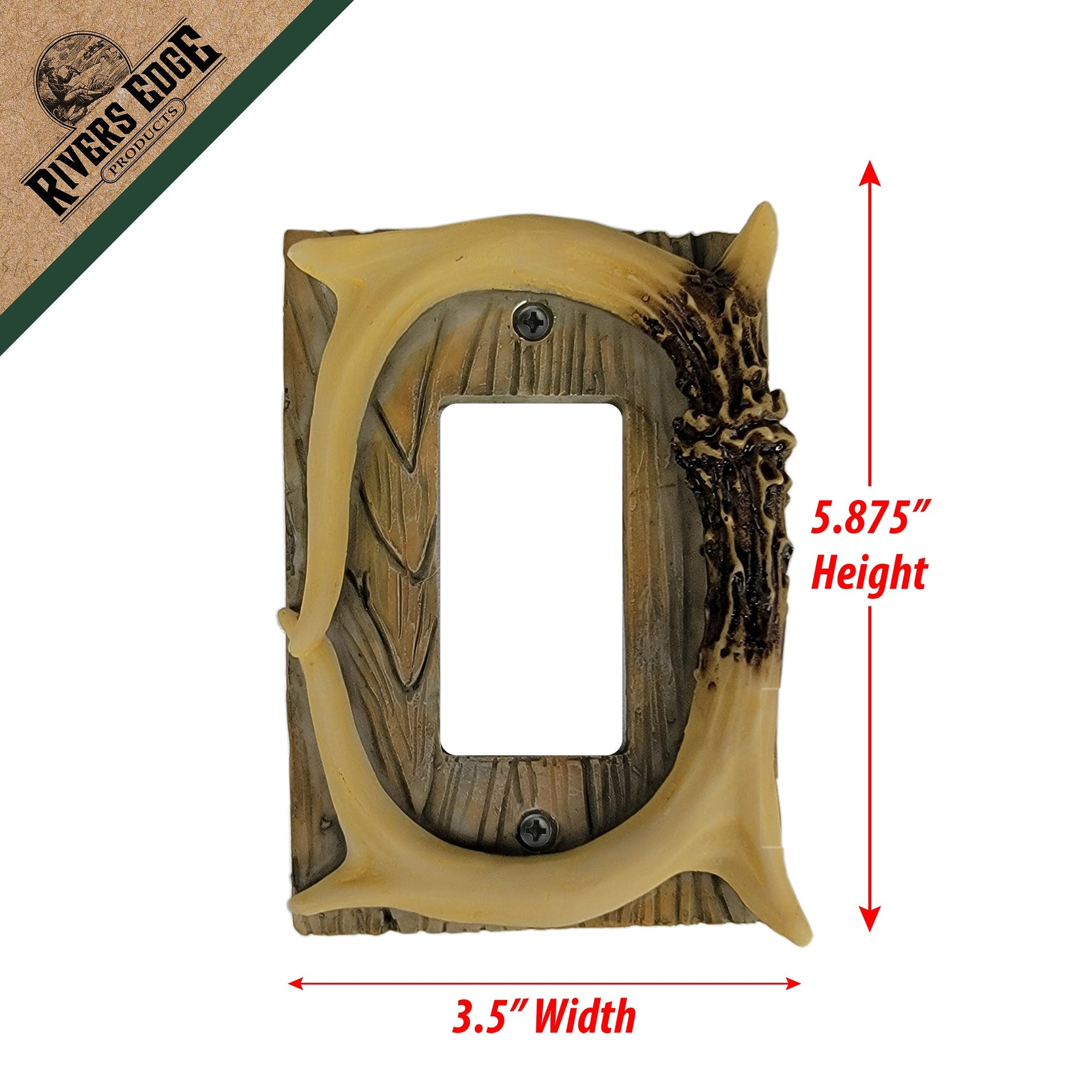 This single switch decora plate cover from Rivers Edge Products is the ideal accent to complement hunting-themed decor. Features two bone colored pieces of deer antler over a barnwood textured background. Match this with our other deer antler and barnwood wall plate covers to complete your hunting decor.