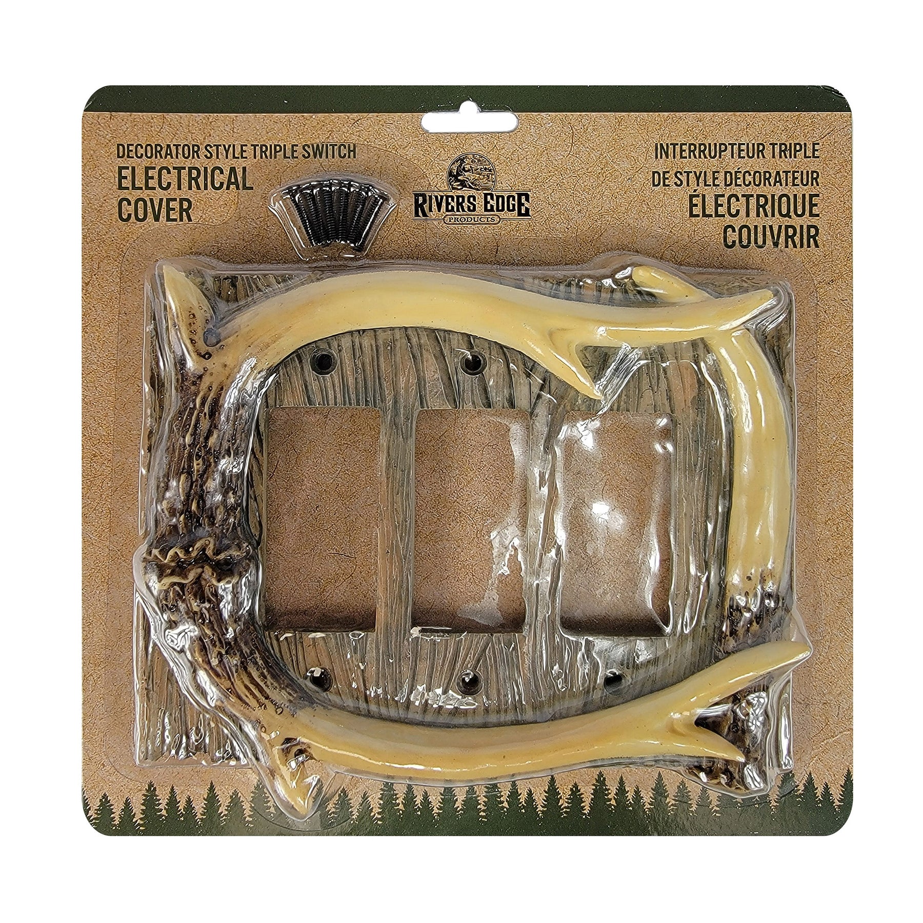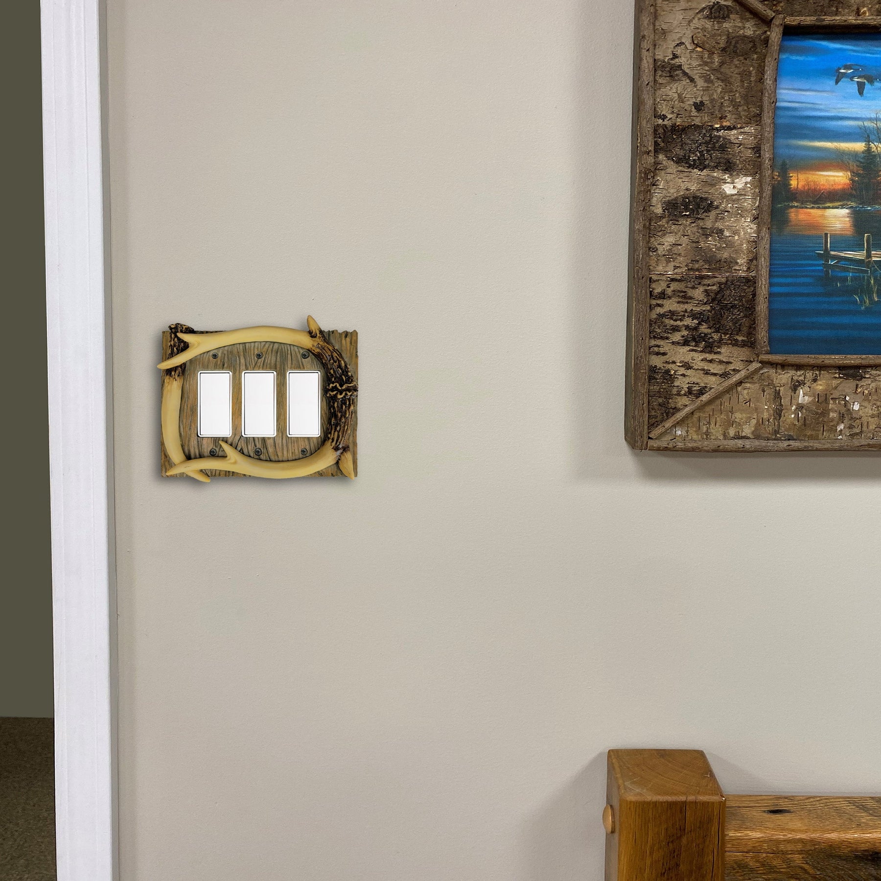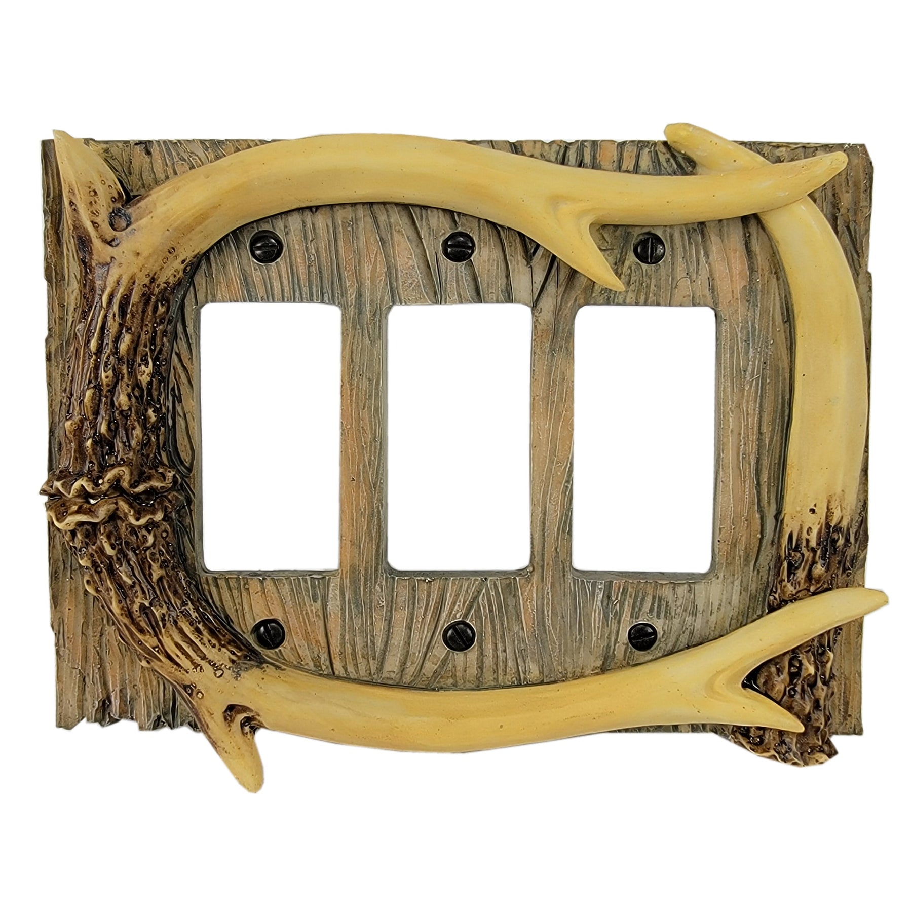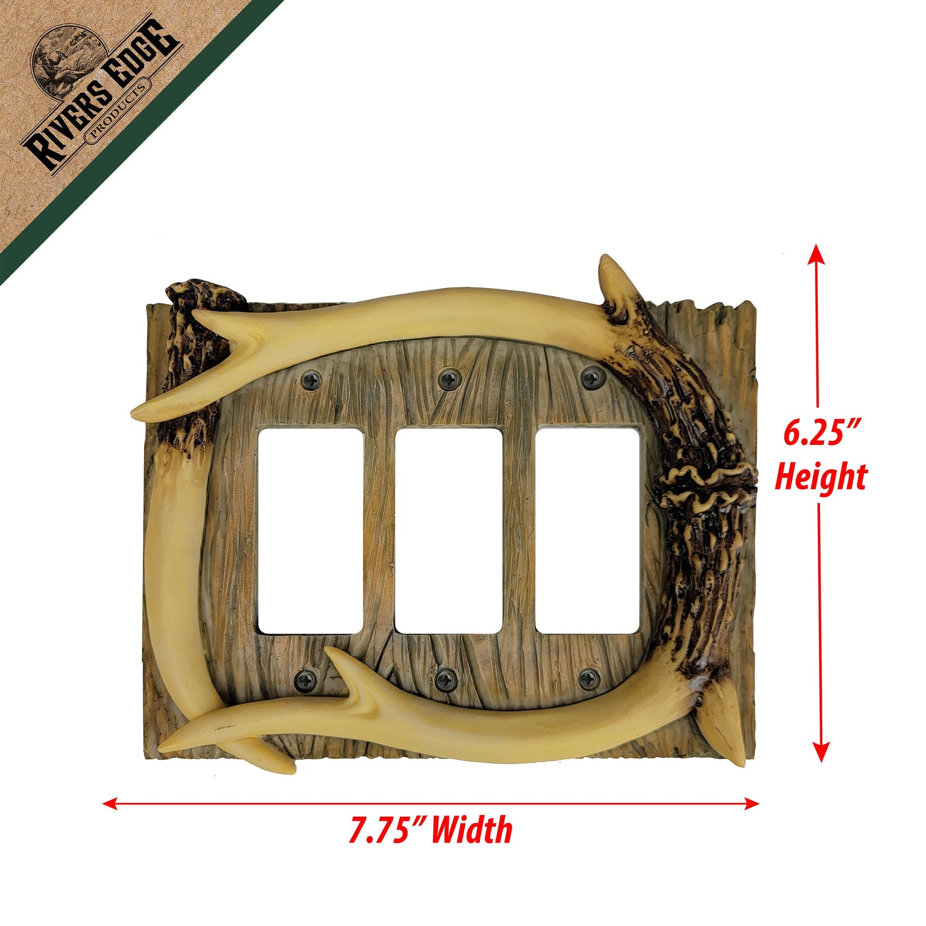 This triple switch decora plate cover from Rivers Edge Products is the ideal accent to complement hunting-themed decor. Features two bone colored pieces of deer antler over a barnwood textured background. Match this with our other deer antler and barnwood wall plate covers to complete your hunting decor.