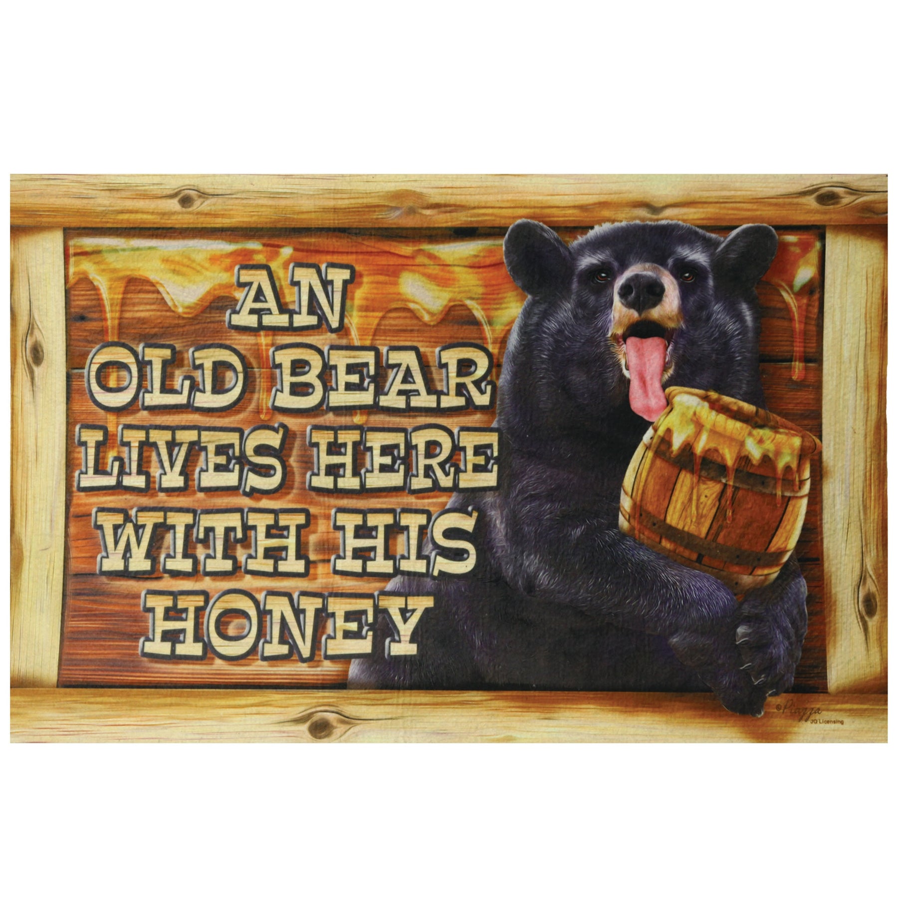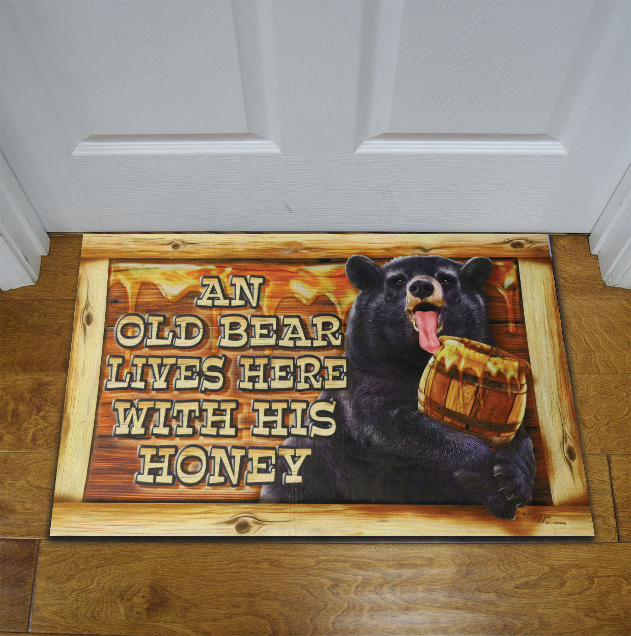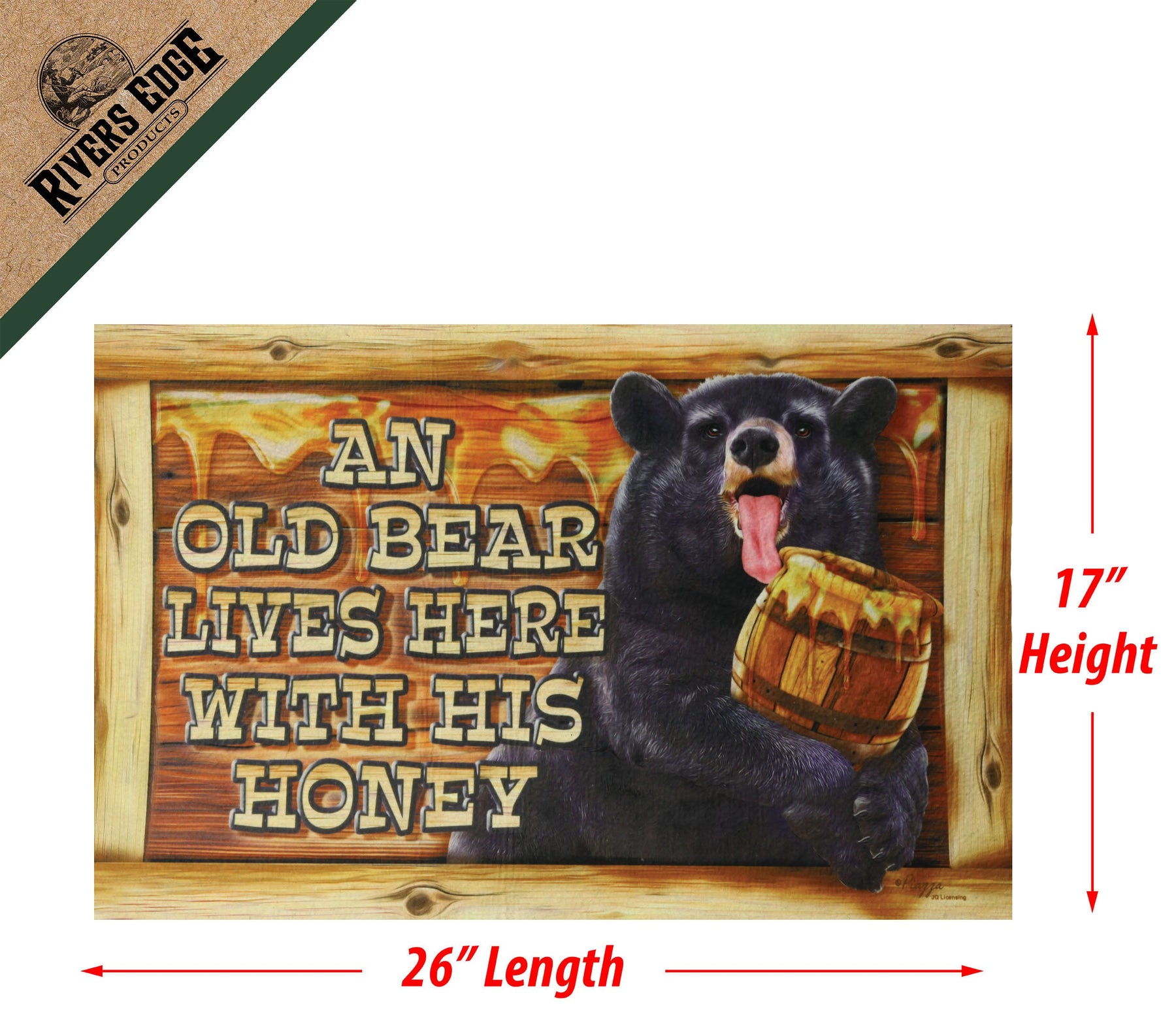 The rubber door mats from Rivers Edge Products features a black bear holding a jar of honey. These mats are for indoor or outdoor use.