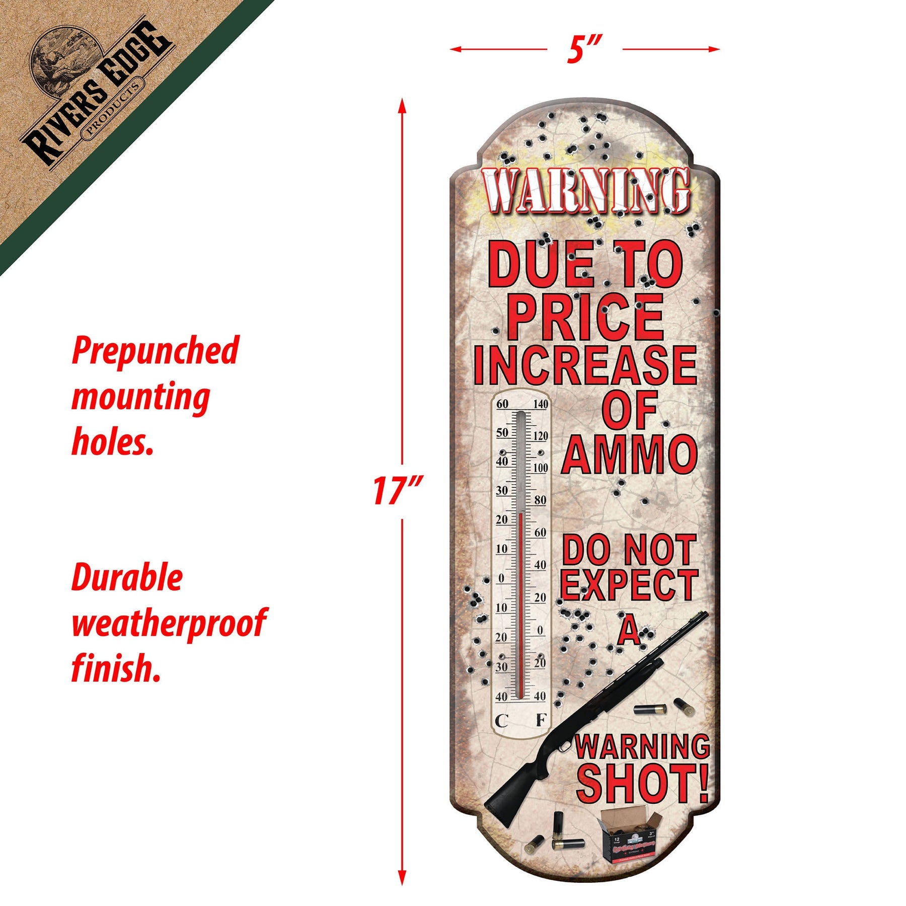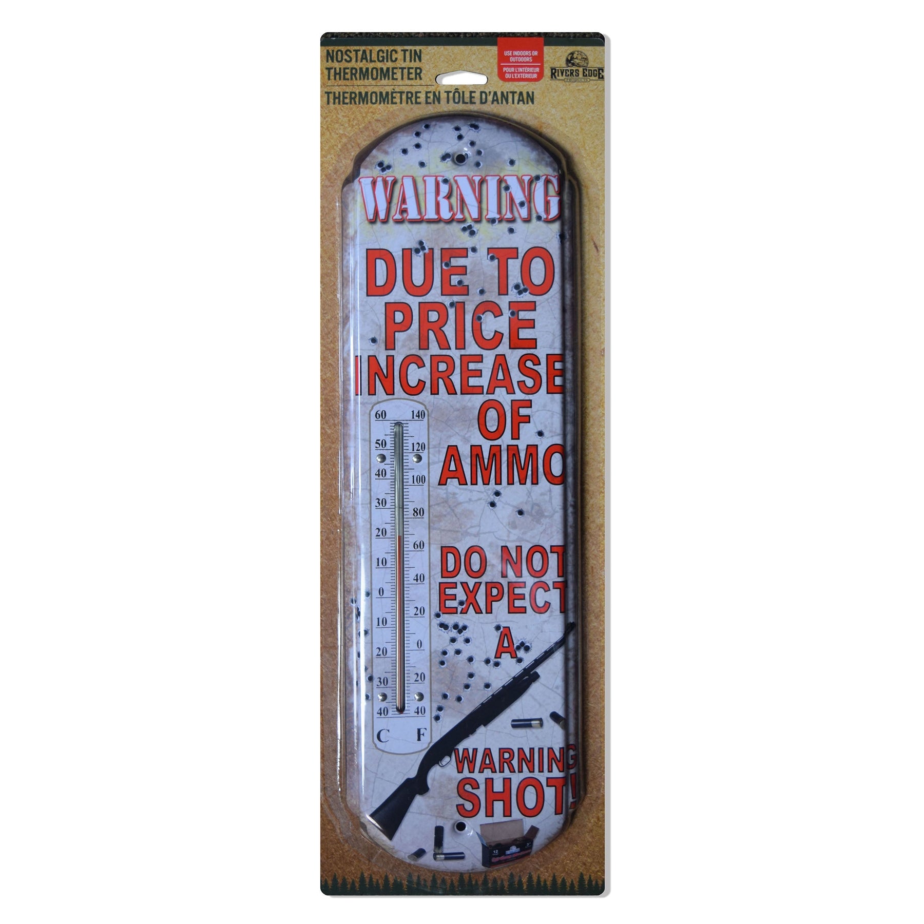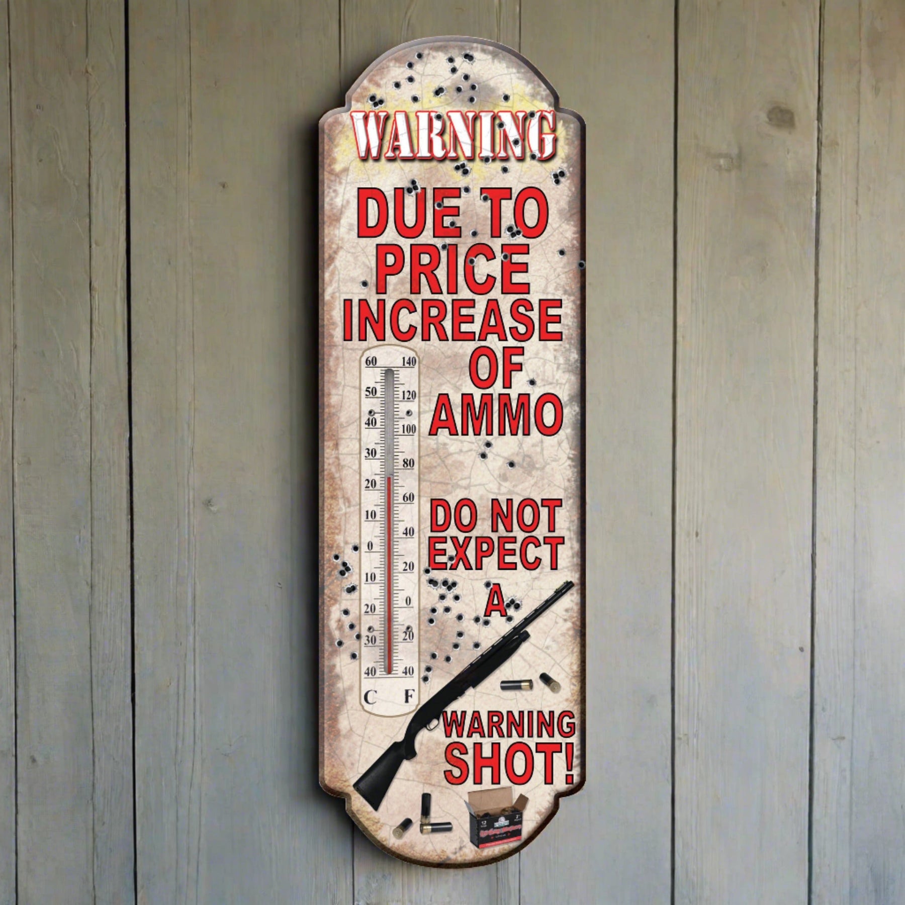 Featuring great licensed art showcasing a shotgun and holes in the thermometer with the saying "WARNING Due to Price Increase Do Not Expect A Warning Shot." Show trespassers that you mean serious business with this thermometer.