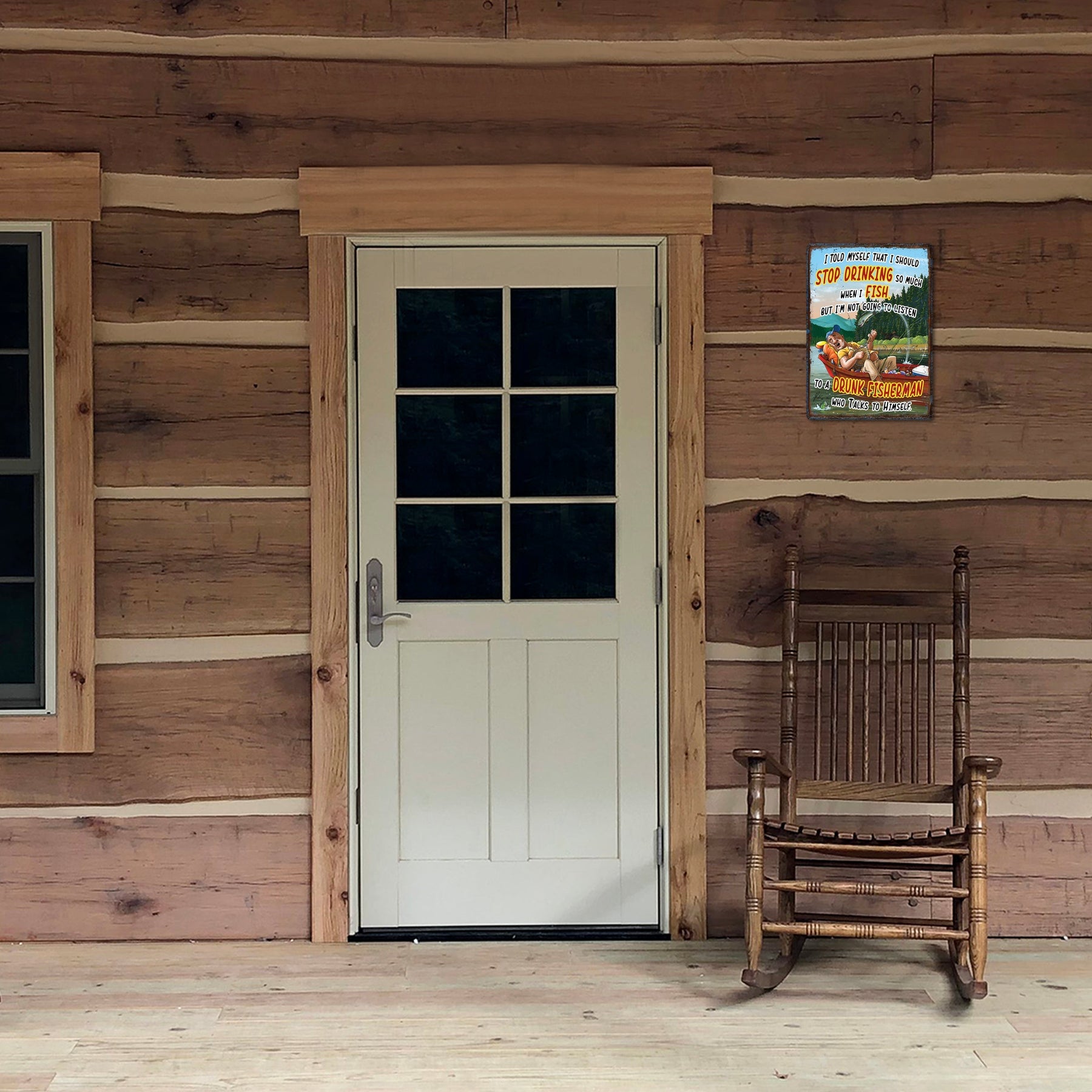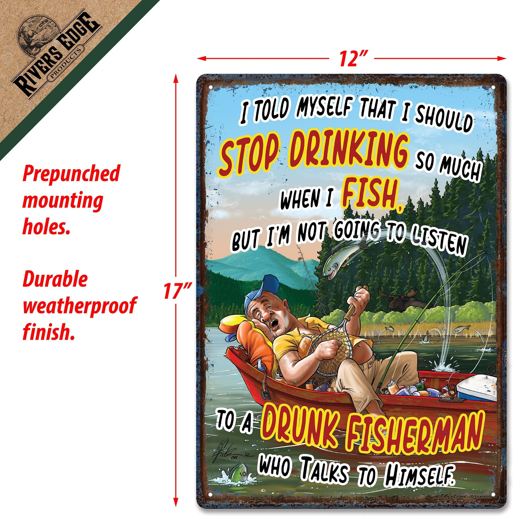 Here's some sound advice for a beer drinking fishing buddy! This metal tin sign from Rivers Edge Products is ideal wall decor for anyone with a sense of humor. Customize your garage, home bar, or living space with this expressive tin sign.