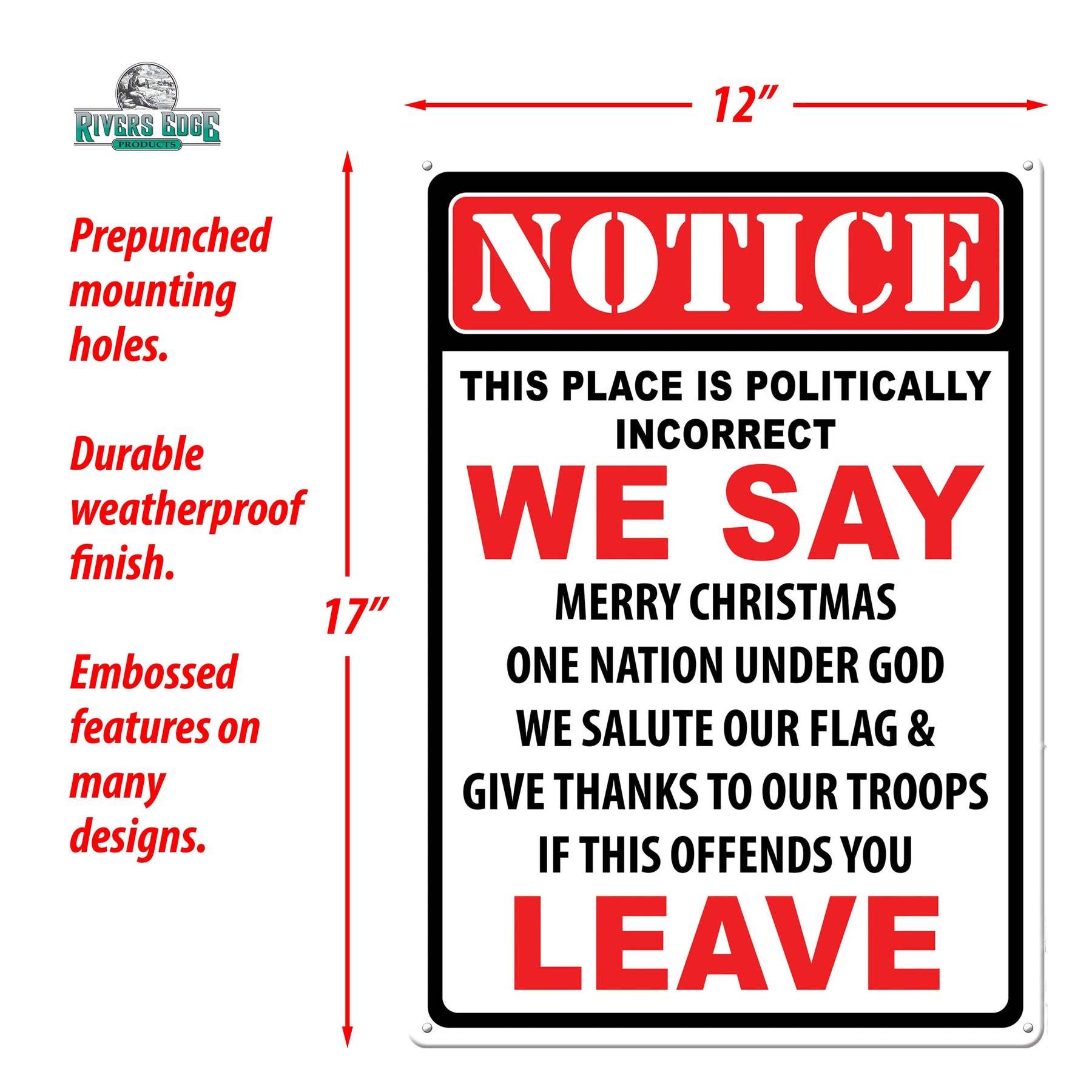 Let everyone know you still observe traditions and support those that protect us! This metal tin sign from Rivers Edge Products is ideal wall decor for the politically incorrect. Customize your garage, home bar, or living space with this funny tin sign.