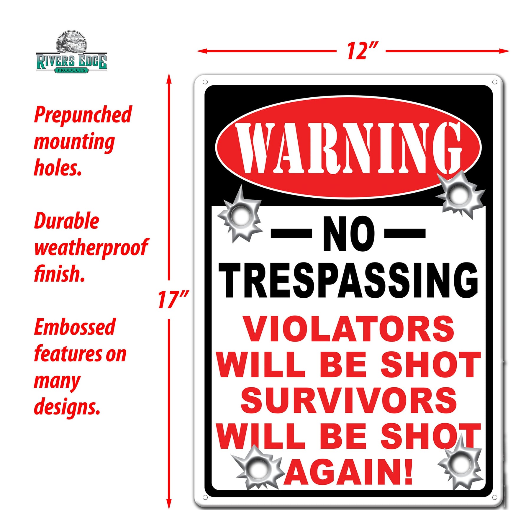 Warn trespassers. This metal tin sign from Rivers Edge Products is ideal wall decor for 2nd Amendment supporters with a sense of humor. Customize your garage, home bar, or living space with this expressive tin sign.