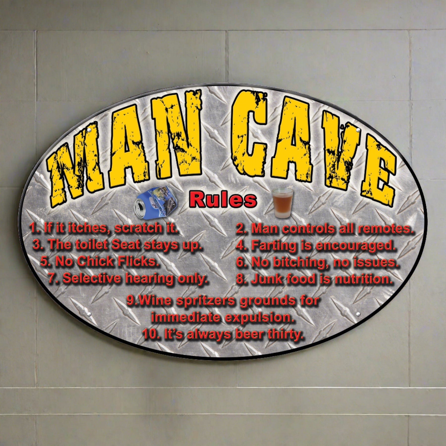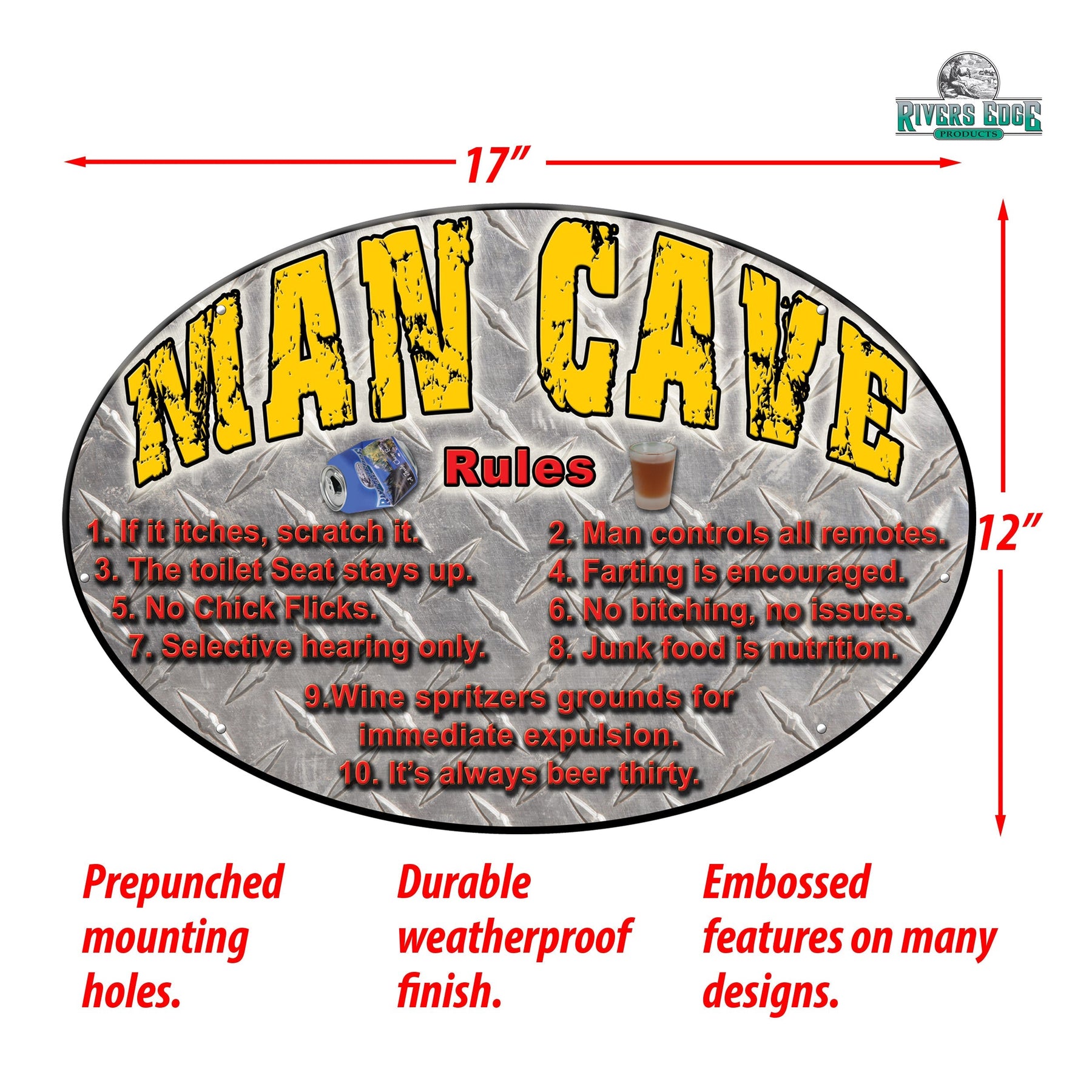 Attention all in the man cave! This metal tin sign from Rivers Edge Products is ideal wall decor for outdoor enthusiasts with a sense of humor. Customize your garage, home bar, or living space with this funny tin sign.