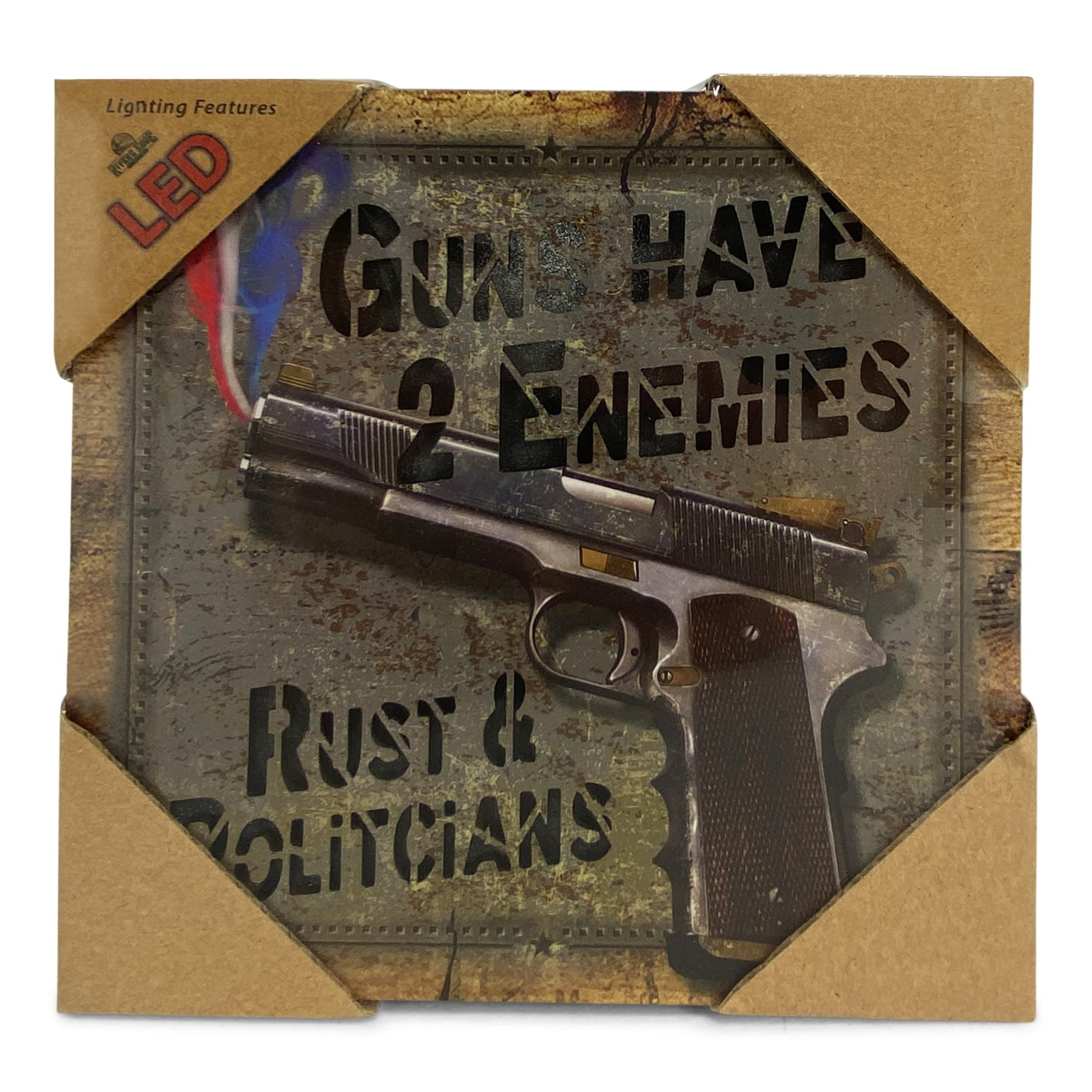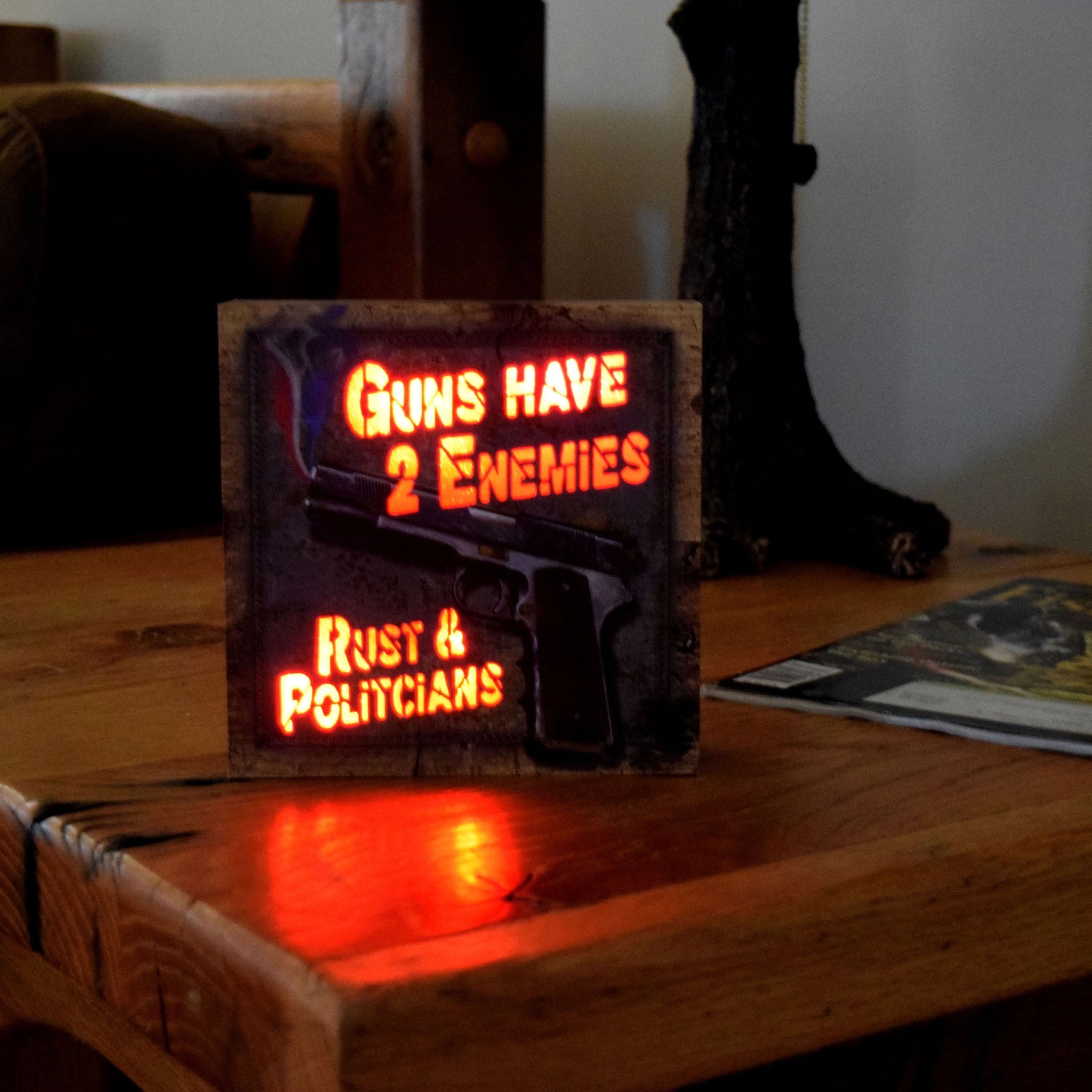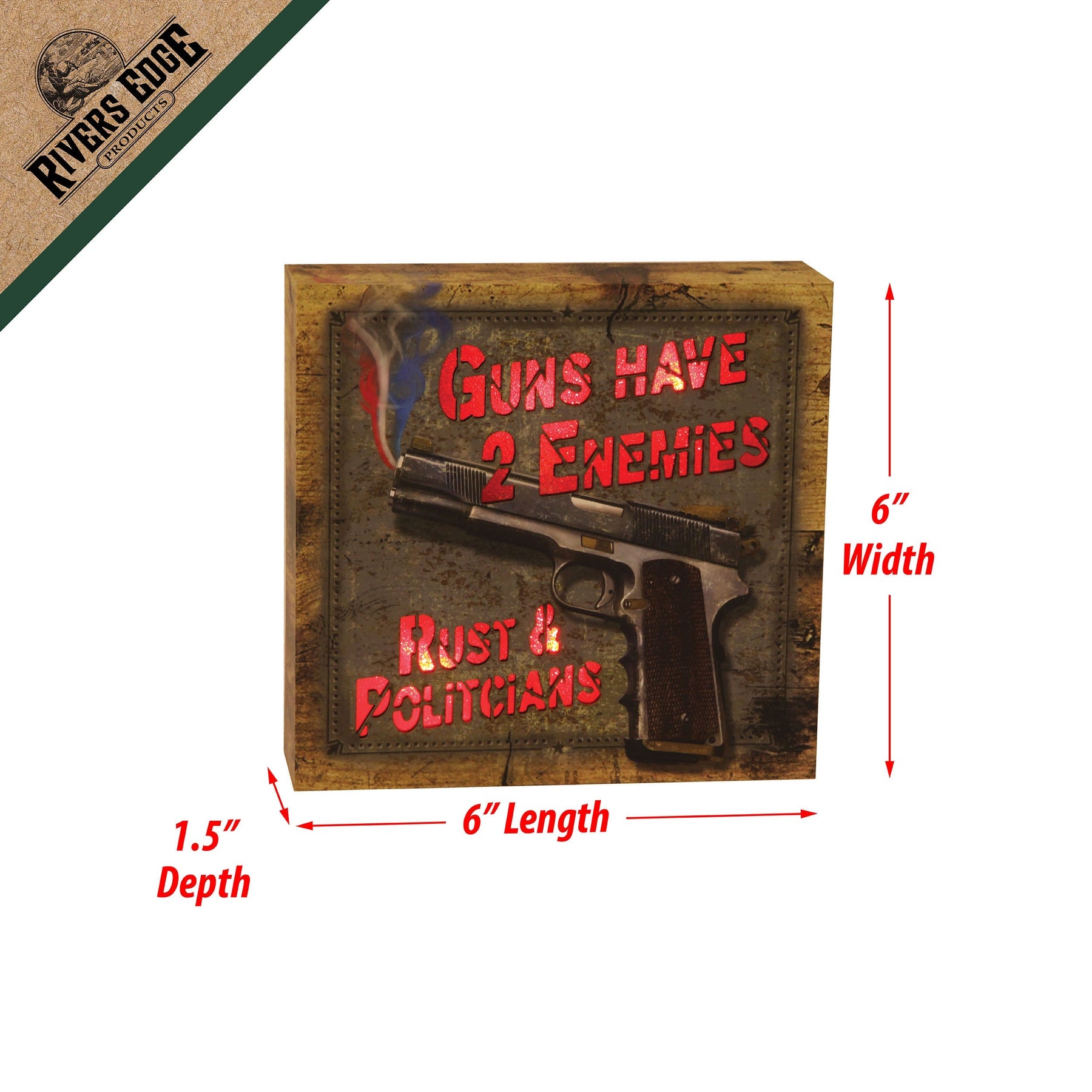 The rust & politicians LED box from River's Edge Products feature great art and messages that any outdoor enthusiast can identify with. The artwork showcases a smoking handgun barrel with the lighted message "Guns Have 2 Enemies, Rust & Politicians." Makes for a perfect gift idea for any outdoor enthusiast.