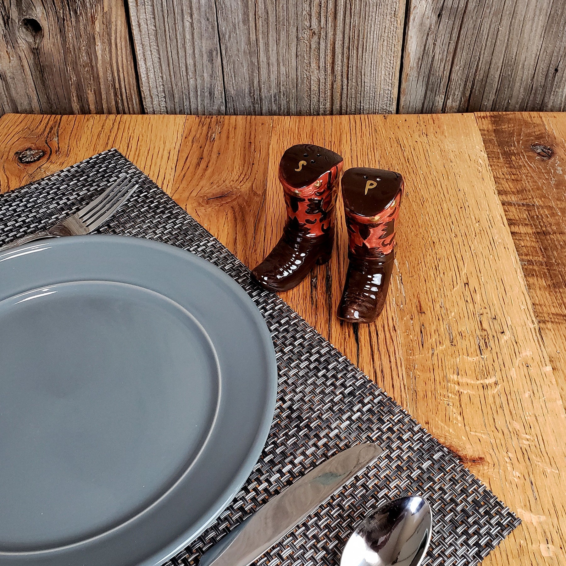 These cowboy boots salt and pepper shakers from Rivers Edge Products are sold as a matching pair and will be a welcome addition to your dining room table. These salt and pepper shakers are made of ceramic and are designed to resemble a pair of black and brown cowboy boots with spurs and gold stars on them. One shaker has three holes and the other has two holes so you'll never be mistaken when you season your food. The Cowboy Boots salt and pepper shakers will allow you to season your meal with style.