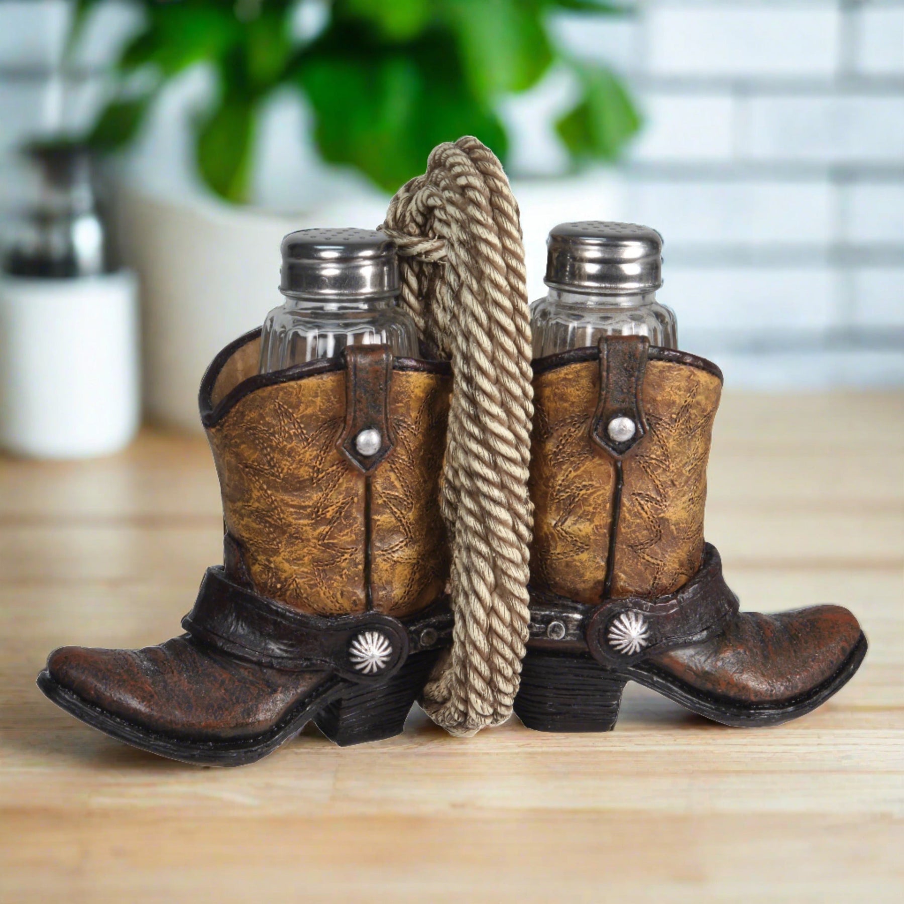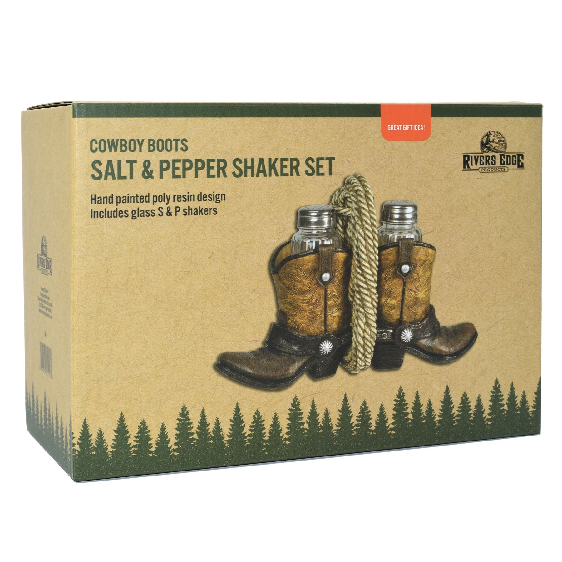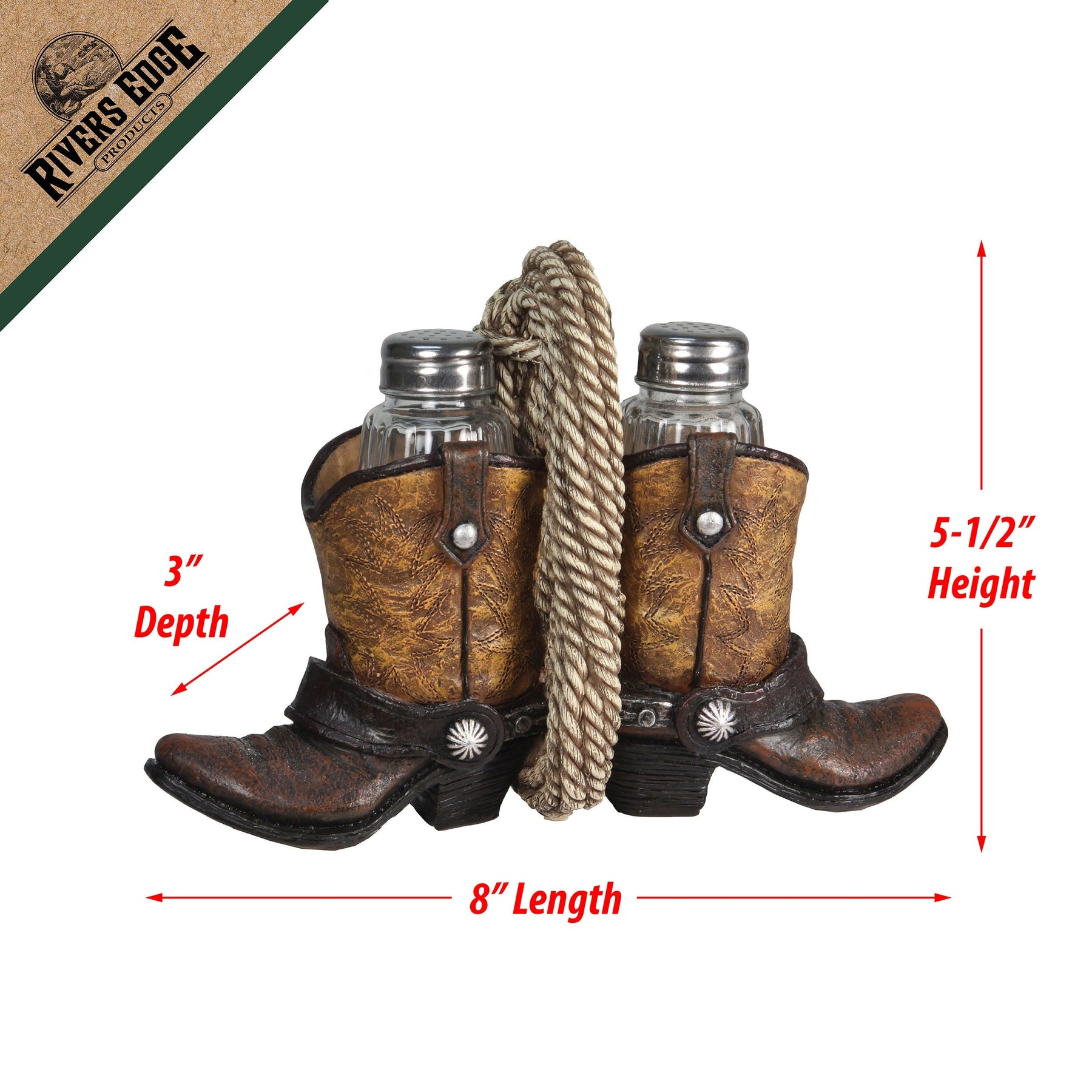 These cowboy boots salt and pepper shakers from Rivers Edge Products are sold as a matching pair and will be a welcome addition to your dining room table. These glass salt and pepper shakers fit nicely into each cowboy boot. The brown cowboy boots are hand-painted poly resin and are highly detailed with some rope in between each boot. The shakers are made of clear glass so you'll never mistake salt for pepper when you season your food. The Cowboy Boots salt and pepper shakers will allow you to season your meal with style.