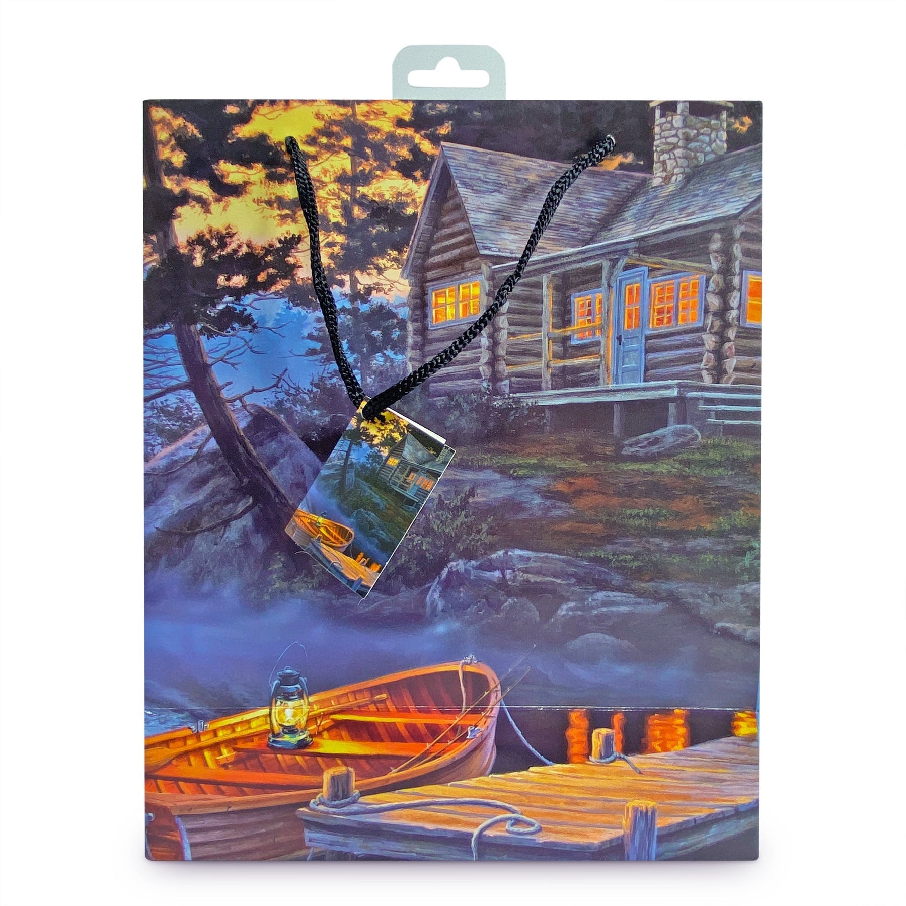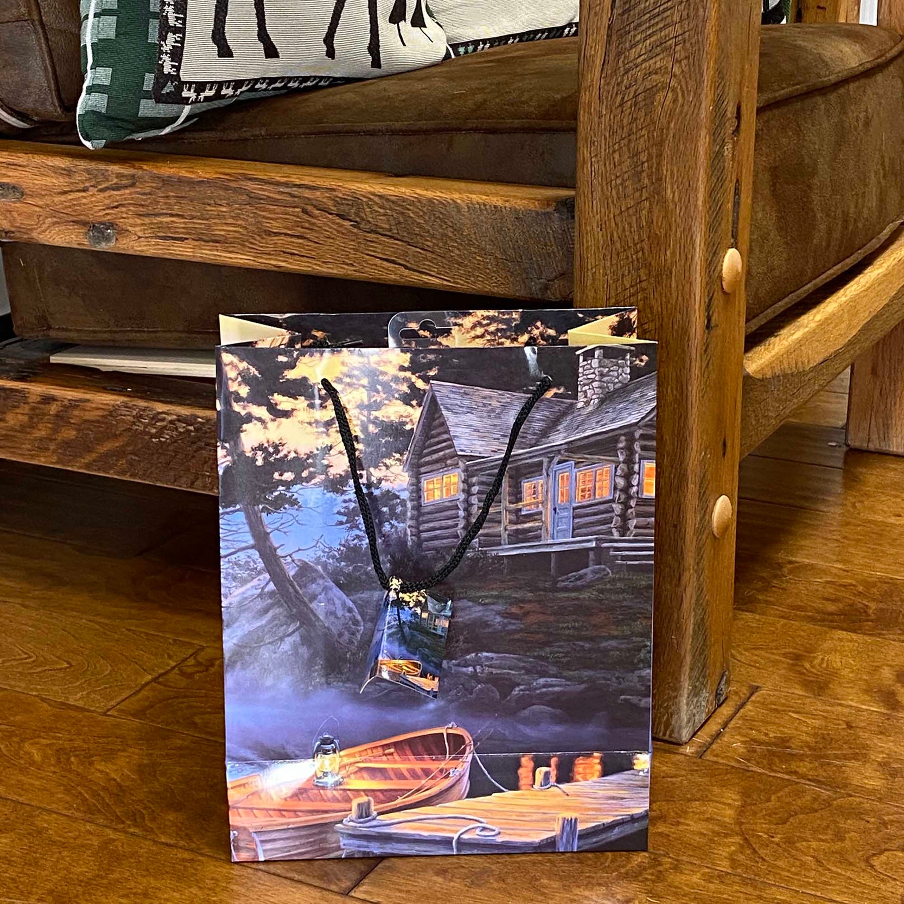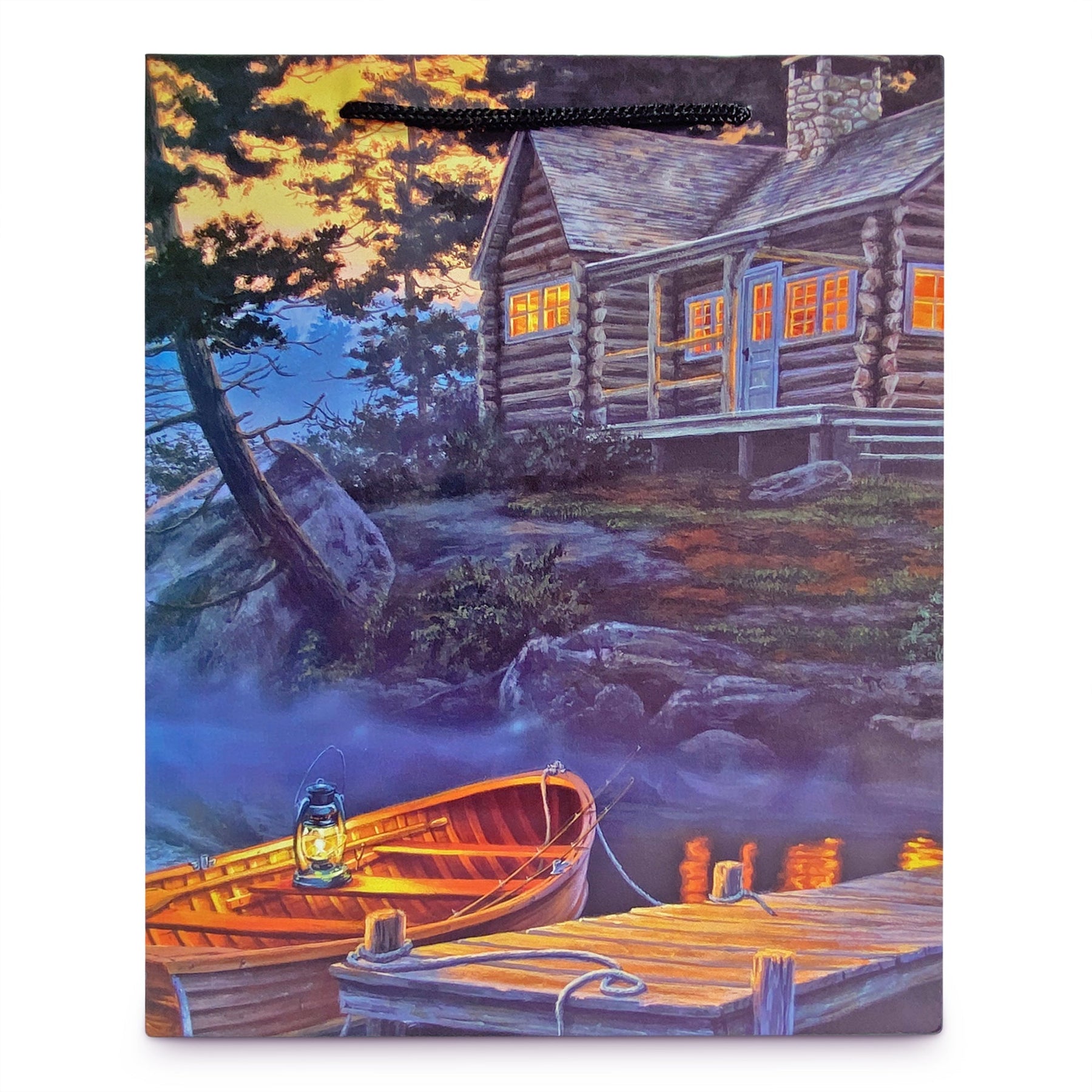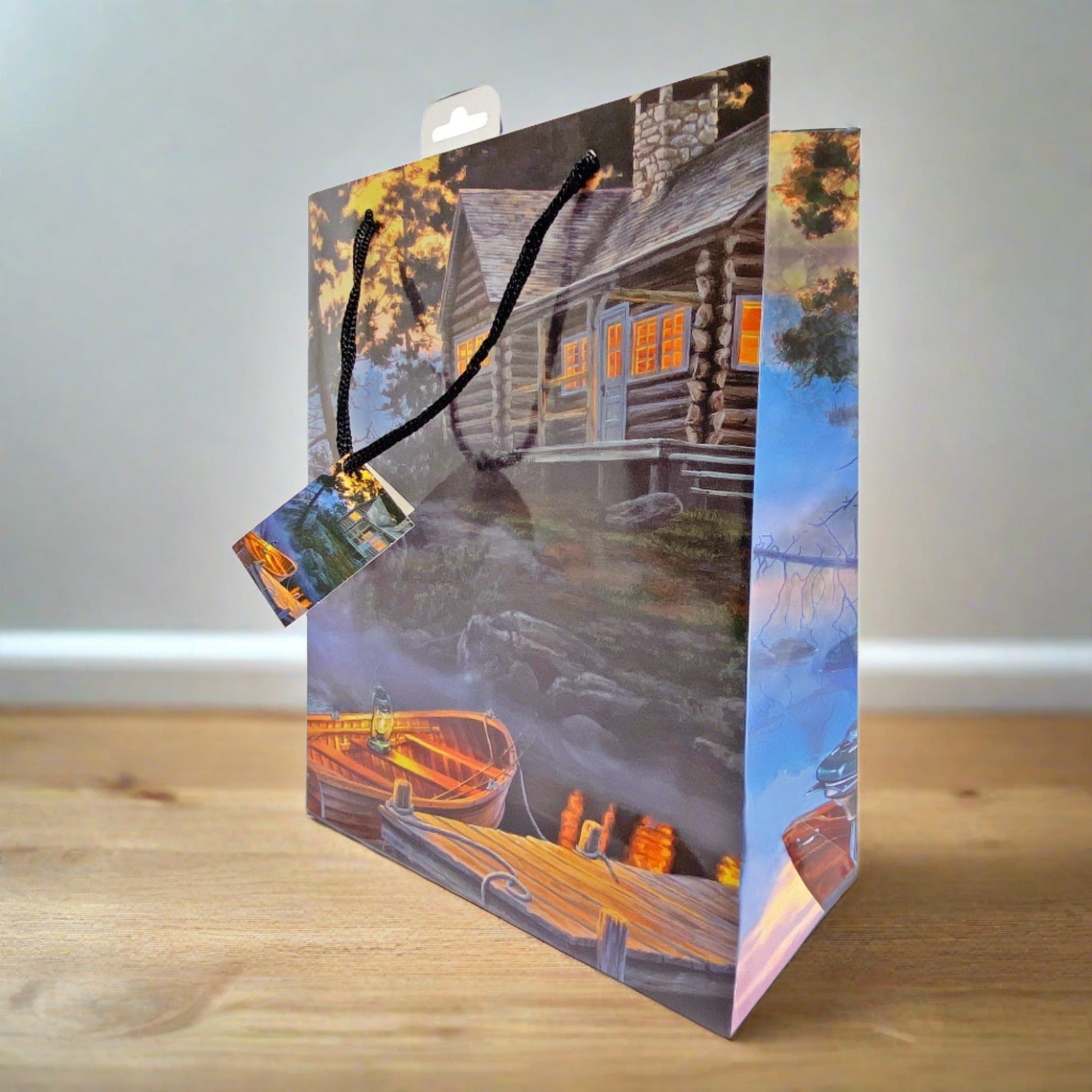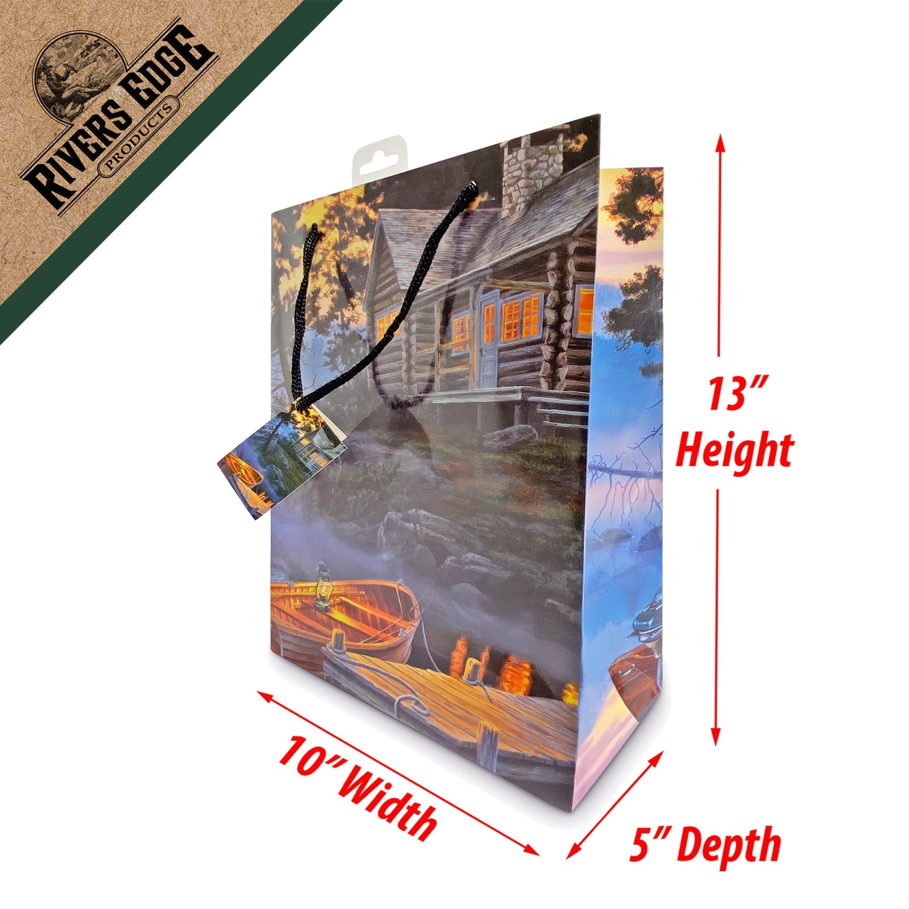 The Rivers Edge Products medium cabin morning mist gift bag features outstanding licensed artwork that showcase a beautiful morning sunrise over the water with a cozy cabin in the morning mist. The bag also features nylon handles, an attached card, and a removable hang tab for pegboard hanging. These gift bags measure 13-inches by 10-inches by 5-inches. Perfectly compliment any gift for an outdoor enthusiast with this gift bag.