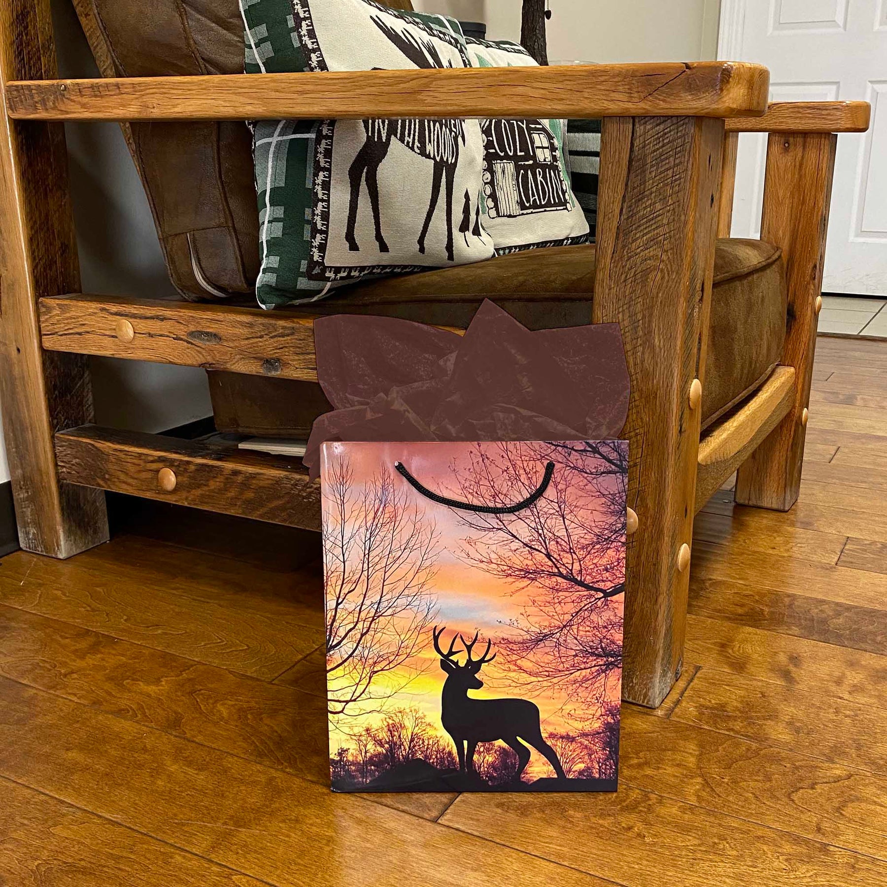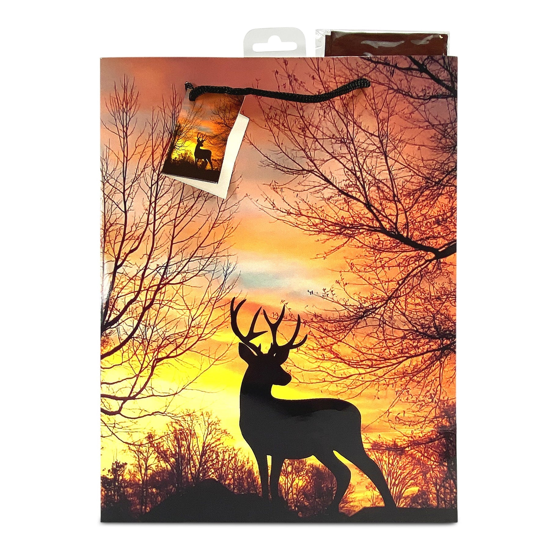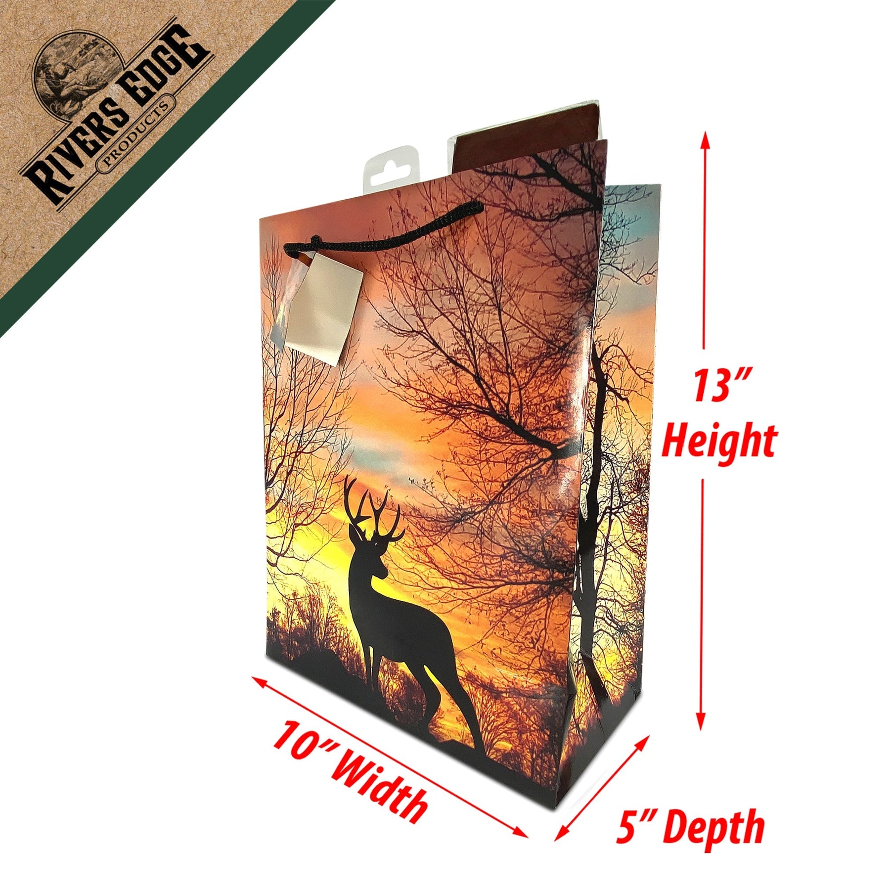 The Rivers Edge Products medium deer sunrise gift bag features outstanding licensed artwork that features a beautiful silhouette of a buck at sunrise. The bag also features nylon handles, an attached card, and a removable hang tab for pegboard hanging. These gift bags measure 13-inches by 10-inches by 5-inches. Perfectly compliment any gift for an outdoor enthusiast with this gift bag. Tissue packing paper is included with this gift bag. Priced each and sold by the dozen only.