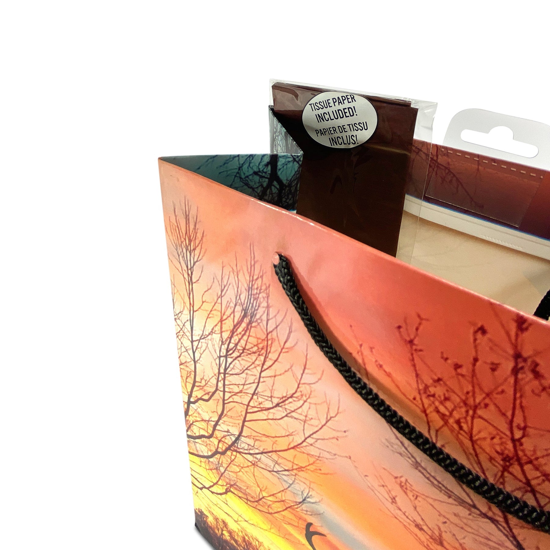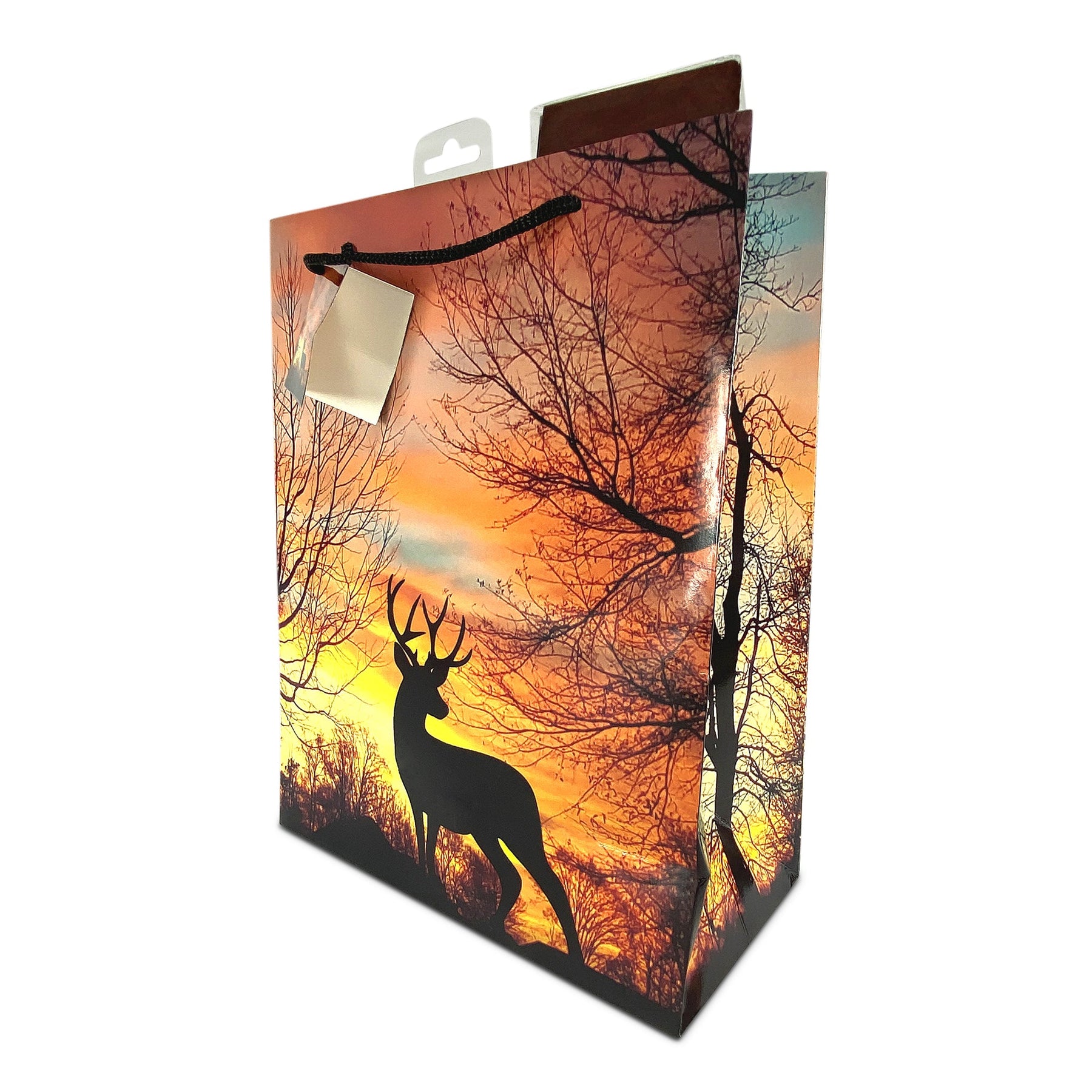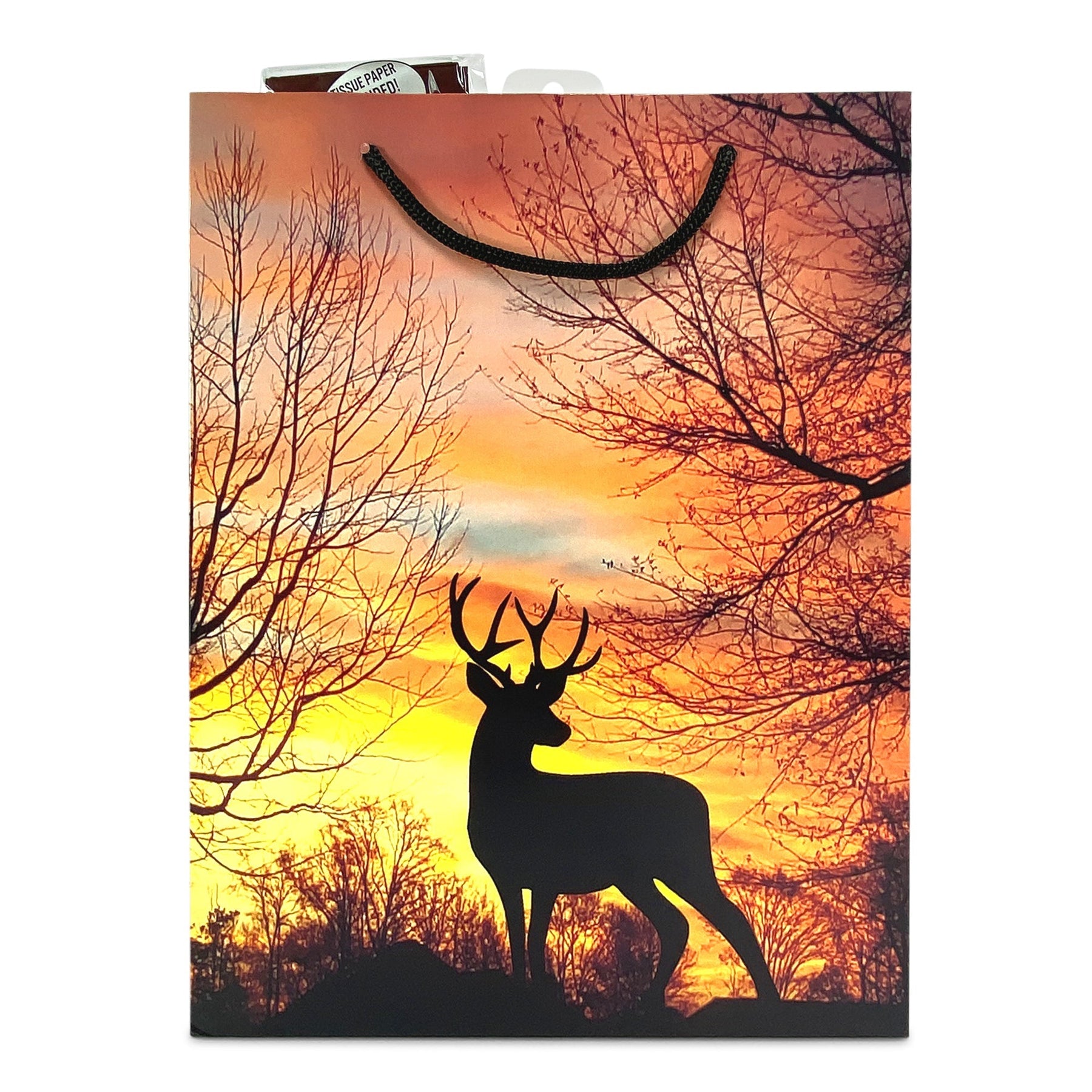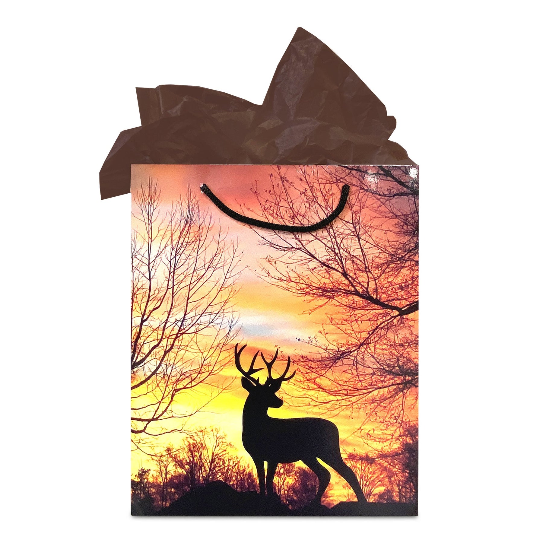 The Rivers Edge Products medium deer sunrise gift bag features outstanding licensed artwork that features a beautiful silhouette of a buck at sunrise. The bag also features nylon handles, an attached card, and a removable hang tab for pegboard hanging. These gift bags measure 13-inches by 10-inches by 5-inches. Perfectly compliment any gift for an outdoor enthusiast with this gift bag. Tissue packing paper is included with this gift bag. Priced each and sold by the dozen only.