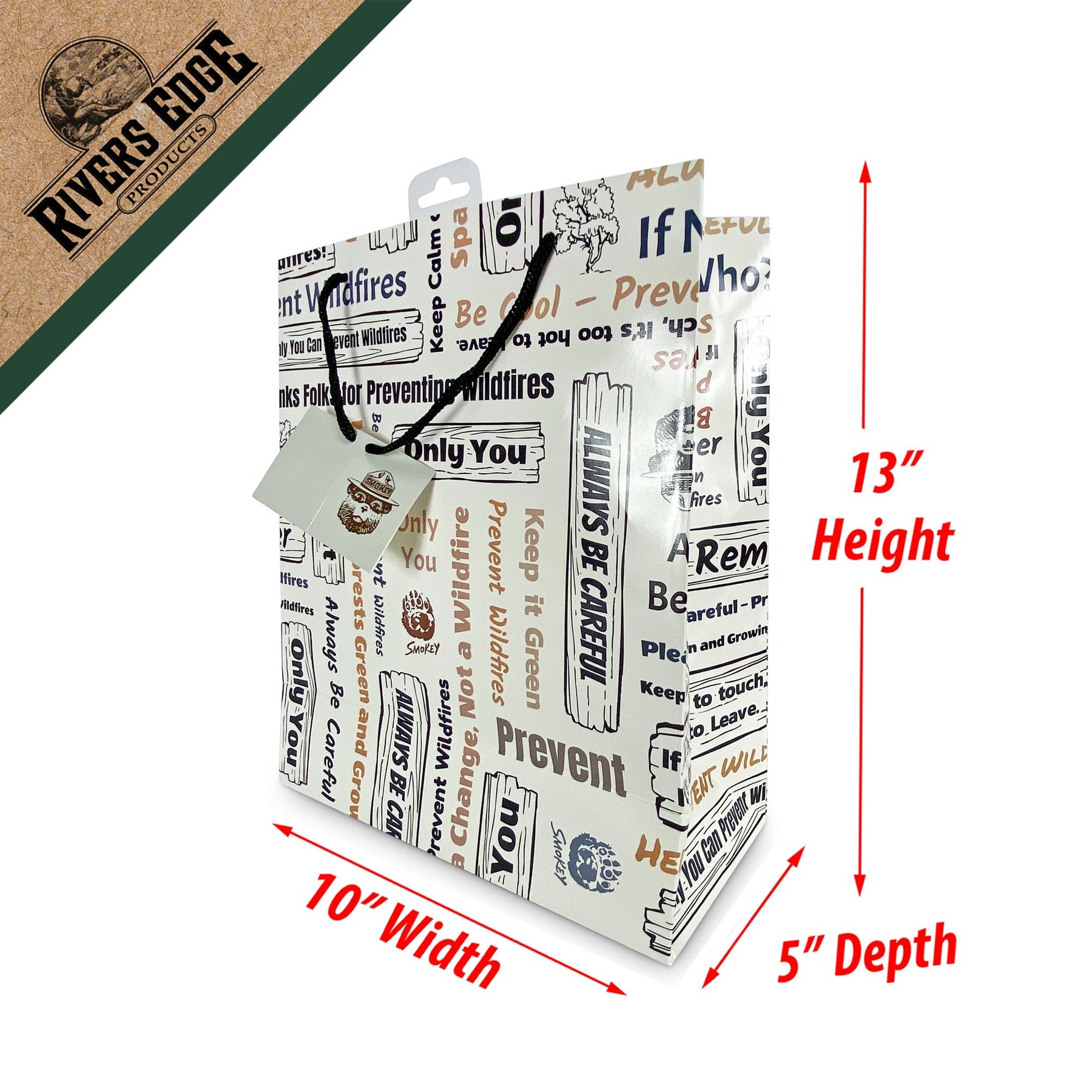 The River's Edge Products medium Smokey Bear head and prevention quotes gift bag features outstanding licensed artwork that showcases Smokey and a variety of his prevention quotes. The bag also features nylon handles, an attached card, and a removable hang tab for pegboard hanging. These gift bags measure 13-inches by 10-inches by 5-inches. Perfectly compliment any gift for an outdoor enthusiast with this gift bag.