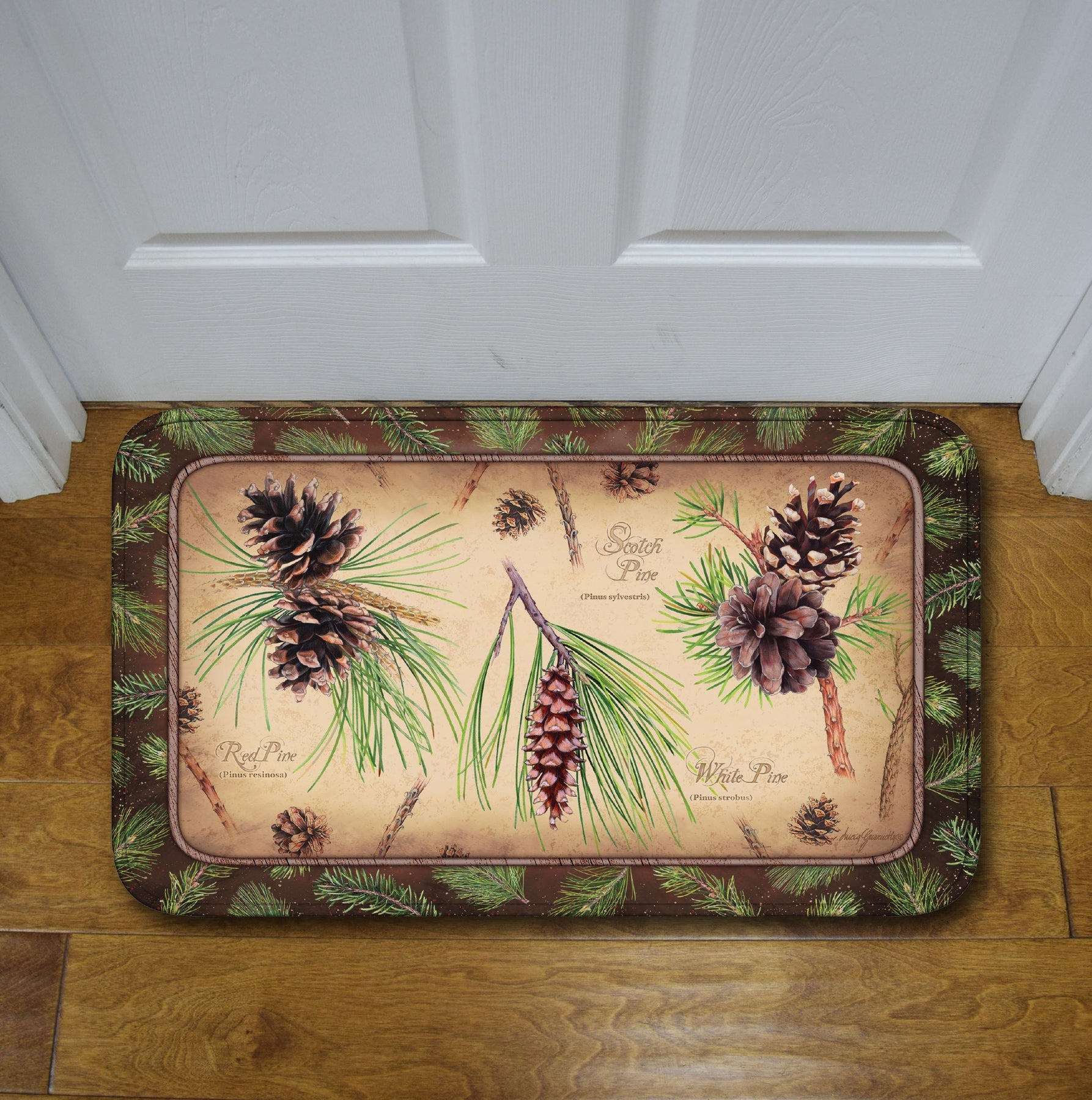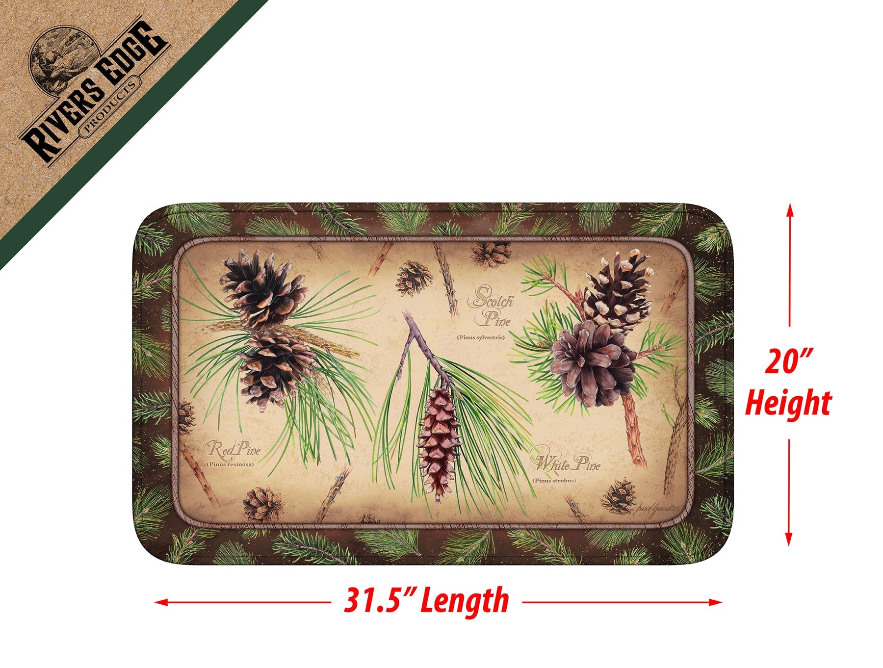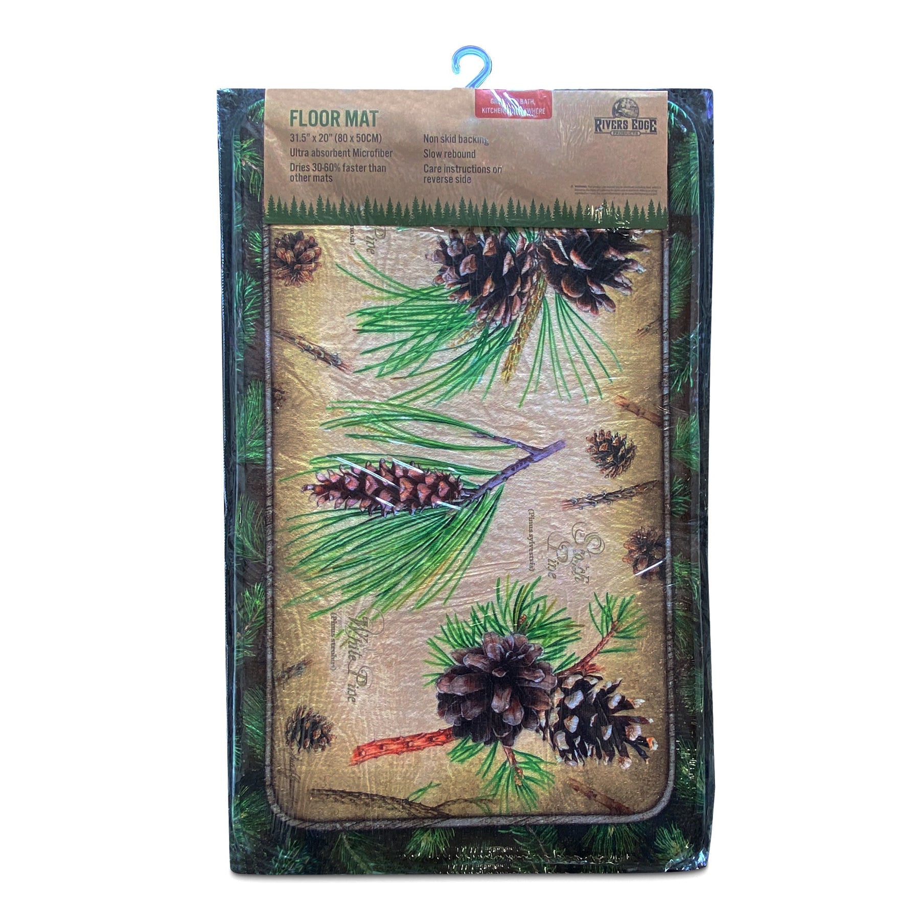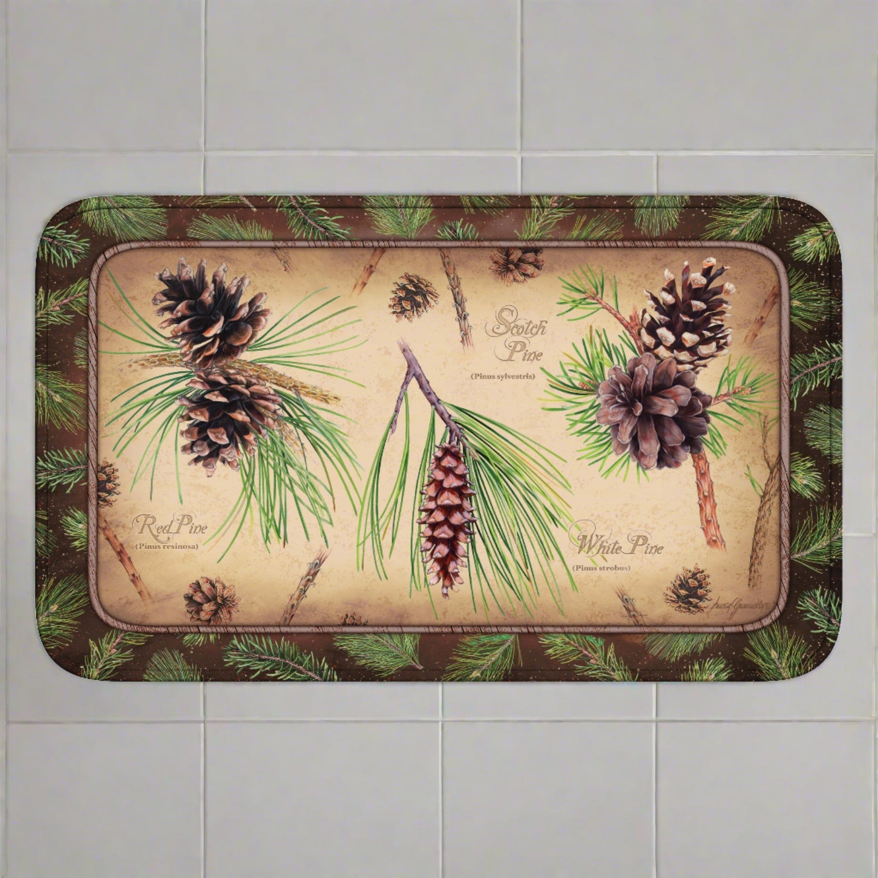 This memory foam mat from Rivers Edge Products showcases a variety of different pine cones and the pine trees they come from. Great addition to any bathroom or kitchen.