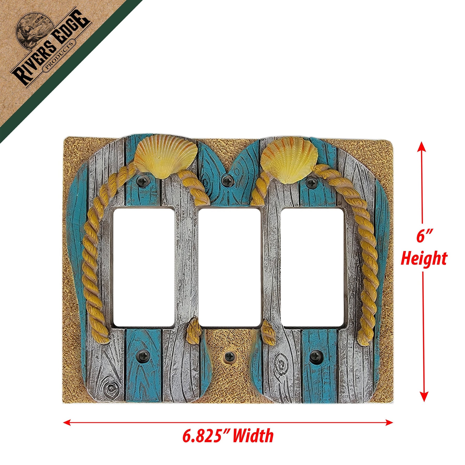 This triple switch decora plate cover from Rivers Edge Products is the ideal accent to complement beach-themed decor. Features a blue and white beach sandal with a scallop shell over a sand textured background. Match this with our other coastal beach themed wall plate covers to complete your seaside decor.