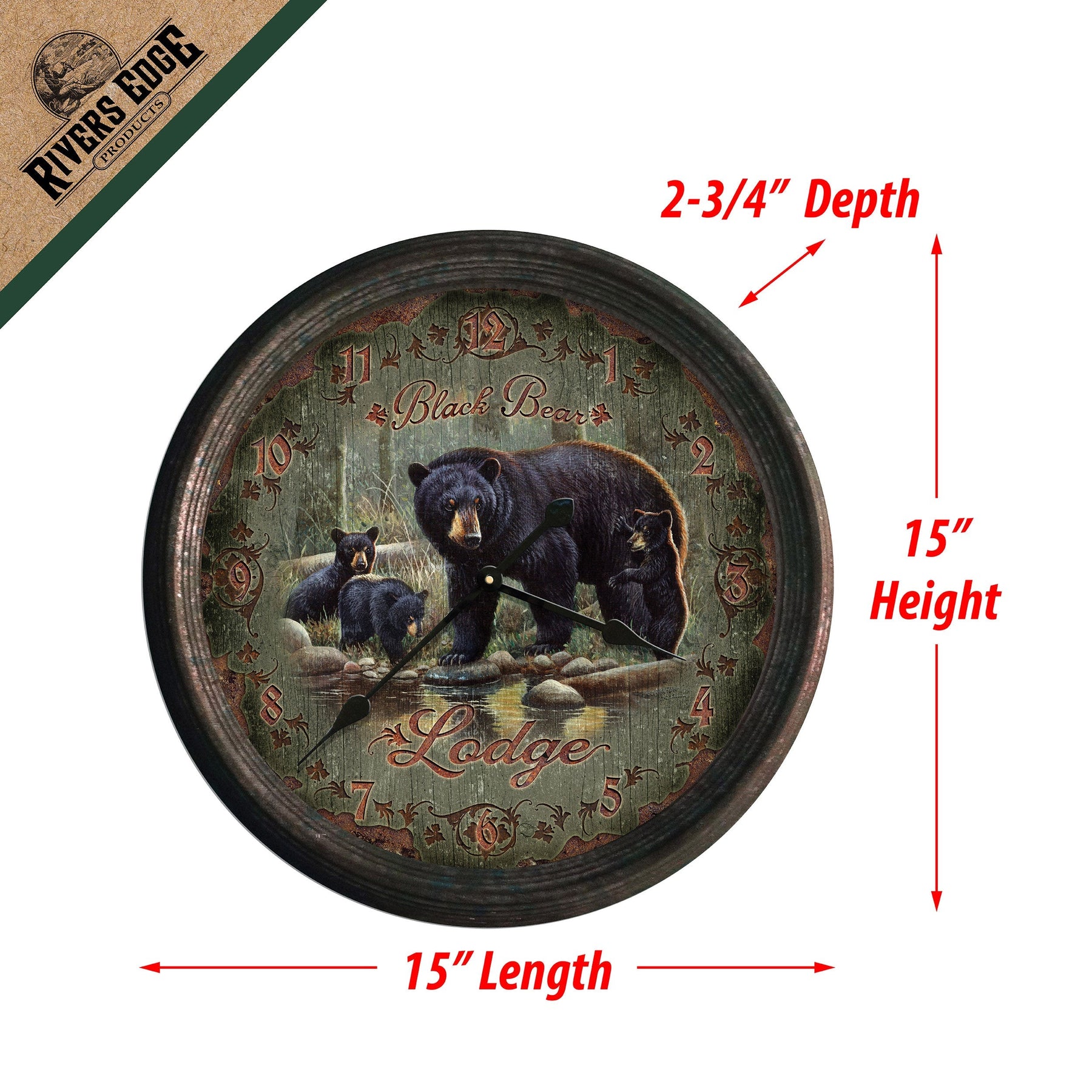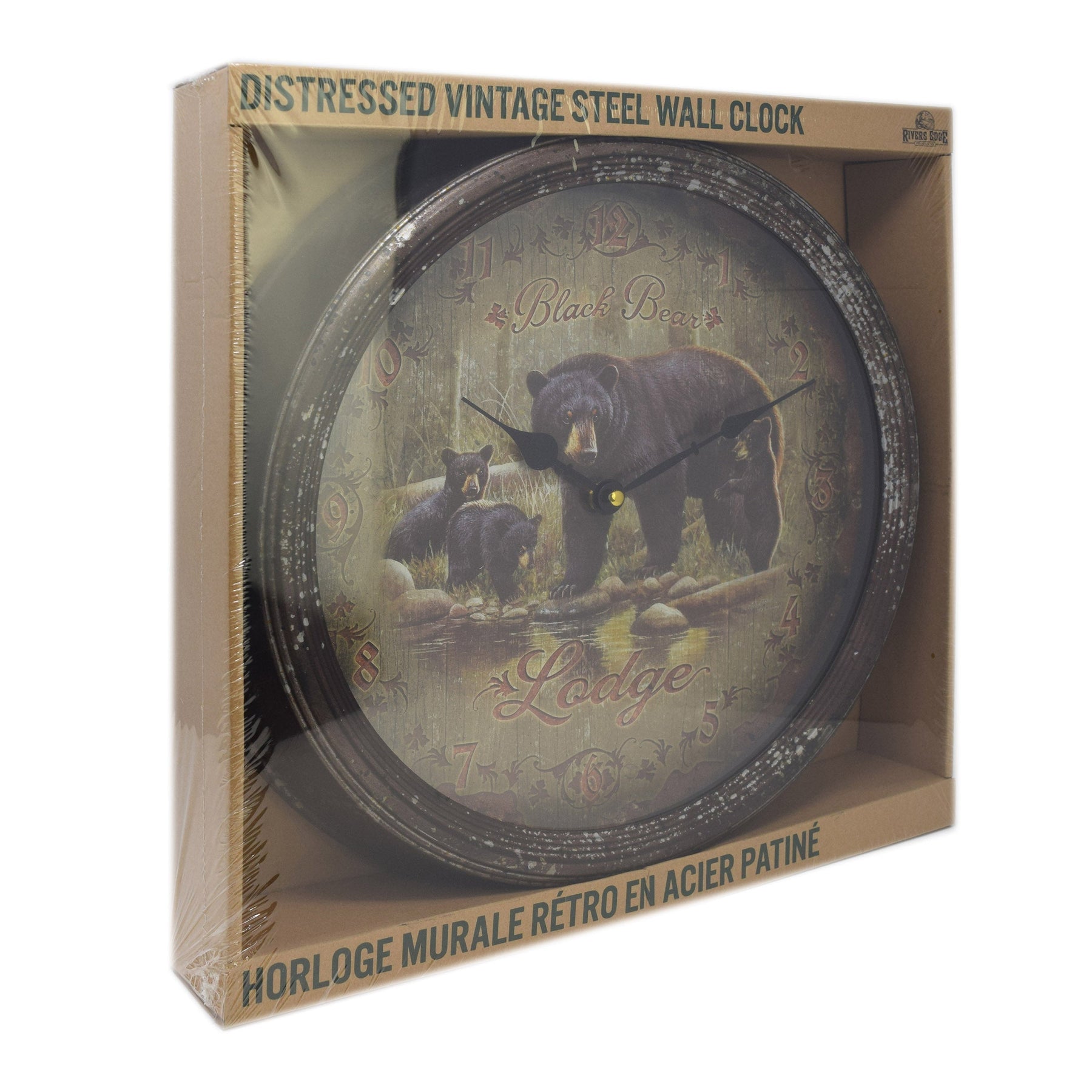 This round wall clock from River's Edge Products is designed with a distressed finish to embrace a cozy, outdoors theme. The clock face is covered with protective glass and features an illustration of a mama black bear and her three cubs with a green background. The rust colored numbers are easy to read and run along the clock face's decorative border.