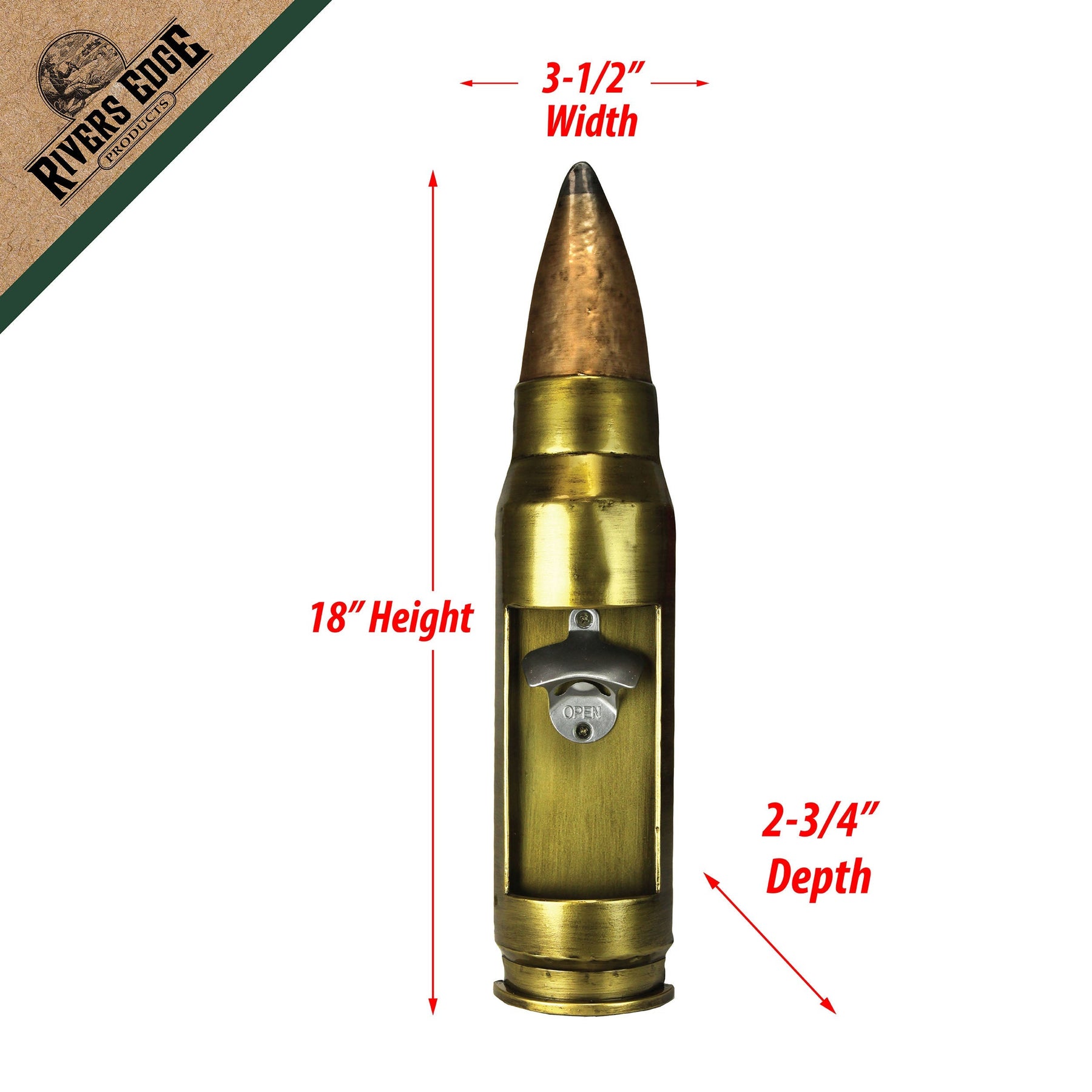 Add a unique touch to your bar or kitchen with this wall-mounted bottle opener, designed to resemble a replica of a rifle cartridge.